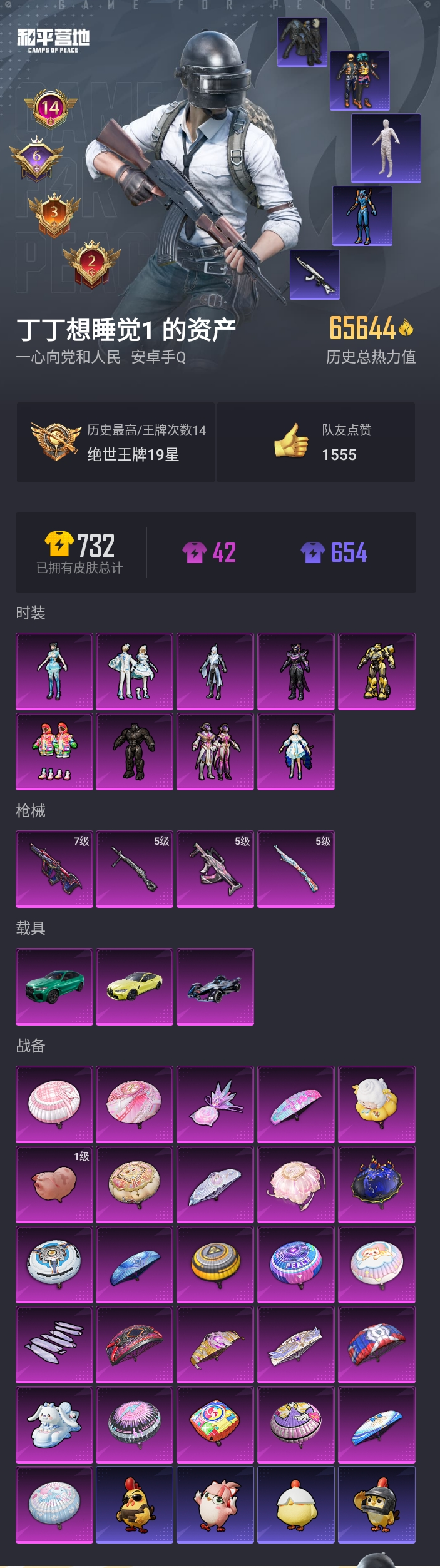 【和平精英】【lyhp21847】9粉装,4特效呛,3载具,历史最高段位:绝世王牌19星 王牌印记14次 热力值:65644,131套装,205呛械,246装备,125战备;套装:角色-洛天依,套装-银红美神,角色-大黄蜂,角色-猩猩队长,角色-星云暗核,套装-炫光之旅,角色-异瞳寒姬,角色-伏羲圣卦,套装-雪月幻音,套装-青年教官,套装-蓝色运动,套装-黑色伏地魔,套装-竞技名士,套装-深蓝色名流,套装-酒红色名流,套装-黄色名流,套装-猛禽,套装-长空猛禽,套装-漫步者,套装-海岛探路者,套装-旭日情侣,套装-冷焰舞者,套装-灼焰舞者,套装-都市猎人,套装-特战装甲,套装-浪漫假日,套装-战地督导,套装-鹰眼刺客,套装-冰冻风暴,套装-街头潮人,套装-魅力单车,套装-绮丽涂鸦,套装-耀眼新星,套装-坚韧舞者,套装-都市漫游者,套装-破晓战魂,套装-沙漠兵团,套装-幻世战舞者,套装-无烬之地,套装-绯红秘境,套装-清新柠檬,套装-弄潮海豚,套装-深海小丑鱼,套装-青涩时光,套装-缤纷果语,套装-龙魂突击队,套装-冰川特警,套装-麻辣教官,套装-沙暴袭击者,套装-冥河战士,套装-破蛋小黄鸡,套装-疯狂小兔子,套装-霓虹街区,套装-战术大师,套装-闪金天王,套装-耀粉歌者,套装-飞行日记,套装-热情海星,套装-纯真浪花,套装-暴风机械师,套装-ss19特训,套装-飞驰魅影,套装-音速流光,套装-ss20特训,套装-甜心亚梦,套装-虚音幻奏,套装-ss21特训,套装-萌趣咩咩,套装-娇憨猪猪,套装-ss22特训,套装-田园牧歌,套装-轻风白浪,套装-光之冒险,套装-绯格组合,角色-孙悟空,套装-神气柴柴,套装-王牌教练,套装-ss24特训,套装-冥星暗影,套装-龟仙人,套装-ss25特训,套装-惊鸿侠骨,套装-锦衣飞扬,套装-绝对偶像,套装-元气发射,套装-果汁能量,角色-2p战斗服款,套装-龙的传人,套装-冰河战士,套装-ss26特训,套装-快闪甜心,套装-春光漫游,套装-空岛之星,套装-无暇誓言,套装-贝斯之夜,套装-焰鹰斗篷,套装-幽夜迷踪,套装-幻羽潜行,套装-ss27特训,套装-老实芭蕉,套装-ss28特训,角色-mark.06,套装-街头风暴,套装-海盐绵绵冰,套装-湖畔霞光,角色-紫俏灵猫,套装-异域银装,套装-星途旅人,角色-临安公主,套装-ss31特训,套装-鱼渊荷华,套装-燕燕于飞,套装-紫幽梦,套装-粉恋花,套装-ss33特训,套装-ss32特训,套装-蓝冰羽,套装-狂鲨锋刃,套装-大橘大利,套装-星渊小夜曲,套装-元气之梦,套装-ss34特训,套装-擎苍青焰,套装-朱霞炽焰,套装-凌霄紫焰,套装-ss35特训,角色-超感刻度,角色-甜心蒙太奇,套装-ss36特训,套装-雪国风尚,套装-萌鸡速递;呛皮:akm-灼热熔岩,akm-影袭,akm-破晓战魂,akm-霓虹街区,akm-涂鸦街区,akm-彩虹符号,akm-2p战斗服款,akm-龙的传人,akm-霓彩脉冲,m762-绯红前夜,m762-风花雪月,m762-天降萌叽,蜜獾-娇憨猪猪,蜜獾-天降萌叽,蜜獾-乌木金纹,m416-绯红前夜,m416-黄金狮王,m416-紫翼圣骑,m416-糯团青竹,7级aug-星之彼岸,aug-耀粉歌者,aug-纯梦嫁纱,aug-异域银装,aug-绝对恒星,aug-冰晶雪宝,aug-紫晶流影,5级groza-镜光银凌,groza-影袭,groza-田园牧歌,groza-懵萌河马,groza-紫矿核心,q-飞驰魅影,q-纯真浪花,m16a4-冥河战士,m16a4-甜心亚梦,m16a4-幻世战舞者,m16a4-冰河战士,ac-val-甜心亚梦,ac-val-乌木金纹,ac-val-天降萌叽,ac-val-快闪甜心,famas-突变脉冲,famas-霓彩脉冲,famas-乌木金纹,scar-l-红色方程式,scar-l-夜灯,scar-l-炫彩节奏,scar-l-玉兔迎春,scar-l-星途旅人,scar-l-海盐豹豹,mk47-乌木金纹,g36c-懵萌河马,arx-凌霄紫焰,m200-惊鸿侠骨,m200-乌木金纹,5级kar98k-巳巳如意,kar98k-影袭,kar98k-彩虹符号,kar98k-飞驰魅影,kar98k-2b战斗服款,m24-影袭,m24-炫彩节奏,m24-乌木金纹,awm-天降萌叽,awm-焰鹰斗篷,awm-纯真浪花,awm-盛世惊鸿,莫辛纳甘-乌木金纹,莫辛纳甘-懵萌河马,amr-超新星,amr-乌木金纹,win94-乌木金纹,mk12-乌木金纹,mk14-乌木金纹,mk14-冰河战士,mk14-紫幽梦,mk14-薄荷星砂,mini14-穿刺龙虾,mini14-香桃花海,vss-田园牧歌,vss-香桃花海,mk20-h-快闪甜心,mk20-h-星途旅人,mk20-h-狂鲨锋刃,mk20-h-乌木金纹,sks-炫彩节奏,slr-娇憨猪猪,m417-惊鸿侠骨,uzi-红色方程式,uzi-影袭,uzi-娇憨猪猪,uzi-天降萌叽,uzi-冰河战士,uzi-啾咪啾咪,uzi-炫彩糖果,uzi-绿洲时空,vect-风花雪月,vect-田园牧歌,vect-焰鹰斗篷,vect-燕燕于飞,汤姆逊-耀粉歌者,汤姆逊-梦之光华,汤姆逊-天降萌叽,汤姆逊-纯真浪花,p90-飞驰魅影,p90-快闪甜心,p90-玩趣呆呆,p90-乌木金纹,ump45-夜灯,ump45-蓝色火焰,ump45-生命誓言,ump45-时空追击者,ump45-炫光之旅,ump45-海盐豹豹,野牛-沙丘之主,野牛-燕燕于飞,mp5k-乌木金纹,aks-74u-乌木金纹,js9-凌霄紫焰,s1897-飞驰魅影,s1897-紫幽梦,s1897-糯团青竹,spas-12-田园牧歌,spas-12-燕燕于飞,spas-12-狂鲨锋刃,spas-12-乌木金纹,dbs-甜心亚梦,dbs-歌者泠鸢,dbs-彩虹符号,dbs-焰鹰斗篷,dbs-乌木金纹,s12k-破晓战魂,s12k-夜灯,s12k-娇憨猪猪,s12k-幻世战舞者,s12k-玩趣呆呆,s12k-霓彩脉冲,s686-橘柚倾心,aa12-g-炫光之旅,aa12-g-萌物绒绒,aa12-g-纯真浪花,5级dp-28-豹影疾电,dp-28-彩虹符号,dp-28-橘柚倾心,dp-28-甜心亚梦,dp-28-甜蜜旋律,dp-28-焰鹰斗篷,m249-星之彼岸,m249-彩虹符号,m249-糯团青竹,m249-沙丘之主,m249-冰晶雪宝,pkm-懵萌河马,pkm-啾咪啾咪,pkm-紫幽梦,mg3-幻世战舞者,mg3-乌木金纹,mg3-惊鸿侠骨,mg3-霓彩脉冲,mg-36-凌霄紫焰,p92-紫幽梦,p92-凌霄紫焰,蝎式手呛-闲梦青缨,蝎式手呛-燕燕于飞,沙墨之鹦-旋转彩虹,沙墨之鹦-快闪甜心,短管霰弹2b战斗服款,短管霰弹-星穹咏叹调,r1895-绊爱,撬棍-冥河战士,撬棍-幻世战舞者,撬棍-火尖呛,平底锅-飞