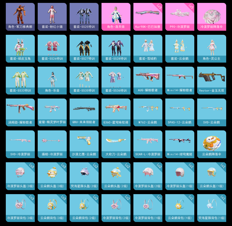 【和平精英】【lyhp21879】1粉装,3特效呛,0载具,历史最高段位:荣耀皇冠ⅰ 王牌印记-1次 热力值:15576,43套装,60呛械,60装备,29战备;套装:角色-洛天依,套装-黄色运动,套装-白色伏地魔,套装-黑色伏地魔,套装-深蓝色名流,套装-湖蓝色名流,套装-长空猛禽,套装-魅力单车,套装-破晓战魂,套装-森林游猎者,套装-缤纷果语,套装-滨海厨神,套装-龙魂突击队,套装-元素星魂,套装-粉红小猪,套装-破蛋小黄鸡,套装-霓虹街区,套装-顽皮玉兔,套装-战术大师,角色-军刀雅典娜,套装-柠萌假日,套装-龟仙人,套装-ss25特训,套装-ss26特训,套装-空岛之星,套装-ss27特训,套装-老实芭蕉,套装-ss28特训,套装-海盐绵绵冰,套装-ss31特训,套装-ss33特训,套装-云朵鹅,套装-雪绒豹,套装-大橘大利,角色-灵公主,角色-乐音,套装-元气之梦,套装-ss34特训,套装-薄荷星砂,套装-ss35特训,套装-ss37特训,套装-ss36特训,套装-萌鸡速递;呛皮:蜜獾-天降萌叽,蜜獾-精灵梦叶罗丽,ace32-冰晶雪宝,m762-天降萌叽,m762-云朵鹅,scar-l-红色方程式,scar-l-炫彩节奏,scar-l-海盐豹豹,scar-l-冷漠罗丽,m416-蓝色火焰,m416-糯团青竹,aug-耀粉歌者,aug-天降萌叽,aug-异域银装,q-彩虹符号,akm-破晓战魂,akm-涂鸦街区,akm-绿洲时空,famas-霓彩脉冲,famas-乌木金纹,g36c-星穹咏叹调,amr-鸡智如我,amr-乌木金纹,3级kar98k-巳巳如意,svd-冷漠罗丽,svd-云朵鹅,svd-霓彩脉冲,m200-乌木金纹,win94-乌木金纹,awm-天降萌叽,mk14-薄荷星砂,qbu-未来领航者,mini14-耀粉歌者,mini14-绯穹魔姬,aks-74u-鸡智如我,aks-74u-乌木金纹,5级p90-冷漠罗丽,p90-乌木金纹,uzi-天降萌叽,uzi-啾咪啾咪,mp5k-乌木金纹,汤姆逊-耀粉歌者,vect-金玉无双,s686-生命誓言,spas-12-云朵鹅,s1897-炫彩节奏,dbs-乌木金纹,m249-彩虹符号,m249-无面战甲,mg-36-薄荷星砂,5级dp-28-豹影疾电,沙墨之鹦-云朵鹅,p1911-无面战甲,平底锅-空岛之星,大砍刀-云朵鹅,撬棍-冷漠罗丽,盐雾蛋-冰氧夏日,铝热弹-炫彩糖果,破片手留单-呆爆全场,破片手留单-拽到爆炸;降落伞:炫彩糖果飞行器,空岛之星尾迹; 详情看图1粉装3特效呛 洛天依 5级p90冷漠罗丽