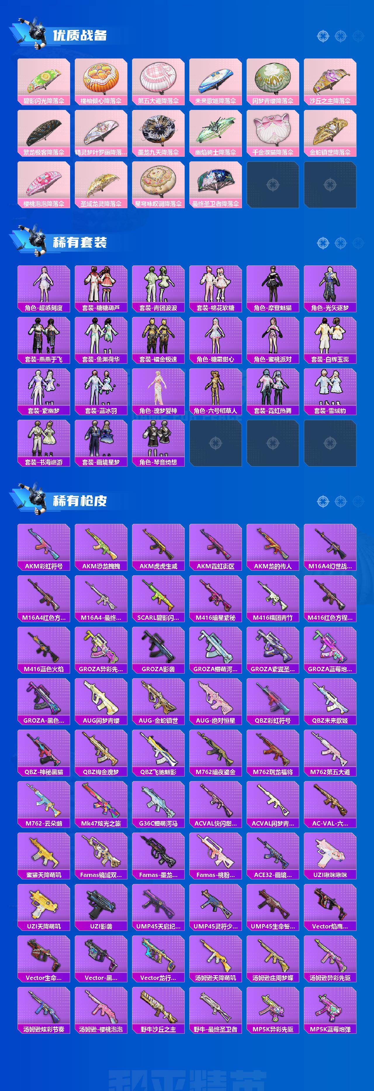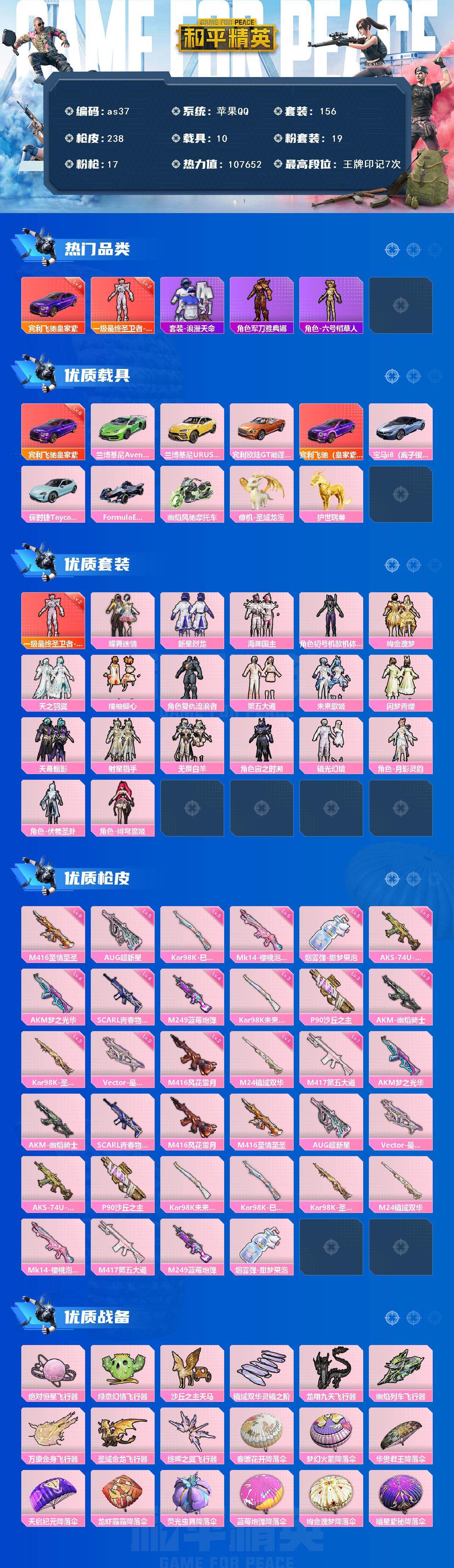苹果 手q-1神装-19粉装-17特效呛-10载具-9粉色飞行器-107652热力值-7王牌印记-156套装-238呛皮 【红色载具】:宾利飞驰(皇家紫)六级 【红色神装等级】:最终圣卫者-帕修斯二级 【红色角色神装】:最终圣卫者-帕修斯 【热门品类】:套装-浪漫天命,角色-军刀雅典娜,角色-六号稻草人 【粉色套装】:粉装-蝶舞迷情,粉装-新星烈龙,粉装-海渊国主,角色-初号机款机体服