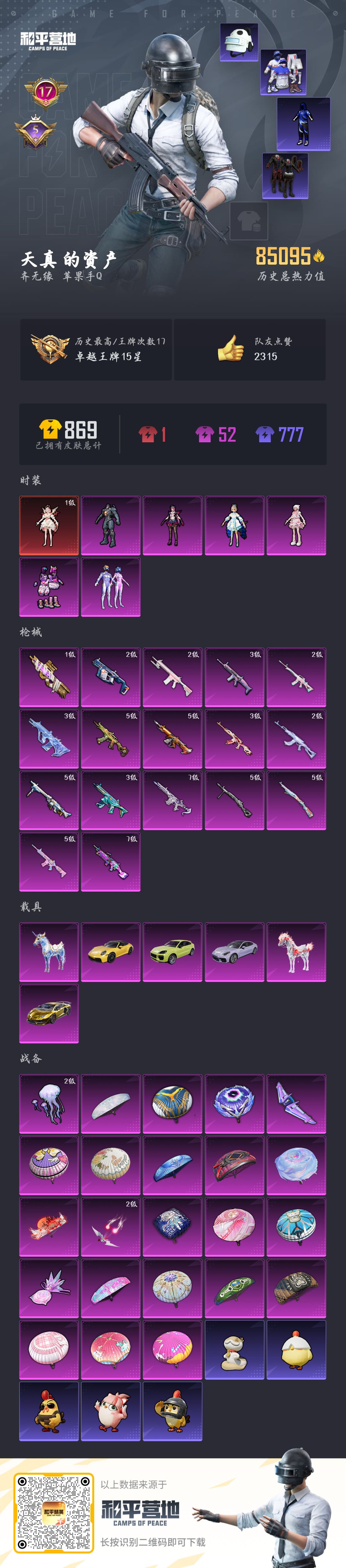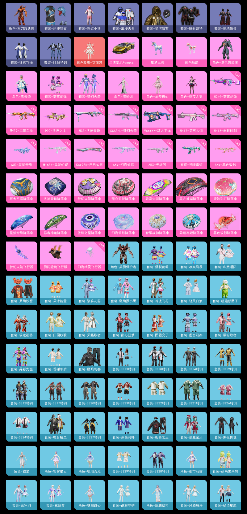 【和平精英】【txhp7051】6粉装,17特效呛,6载具,历史最高段位:卓越王牌15星 王牌印记17次 热力值:85095,180套装,228呛械,296装备,139战备;套装:暮色玫影-艾丽娅,套装-梦幻火箭,角色-洛天依,套装-蓝莓炮弹,角色-复仇流浪者,角色-羊梦糖心,角色-罪夜之冕,套装-特训学院,套装-猎鹰,套装-青年教官,套装-橘黑制服,套装-红色运动,套装-黄色运动,套装-蓝色运动,套装-黄色伏地魔,套装-白色伏地魔,套装-黑色伏地魔,套装-竞技名士,套装-深蓝色名流,套装-酒红色名流,套装-湖蓝色名流,套装-黄色名流,套装-猛禽,套装-长空猛禽,套装-海岛探路者,套装-冷焰舞者,套装-灼焰舞者,套装-浪漫天命,套装-特战装甲,套装-战地督导,套装-特殊使命,套装-街舞之王,套装-滨海假日,套装-沙漠毒蛇,套装-鹰眼刺客,套装-完美偶像,套装-人气偶像,套装-幻影武者,套装-街头潮人,套装-蓝彩潮人,套装-魅力单车,套装-绮丽涂鸦,套装-坚韧舞者,套装-竞技达人朋克,套装-野性战心,套装-狂沙舞者,套装-破晓战魂,套装-都市魅力,套装-热血青春,套装-沙漠兵团,套装-极地朋克,套装-幻世战舞者,套装-清新柠檬,套装-血色贵族,套装-暗影哥特,套装-迅捷狂鲨,套装-呆萌铁蟹,套装-夏日倾情,套装-甜蜜熊情侣,套装-青涩时光,套装-龙魂突击队,套装-风暴特警,套装-冰川特警,套装-星河浪客,套装-元素星魂,套装-极速红龙,套装-麻辣教官,套装-梦魇先生,套装-恶魔宝贝,套装-黑夜传说,套装-粉红小猪,套装-破蛋小黄鸡,套装-疯狂小兔子,套装-淡雅花蕊,套装-玲珑飞花,套装-鹤鸣,套装-霓虹街区,套装-激萌罗小黑,套装-萌黄之夏,套装-夏日音浪,套装-探宝勇士,套装-牛气满满,套装-白糯汤圆,套装-萌趣颜团子,套装-战术大师,套装-ss12特训,套装-牛气冲天,套装-ss18特训,套装-耀粉歌者,套装-飞行日记,套装-ss13特训,套装-ss14特训,套装-天籁歌者,套装-电音精灵,角色-英勇保护者,套装-ss17特训,套装-瑞龙福将,套装-团圆交子,套装-冰爽风暴,套装-爆裂葡萄,套装-福星高照,套装-虎虎生威吉莉,角色-军刀雅典娜,套装-异彩先驱,套装-霓虹极客,套装-空投萌叽,套装-ss19特训,套装-tt战队服,套装-炫蓝之夏,套装-ss20特训,套装-甜心亚梦,套装-虚音幻奏,套装-ss21特训,套装-玉兔迎春,套装-ss22特训,套装-和煦暖阳,套装-田园牧歌,套装-轻风白浪,套装-光之冒险,套装-绯格组合,套装-ss23特训,套装-莱茵河畔,套装-香榭午后,套装-王牌教练,套装-柠萌假日,套装-青玉碎影,套装-ss24特训,套装-龟仙人,套装-涂山之恋,套装-ss25特训,套装-惊鸿侠骨,套装-锦衣飞扬,套装-果汁能量,套装-龙的传人,套装-ss26特训,套装-空岛之星,套装-ss27特训,套装-恋语绒绒,套装-老实芭蕉,套装-ss28特训,角色-极地流光,角色-粉雾星云,角色-银尘,套装-街头风暴,套装-海盐绵绵冰,套装-ss29特训,角色-绯色魅影,角色-紫俏灵猫,角色-都市丽猫,角色-糖霜甜心,套装-ss30特训,套装-萌萌史莱姆,套装-ss31特训,角色-海琴烟,套装-紫幽梦,套装-晶辉守护,套装-ss32特训,套装-青翼流星,套装-蓝冰羽,套装-狂鲨锋刃,角色-幽澜祭司,套装-炫彩糖果,套装-松绒汪汪,套装-ss34特训,套装-ss35特训,套装-午间小调,套装-秘语星愿,套装-风迹短诗,套装-琴音绮想,套装-粉黛兰香,套装-画境星梦,套装-书海巡游,套装-阳光菠萝,套装-ss37特训,套装-ss36特训,套装-红釉青花,套装-雪国风尚,套装-雨过天青,套装-萌鸡速递,套装-钻光豹影;呛皮:2级akm-幻海仙踪,3级akm-暮色玫影,akm-夜灯,akm-彩虹符号,akm-萌趣颜团子,akm-虎虎生威,akm-海渊国主,akm-环太平洋,akm-龙的传人,akm-极光猎影,akm-霓彩脉冲,famas-霓彩脉冲,2级m16a4-晶梦幻蝶,m16a4-蓝色火焰,m16a4-红色方程式,m16a4-甜心亚梦,m16a4-幻世战舞者,m16a4-冰河战士,m16a4-雨过天青,5级m416-至情至圣,5级m416-电玩时刻,m416-夜灯,m416-蓝色火焰,m416-绯红前夜,m416-红色方程式,m416-糯团青竹,m416-萌萌史莱姆,3级aug-星梦奇缘,aug-耀粉歌者,aug-天降萌叽,aug-2p战斗服款,aug-松绒汪汪,groza-蓝莓炮弹,groza-异彩先驱,groza-田园牧歌,groza-2b战斗服款,groza-海盐豹豹,groza-暮色玫影,3级scar-l-梦幻火箭,scar-l-红色方程式,scar-l-夜灯,scar-l-炫彩节奏,scar-l-彩虹符号,scar-l-玉兔迎春,scar-l-海盐豹豹,mk47-洛神天依,mk47-乌木金纹,mk47-幻海仙踪,mk47-风迹短诗,ac-val-甜心亚梦,ac-val-乌木金纹,ac-val-天降萌叽,ac-val-钻光豹影,3级蜜獾-异瞳寒姬,蜜獾-天降萌叽,蜜獾-风迹短诗,蜜獾-冰澜龙吟,蜜獾-乌木金纹,7级arx-无垠阁,m762-瑞龙福将,m762-彩虹符号,m762-天降萌叽,q-洛神天依,g36c-乌木金纹,ace32-画境星梦,ace32-冰晶雪宝,m200-惊鸿侠骨,m200-钻光豹影,m200-乌木金纹,莫辛纳甘-乌木金纹,莫辛纳甘-风迹短诗,win94-瑞龙福将,win94-乌木金纹,awm-暮色玫影,awm-乌木金纹,awm-绿洲时空,amr-雨过天青,amr-乌木金纹,svd-霓彩脉冲,5级kar98k-巳巳如意,kar98k-梦幻火箭,kar98k-炫彩节奏,kar98k-洛神天依,kar98k-蓝莓炮弹,m24-影袭,m24-炫彩节奏,m24-乌木金纹,2级m417-第五大道,m417-惊鸿侠骨,sks-夜灯,sks-糯团青竹,mini14-春暖花开,mini14-梦幻火箭,mini14-异彩先驱,mini14-涂山之恋,vss-星之彼岸,vss-田园牧歌,vss-彩虹符号,vss-香桃花海,mk14-乌木金纹,mk14-紫幽梦,mk14-阳光菠萝,mk14-紫晶流影,slr-彩虹符号,slr-霓彩脉冲,slr-乌木金纹,mk12-风迹短诗,mk12-乌木金纹,mk20-h-星梦奇缘,mk20-h-樱桃泡泡,mk20-h-狂鲨锋刃,mk20-h-乌木金纹,m1加兰德-画境星梦,野牛-松绒汪汪,野牛-乌木金纹,mp5k-蓝莓炮弹,mp5k-异彩先驱,mp5k-飒粉甜心,mp5k-画