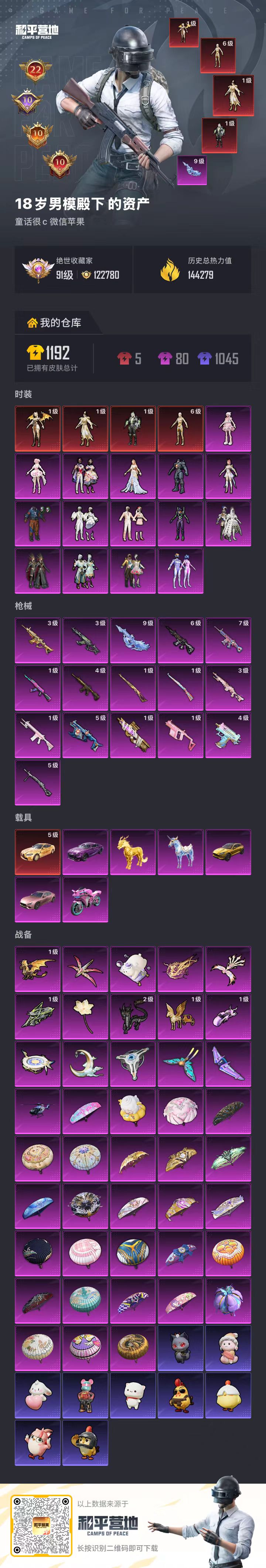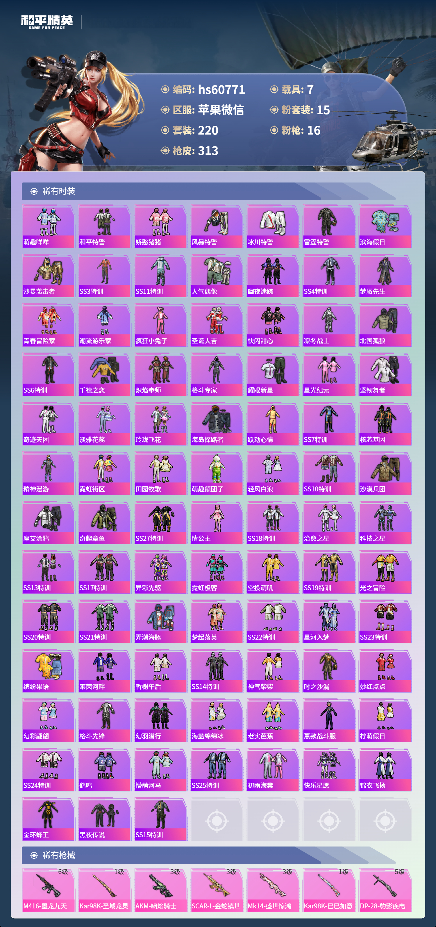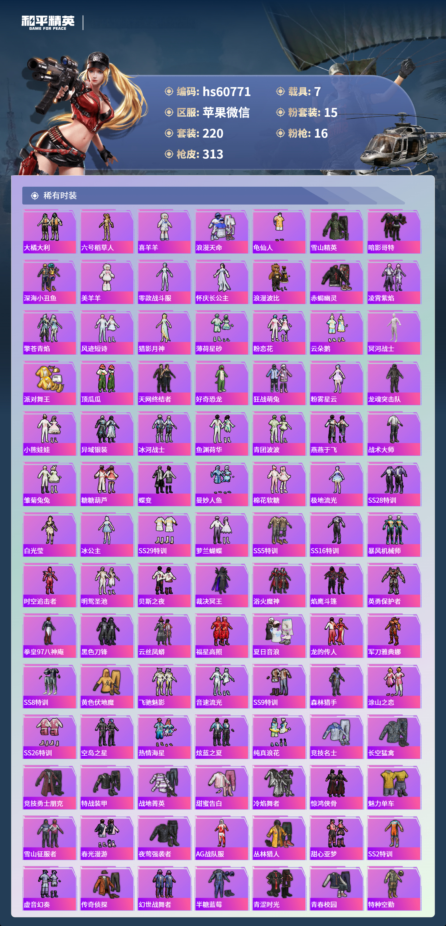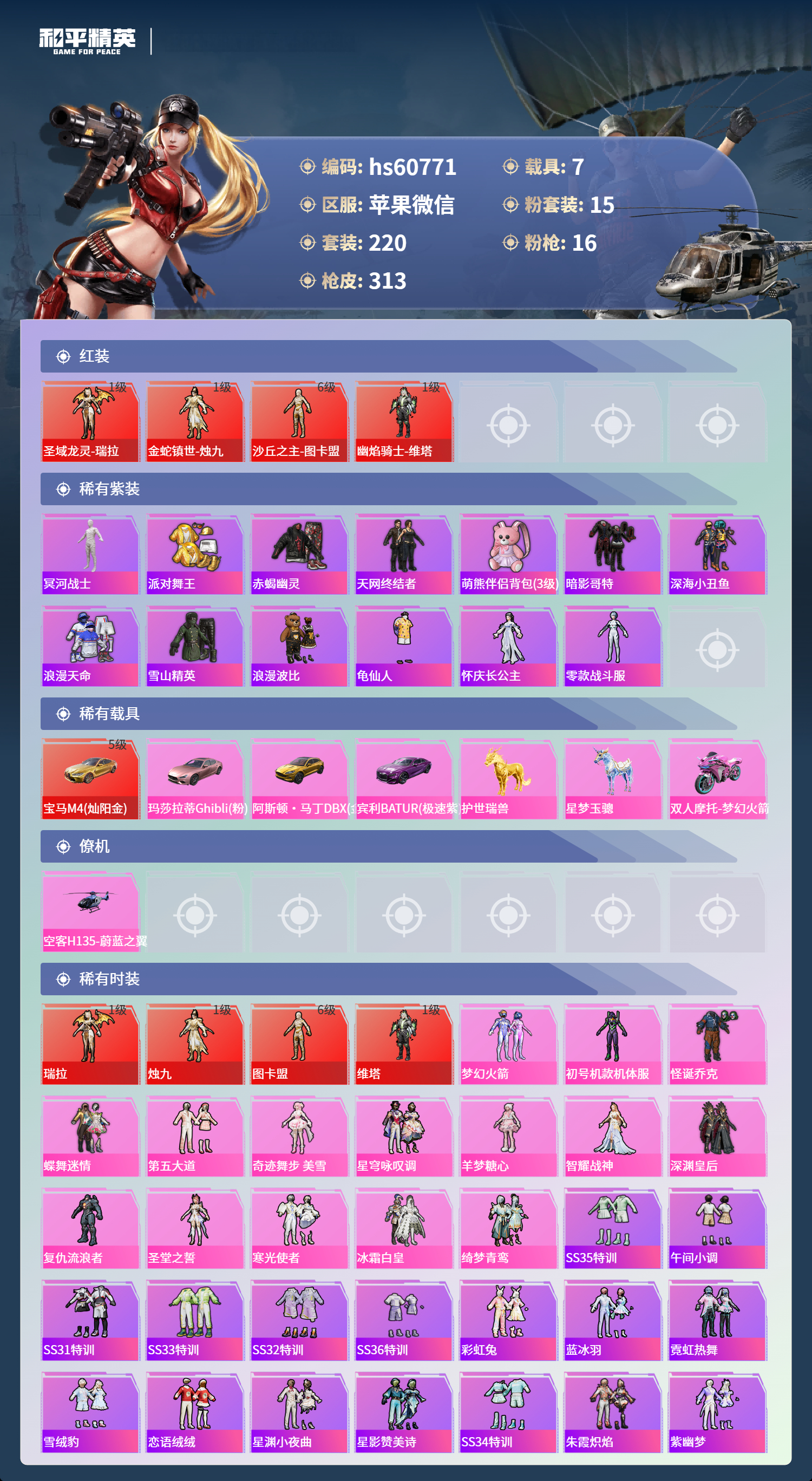 hs60771 苹果微信-22王牌印记-有战神框-4红装-15粉装-16特效呛-7载具-热力值-220套装-313呛皮-10卓越印记-10传奇印记【4红装】沙丘之主-图卡盟/6级幽焰骑士-维塔/1级圣域龙灵-瑞拉/1级金蛇镇世-烛九/1级【15粉装】套装-深渊皇后套装-蝶舞迷情套装-怪诞乔克套装-绮梦青鸾角色-初号机款机体服套装-冰霜白皇角色-复仇流浪者角色-羊