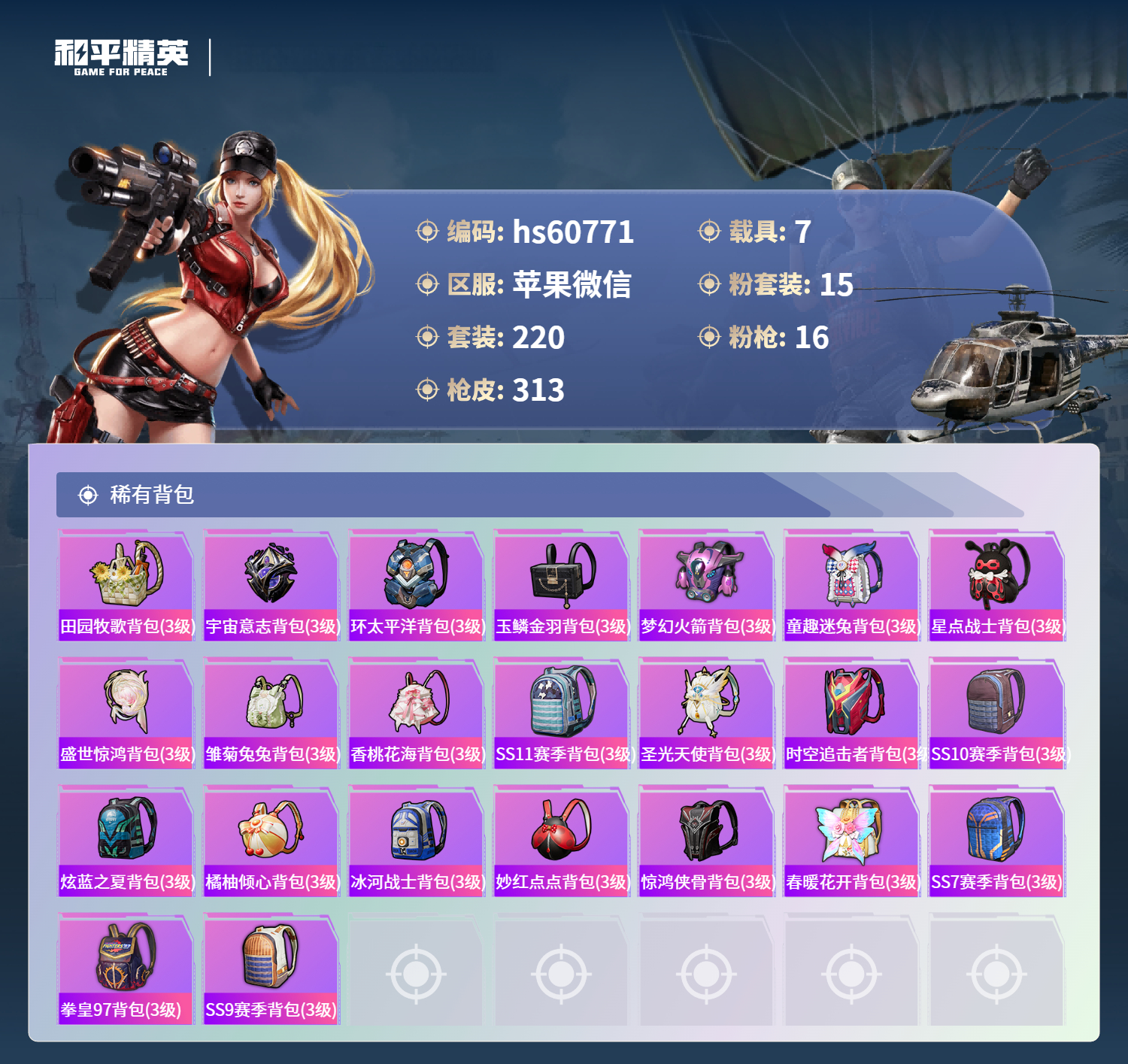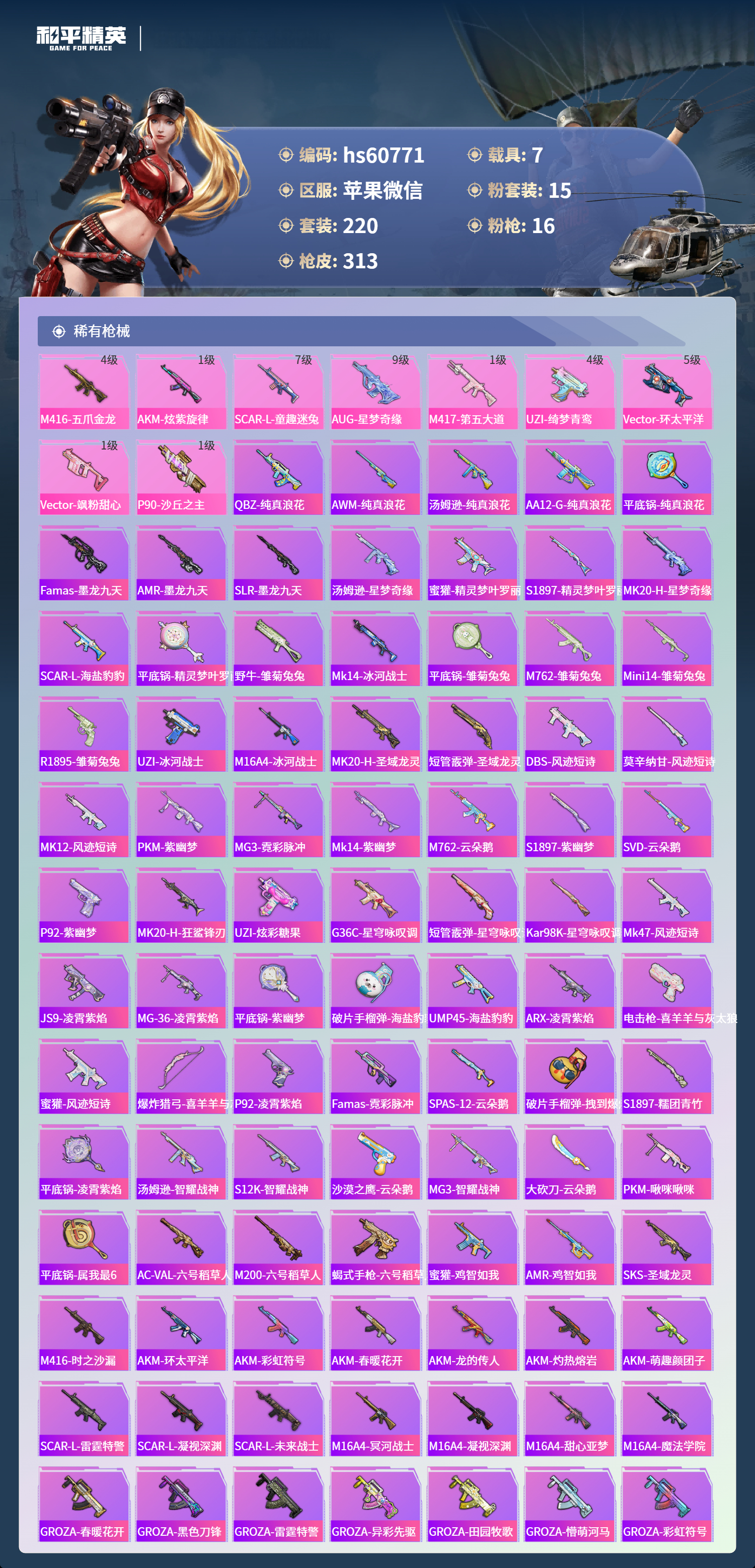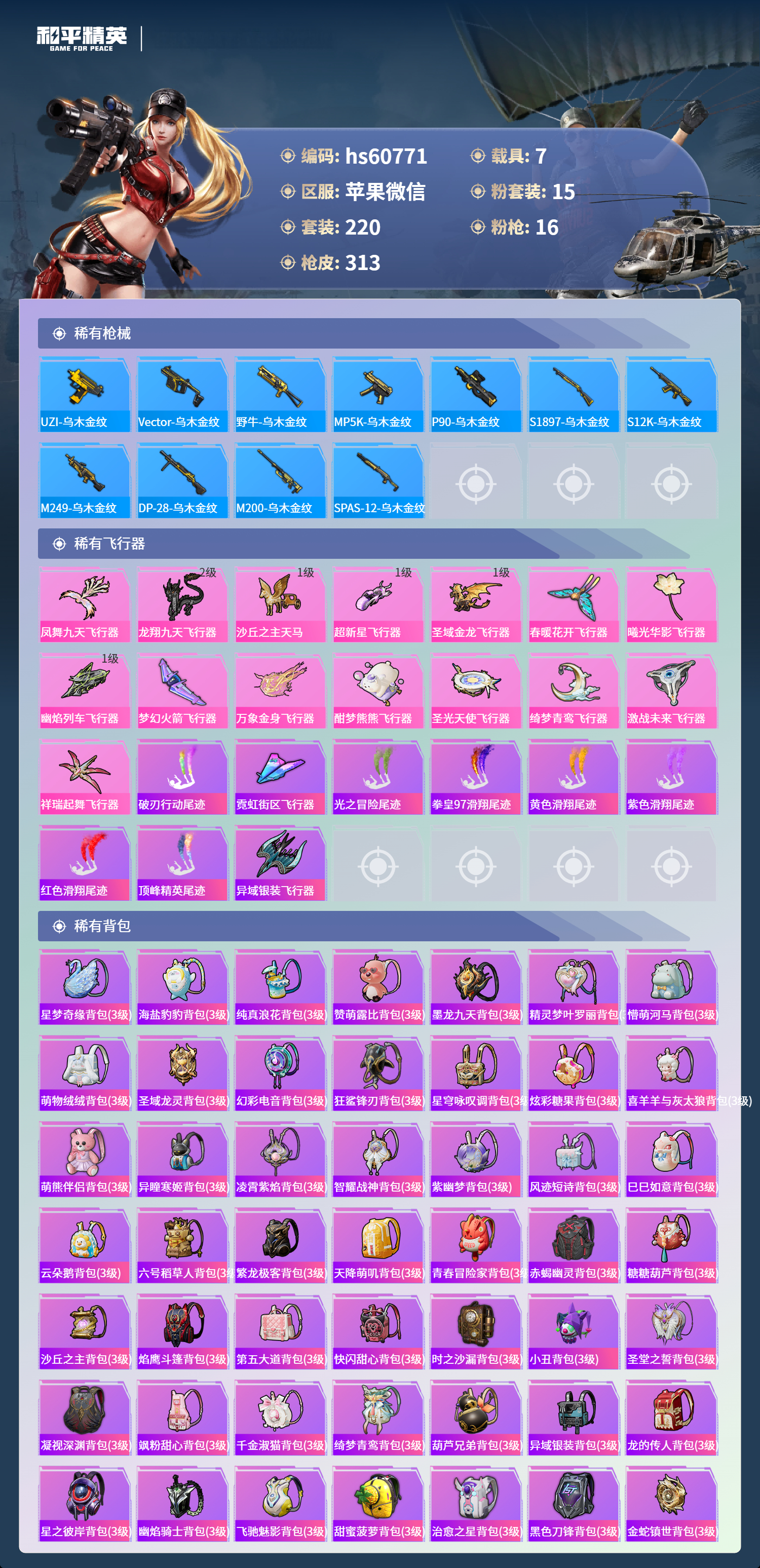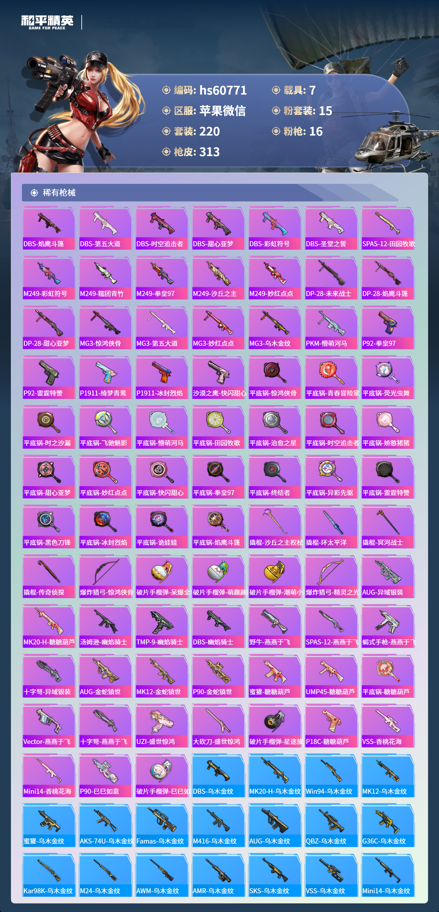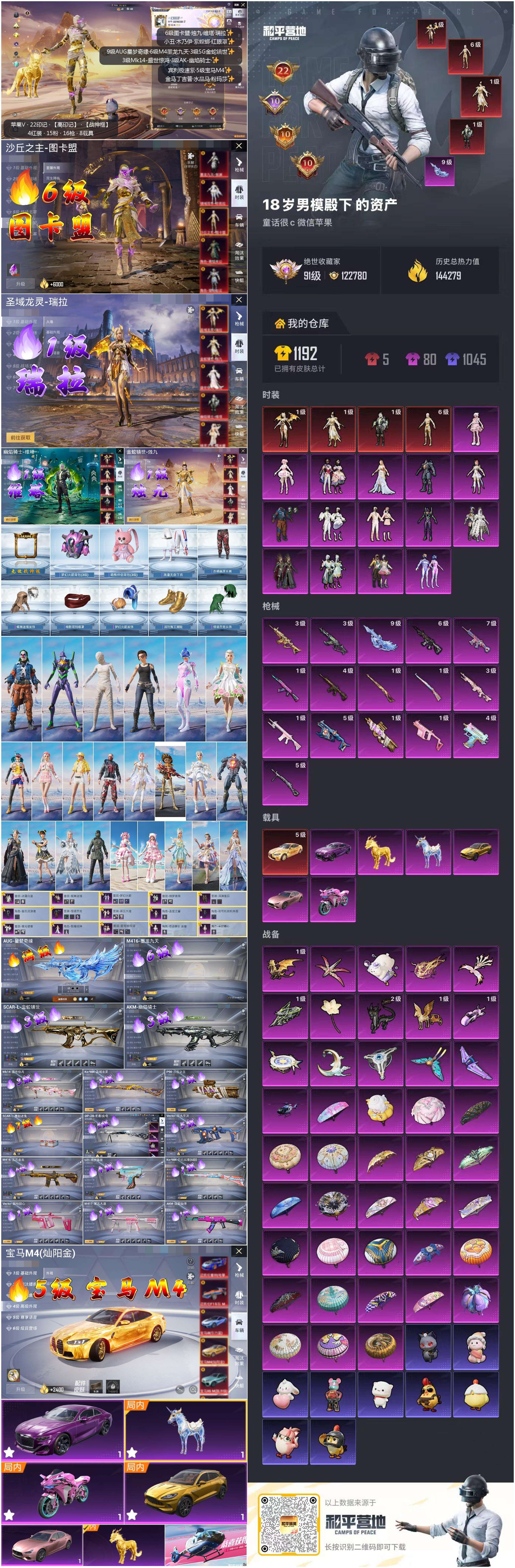 hs60771 苹果微信-22王牌印记-有战神框-4红装-15粉装-16特效呛-7载具-热力值-220套装-313呛皮-10卓越印记-10传奇印记【4红装】沙丘之主-图卡盟/6级幽焰骑士-维塔/1级圣域龙灵-瑞拉/1级金蛇镇世-烛九/1级【15粉装】套装-深渊皇后套装-蝶舞迷情套装-怪诞乔克套装-绮梦青鸾角色-初号机款机体服套装-冰霜白皇角色-复仇流浪者角色-羊