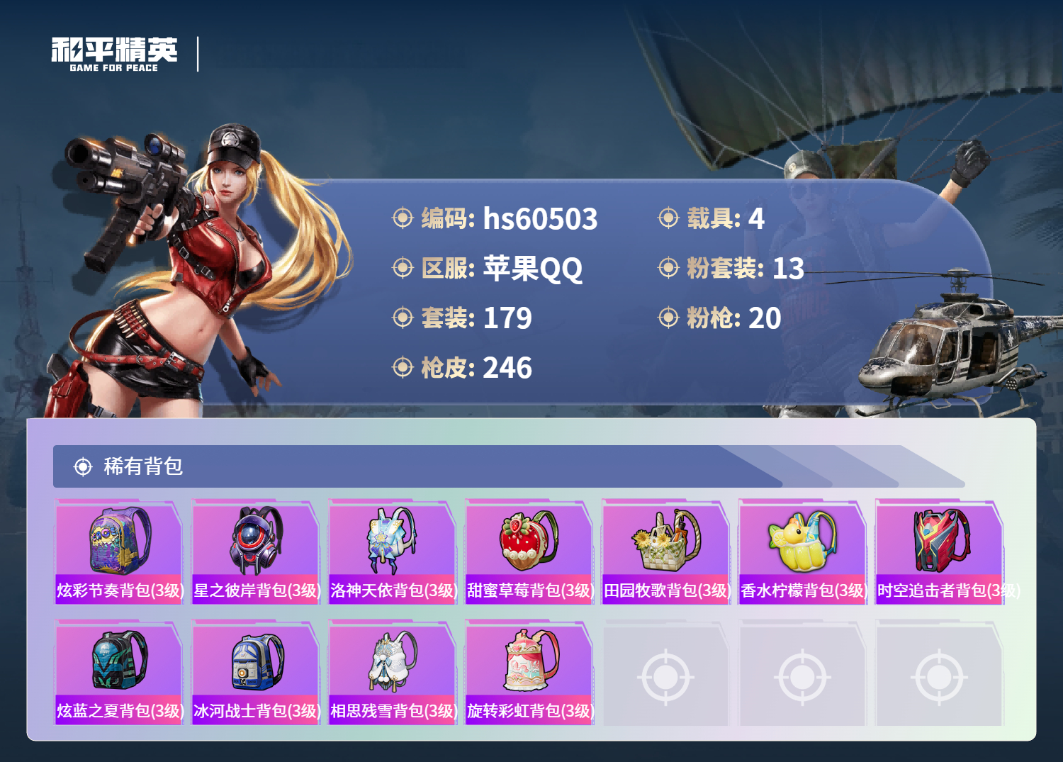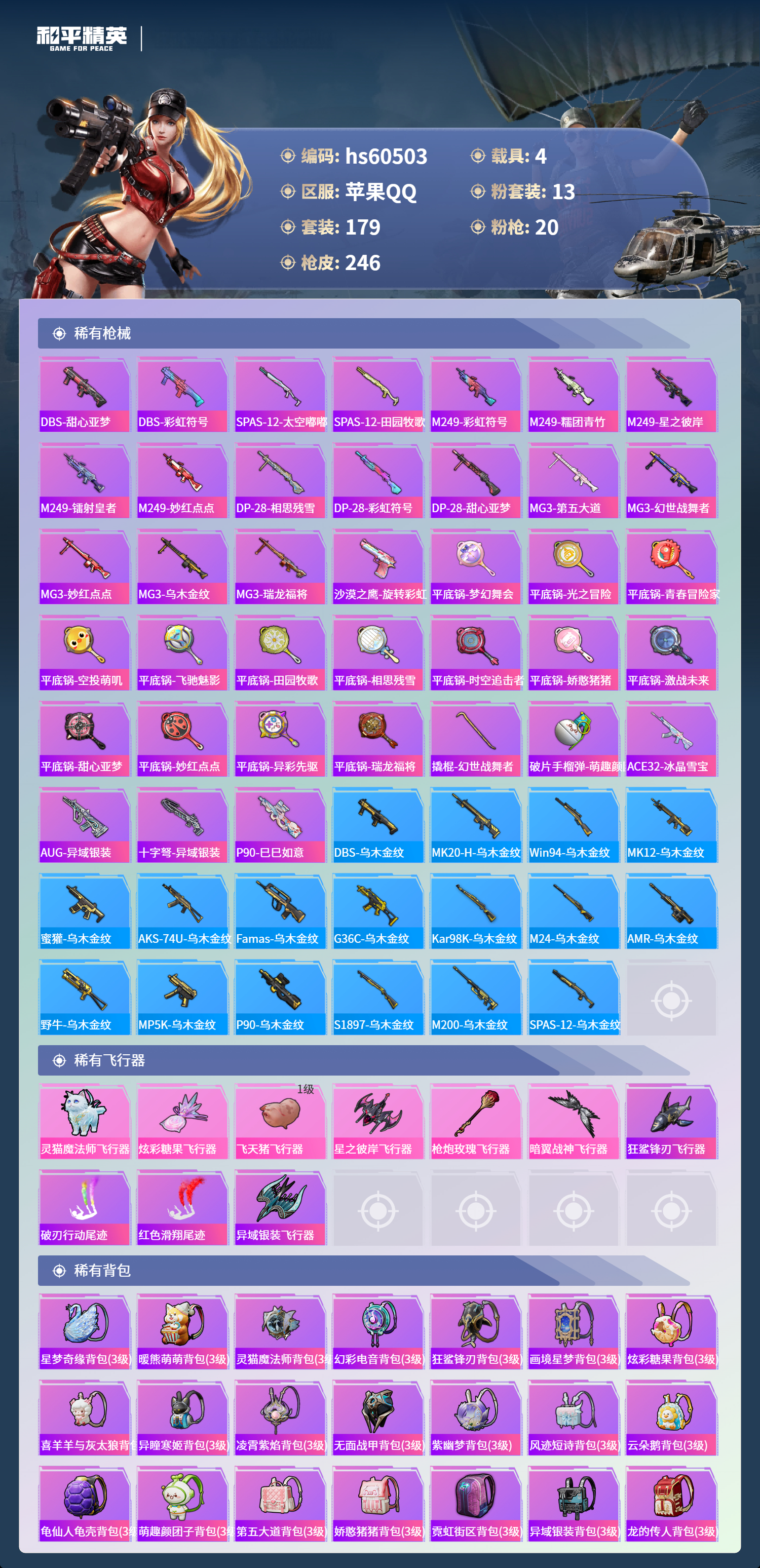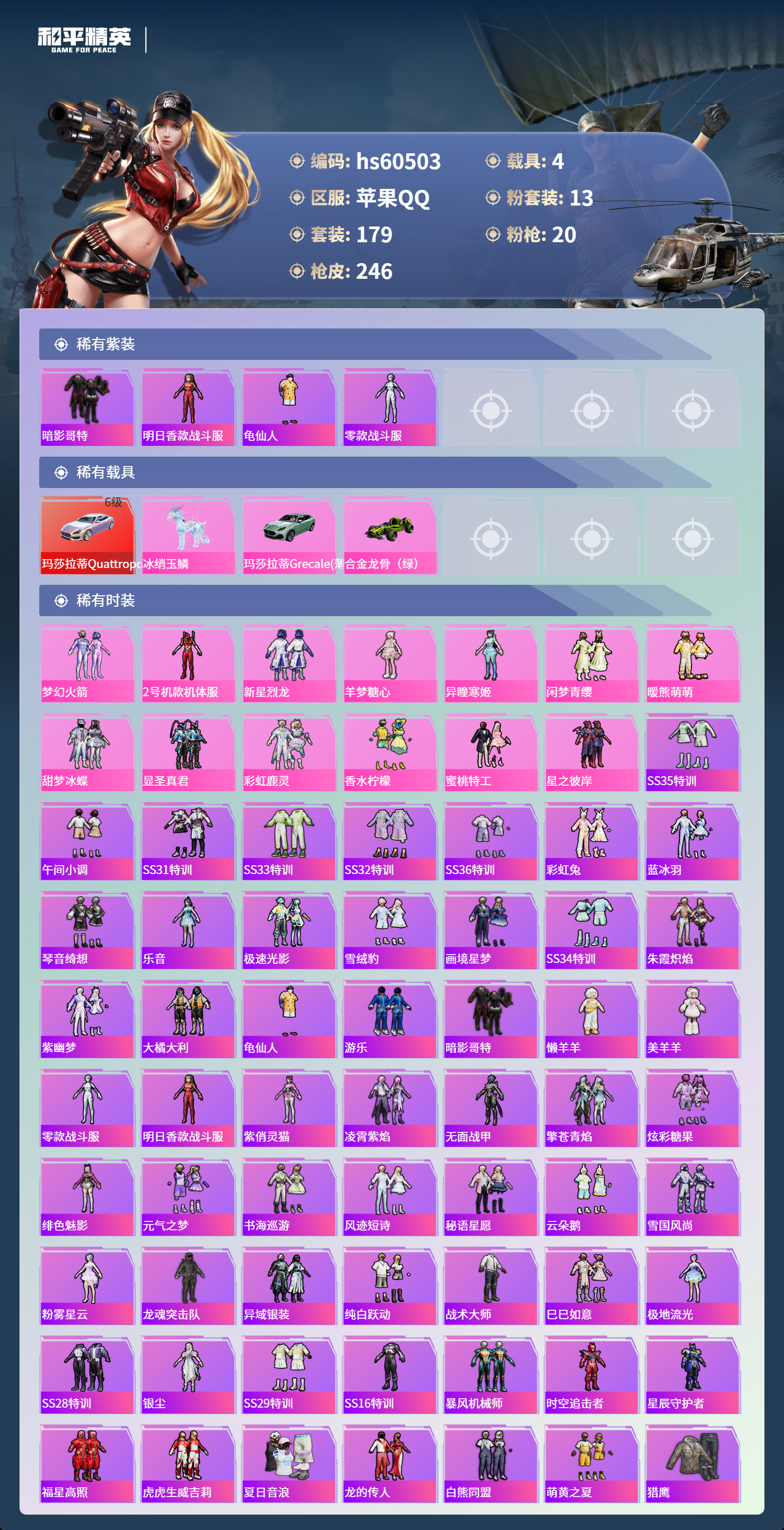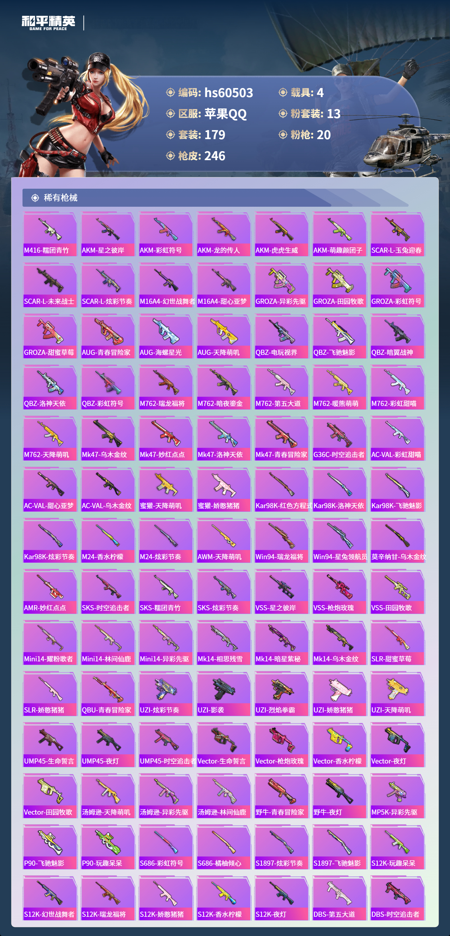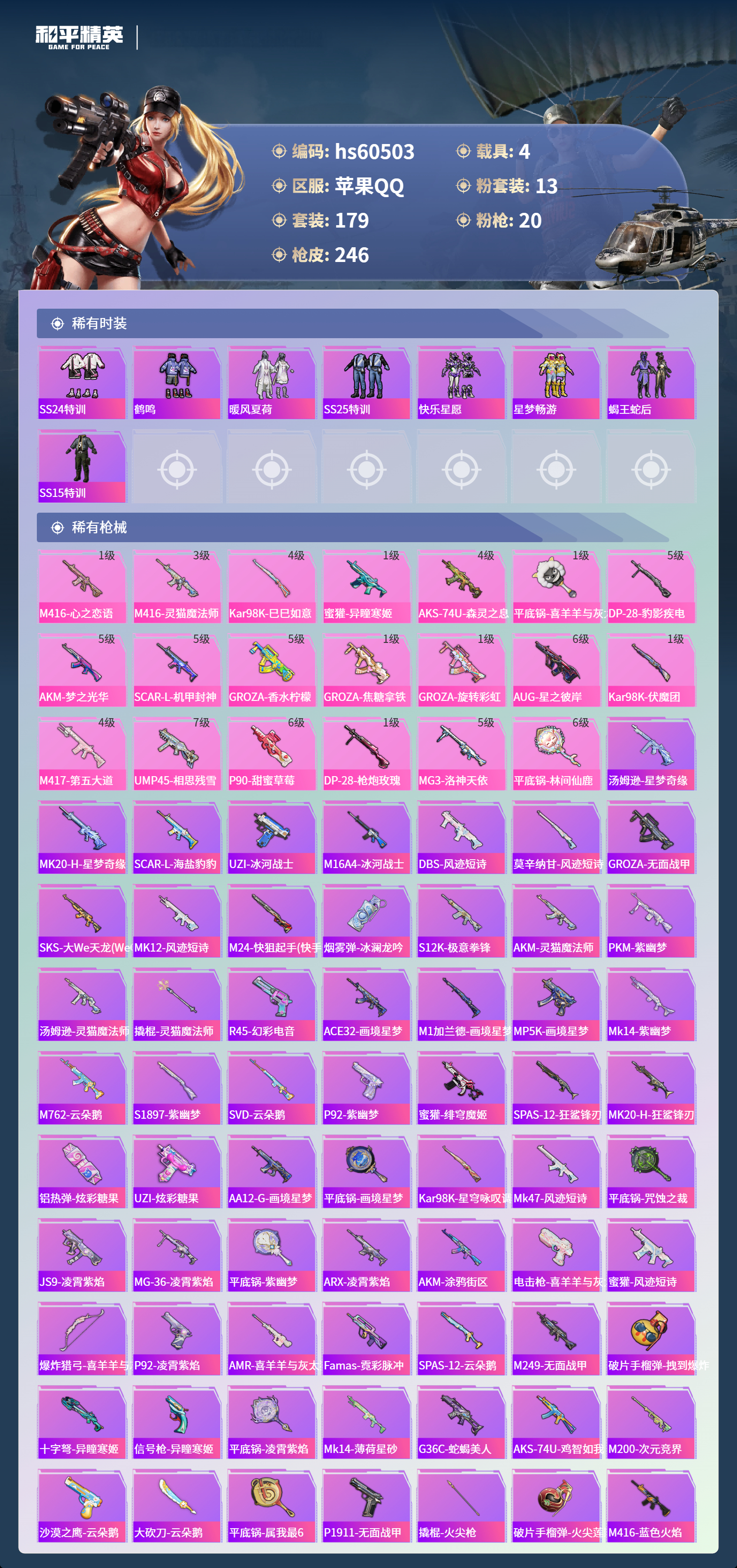 hs60503 苹果手q-13王牌印记-13粉装-20特效呛-4载具-91625热力值-179套装-246呛皮-2卓越印记-1传奇印记【13粉装】套装-新星烈龙角色-2号机款机体服角色-异瞳寒姬套装-梦幻火箭套装-蜜桃特工角色-羊梦糖心套装-甜梦冰蝶套装-香水柠檬套装-暖熊萌萌套装-显圣真君套装-闲梦青缨套装-彩虹鹿灵套装-星之彼岸【20特效呛】kar98k-巳巳如意/