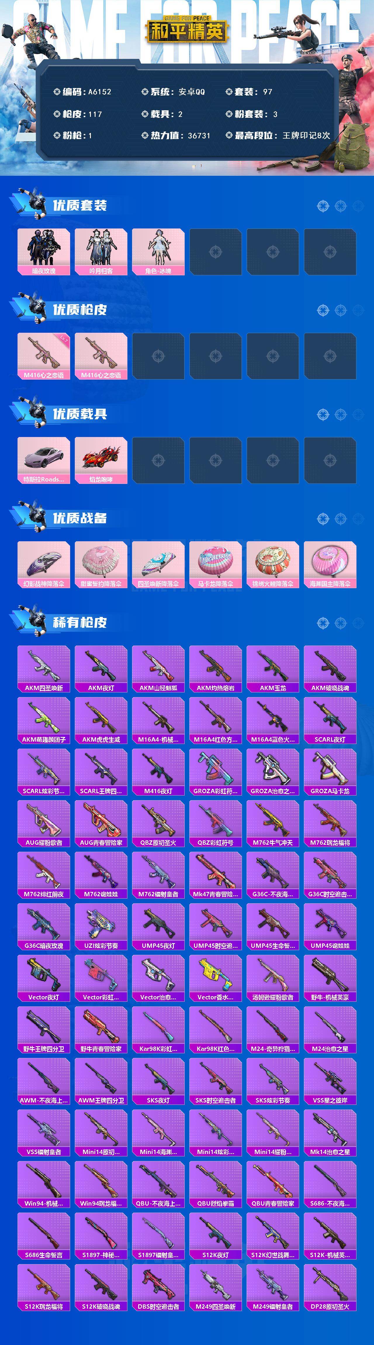 [16594146]安卓 【小号 暗夜玫瑰 m416-心之恋语七级 特斯拉roadster(沁心粉),焰龙咆哮】手q-3粉装-1特效呛-2载具-0粉色飞行器-36731热力值-8王牌印记-97套装-117呛皮 【粉色套装】:粉装-暗夜玫瑰,粉装-吟月归客,角色-冰魄 【粉色呛皮等级】:m416-心之恋语七级 【粉色载具】:特斯拉roadster(沁心粉),焰龙咆哮 【粉色呛皮】:m416-心之恋语 【粉色降落伞】:幻影战神降落伞,甜蜜誓约降落伞,四圣焕新降落伞,马卡龙降落伞,锦绣火鲤降落伞,海渊国主降落伞 【稀有套装】:套装-雪国风尚 【稀有呛皮】:akm-四圣焕新,akm-夜灯,akm-山经魅狐,akm-灼热熔岩,akm-玉龙,akm-破晓战魂,akm-萌趣颜团子,akm-虎虎生威,m16a4-机械英豪,m16a4-红色方程式,m16a4-蓝色火焰,scar-l-夜灯,scar-l-炫彩节奏,scar-l-王牌四分卫,m416-夜灯,groza-彩虹符号,groza-治愈之星,groza-马卡龙,aug-耀粉歌者,aug-青春冒险家,q-原初圣火,q-彩虹符号,m762-牛气冲天,m762-瑞龙福将,m762-绯红前夜,m762-诡娃娃,m762-镭射皇者,mk47-青春冒险家,g36c-不夜海上花,g36c-时空追击者,g36c-暗夜玫瑰,uzi-炫彩节奏,ump45-夜灯,ump45-时空追击者,ump45-生命誓言,ump45-诡娃娃,vect-夜灯,vect-彩虹符号,vect-治愈之星,vect-香水柠檬,汤姆逊-耀粉歌者,野牛-机械英豪,野牛-王牌四分卫,野牛-青春冒险家,kar98k-彩虹符号,kar98k-红色方程式,m24-治愈之星,m24-奇异狩猎者,awm-不夜海上花,awm-王牌四分卫,sks-夜灯,sks-时空追击者,sks-炫彩节奏,vss-星之彼岸,vss-镭射皇者,mini14-原初圣火,mini14-海渊国主,mini14-炫彩节奏,mini14-耀粉歌者,mk14-治愈之星,win94-机械英豪,win94-瑞龙福将,qbu-不夜海上花,qbu-烈焰拳霸,qbu-青春冒险家,s686-不夜海上花,s686-生命誓言,s1897-神秘黑猫,s1897-镭射皇者,s12k-瑞龙福将,s12k-破晓战魂,s12k-夜灯,