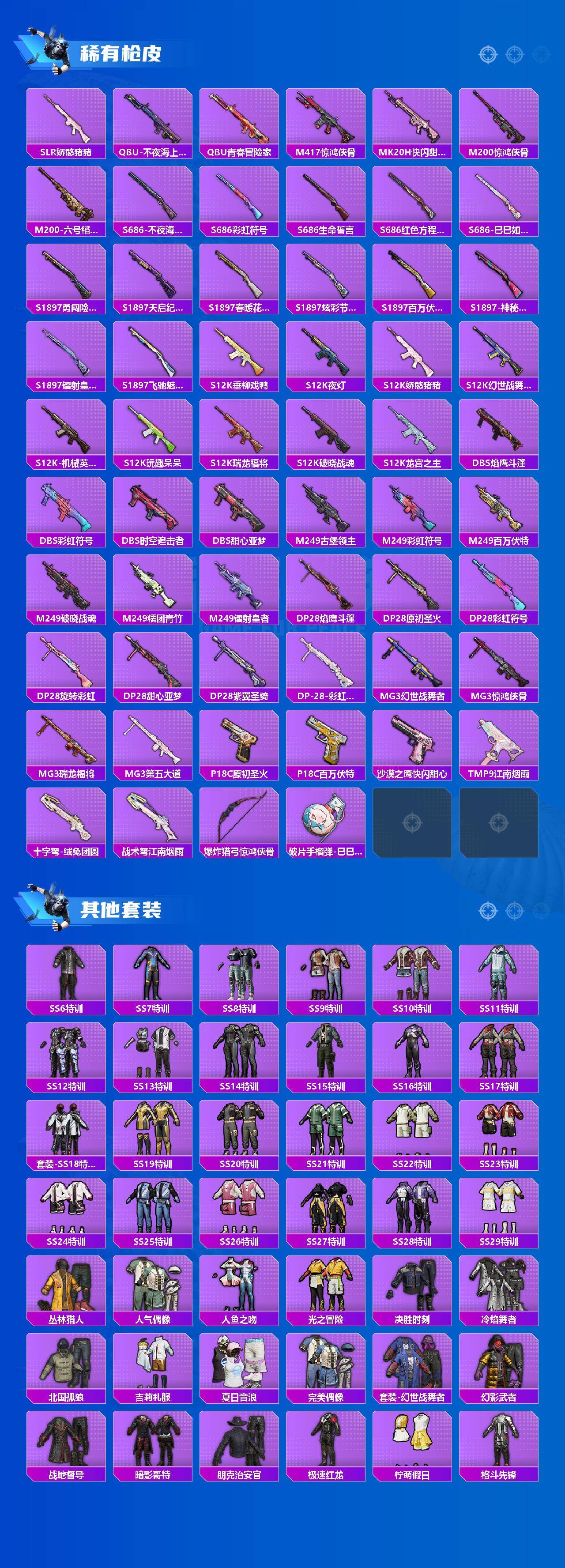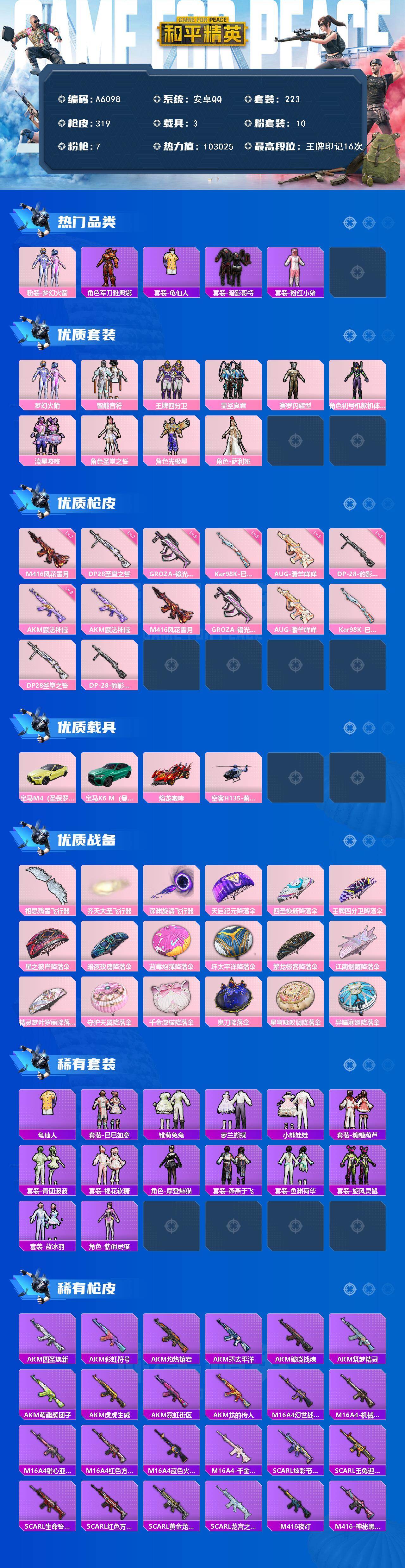 [16594819]安卓 【男神身法号 梦幻火箭/龟仙人/暗影哥特/初号机款机体服/akm-魔法神域三级/m416-风花雪月七级/宝马m4(圣保罗黄)/宝马x6 m(曼岛绿)】手q-10粉装-7特效呛-3载具-4粉色飞行器-103025热力值-16王牌印记-223套装-319呛皮 【热门品类】:粉装-梦幻火箭,角色-军刀雅典娜,套装-龟仙人,套装-暗影哥特,套装-粉红小猪 【粉色套装】:粉装-梦幻火箭,粉装-智能音符,粉装-王牌四分卫,粉装-显圣真君,角色-赛罗闪耀型,角色-初号机款机体服,粉装-流星咚咚,角色-圣堂之誓,角色-光极星,角色-萨利娅 【粉色呛皮等级】:akm-魔法神域三级,m416-风花雪月七级,groza-镜光银凌五级,aug-暖羊咩咩五级,kar98k-巳巳如意五级,dp-28-圣堂之誓七级,dp-28-豹影疾电五级 【粉色载具】:宝马m4(圣保罗黄),宝马x6 m(曼岛绿),焰龙咆哮,空客h135-蔚蓝之翼 【粉色呛皮】:akm-魔法神域,m416-风花雪月,groza-镜光银凌,aug-暖羊咩咩,kar98k-巳巳如意,dp-28-圣堂之誓,dp-28-豹影疾电 【粉色飞行器】:相思残雪飞行器,齐天大圣飞行器,深渊漩涡飞行器 【粉色降落伞】:天启纪元降落伞,四圣焕新降落伞,王牌四分卫降落伞,星之彼岸降落伞,暗夜玫瑰降落伞,蓝莓炮弹降落伞,环太平洋降落伞,繁龙极客降落伞,江南烟雨降落伞,精灵梦叶罗丽降落伞,守护天翼降落伞,千金淑猫降落伞,鬼刀降落伞,星穹咏叹调降落伞,异瞳寒姬降落伞,炫彩糖果降落伞 【稀有套装】:套装-龟仙人,套装-巳巳如意,套装-雪国风尚,套装-炫彩糖果,套装-雏菊兔兔,套装-萝兰蝴蝶,套装-小熊娃娃,套装-糖糖葫芦,套装-青团波波,套装-棉花软糖,角色-摩登魅猫,套装-燕燕于飞,套装-鱼渊荷华,套装-旋风灵鼠,套装-蓝冰羽,角色-紫俏灵猫 【稀有呛皮】:aug-冰晶雪宝,akm-四圣焕新,akm-彩虹符号,akm-灼热熔岩,akm-环太平洋,akm-破晓战魂,akm-筑梦精灵,akm-萌趣颜团子,akm-虎虎生威,akm-霓虹街区,akm-龙的传人,m16a4-幻世战舞者,m16a4-机械英豪,m16a4-甜心亚梦,m16a4-红色方程式,m16a4-蓝色火焰,m16a4-千金淑猫,scar-l-炫彩节奏,