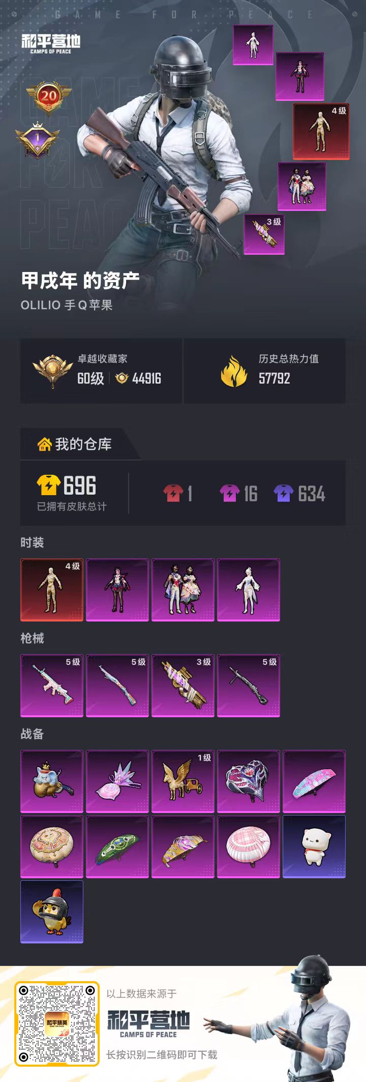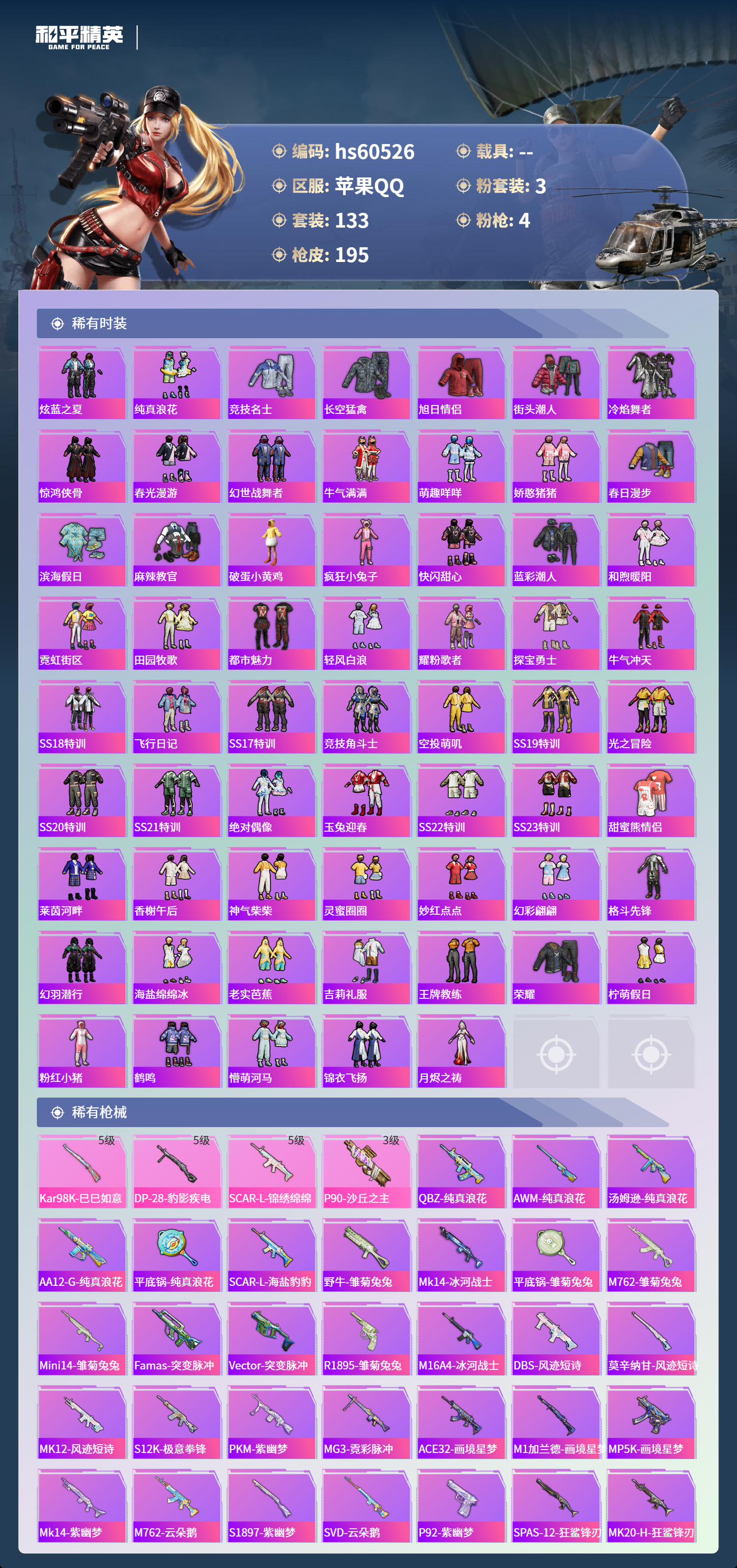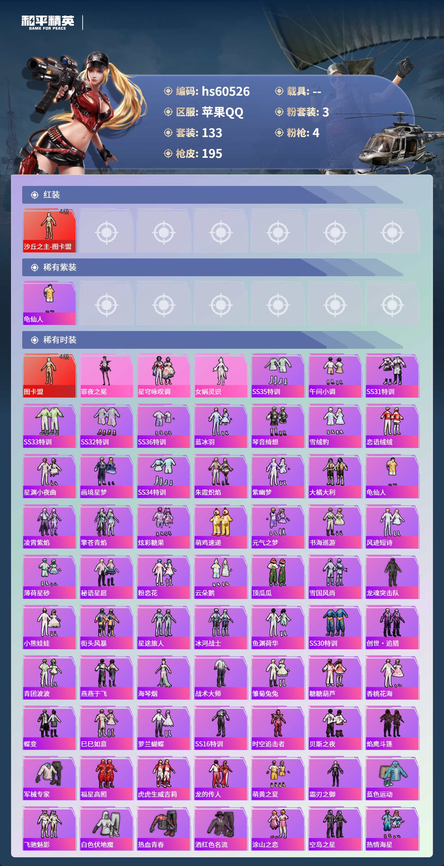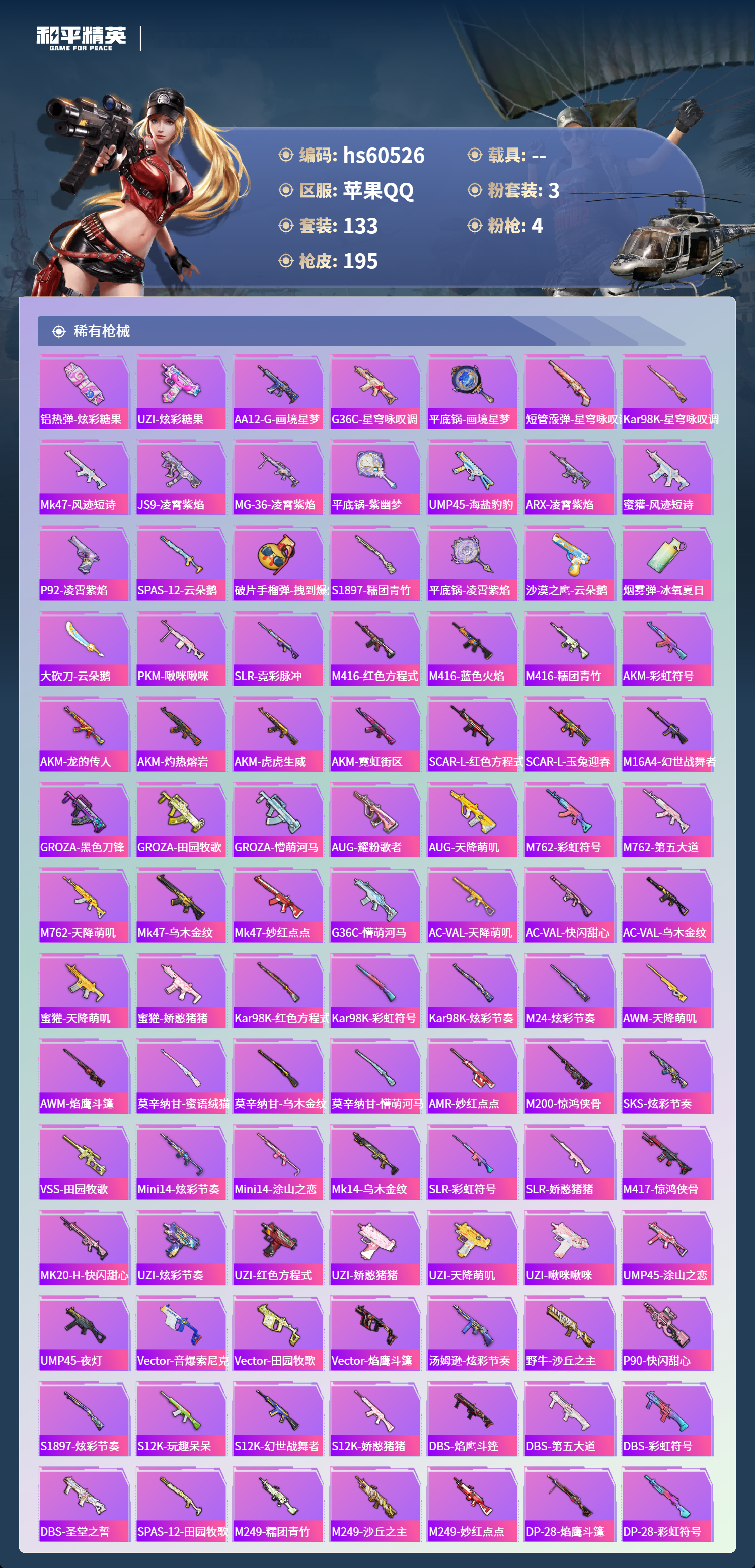 0载具-133套装-195呛皮-hs60526 苹果手q-20王牌印记-1红装-3粉装-4特效呛-57792热力值-133套装-195呛皮-1卓越印记【1红装】沙丘之主-图卡盟/4级【3粉装】角色-女娲灵识套装-星穹咏叹调角色-罪夜之冕【4特效呛】p90-沙丘之主/3级dp-28-豹影疾电/5级scar-l-锦绣绵绵/5级kar98k-巳巳如意/5级【1稀有紫装】龟仙人【131稀有时装】罪夜之冕图卡盟/4级