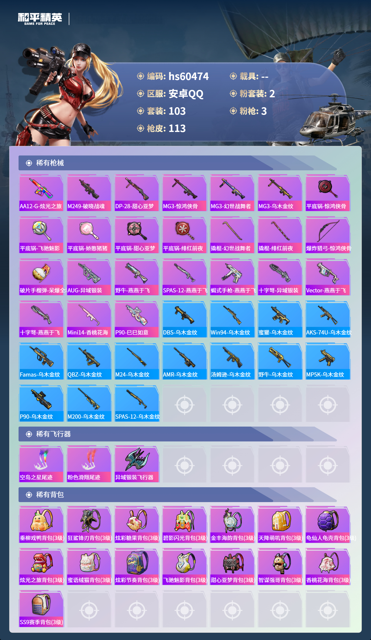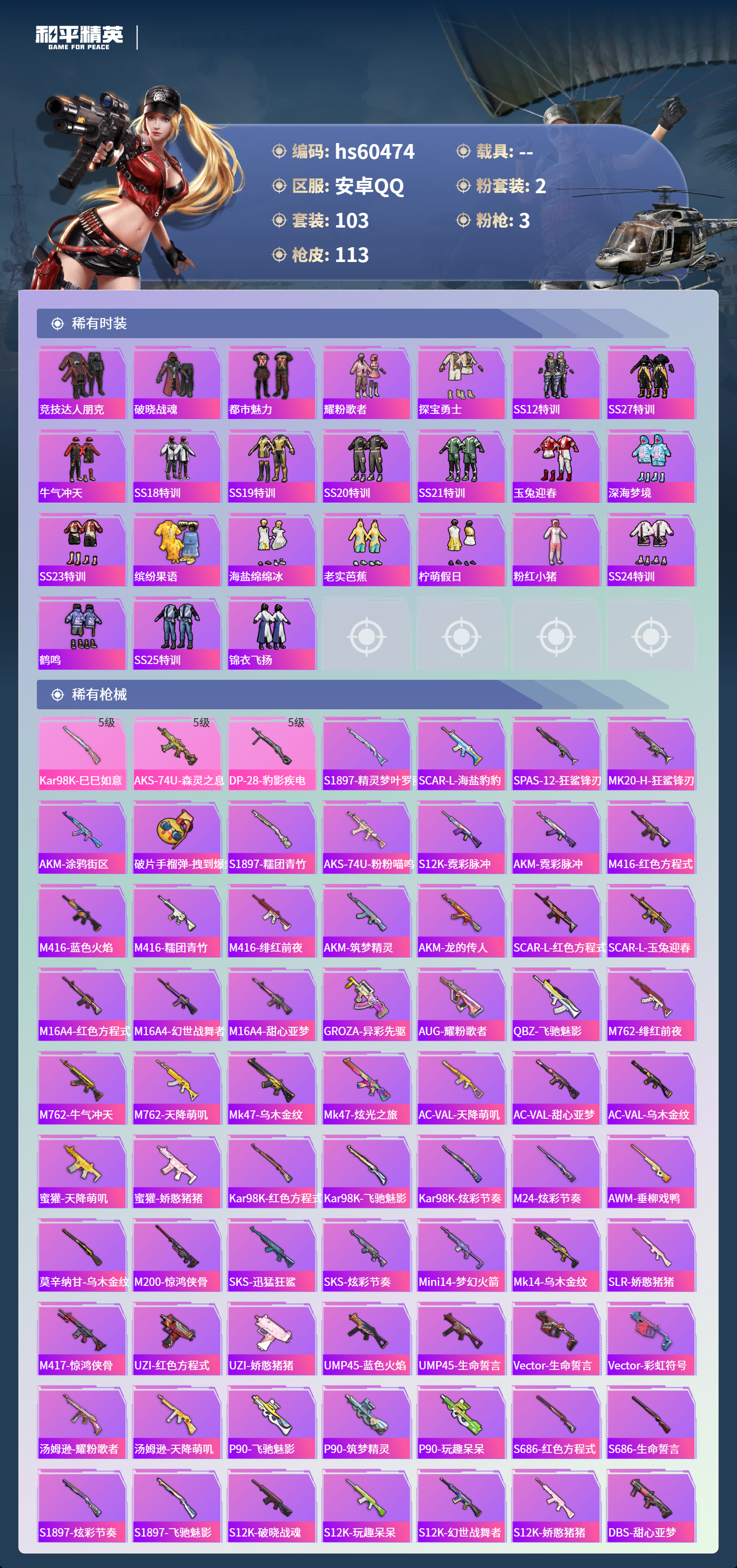 0载具-103套装-113呛皮-hs60474 安卓手q-8王牌印记-2粉装-3特效呛-33469热力值-103套装-113呛皮【2粉装】套装-第五大道套装-炙焰牛王【3特效呛】kar98k-巳巳如意/5级dp-28-豹影疾电/5级aks-74u-森灵之息/5级【4稀有紫装】暗影哥特深海小丑鱼浪漫天命龟仙人【101稀有时装】第五大道ss35特训ss31特训ss33特训ss32特训ss34特训浪漫天