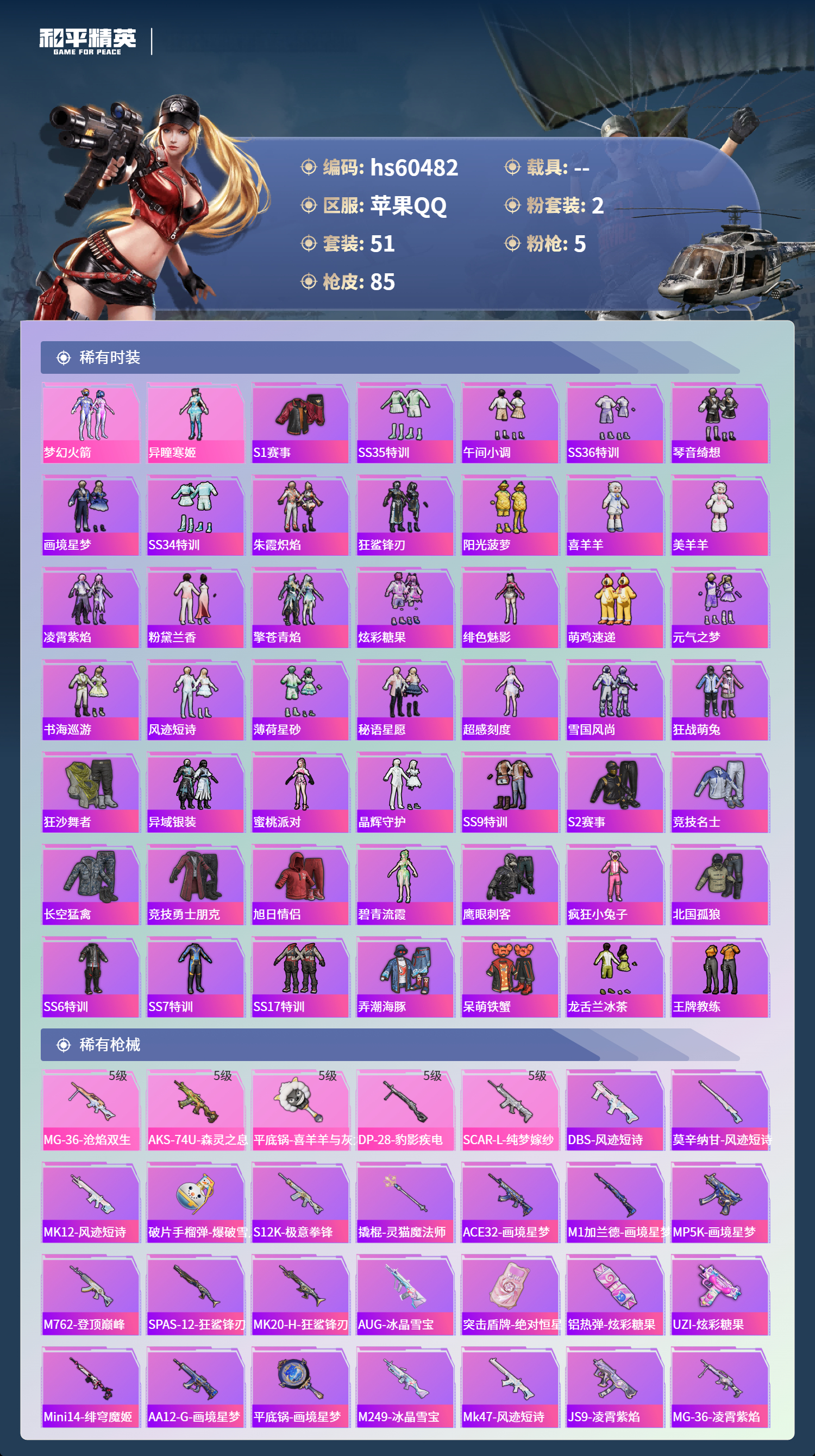 0载具-51套装-85呛皮-hs60482 苹果手q-4王牌印记-2粉装-5特效呛-24925热力值-51套装-85呛皮-3卓越印记-2传奇印记【2粉装】套装-梦幻火箭角色-异瞳寒姬【5特效呛】dp-28-豹影疾电/5级scar-l-纯梦嫁纱/5级平底锅-喜羊羊与灰太狼/5级mg-36-沧焰双生/5级aks-74u-森灵之息/5级【49稀有时装】s1赛事梦幻火箭异瞳寒姬ss35特训午间小调ss36特