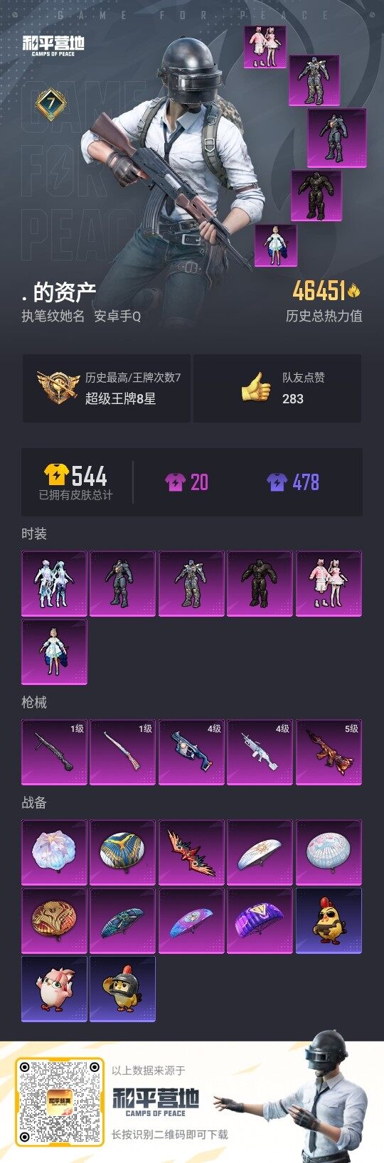 [15939042]安卓 手q-6粉装-5特效呛-0载具-1粉色飞行器-46451热力值-7王牌印记-108套装-153呛皮 【热门品类】:套装-龟仙人,套装-粉红小猪 【粉色套装】:角色-洛天依,角色-复仇流浪者,粉装-彩虹甜喵,角色-幻影,角色-猩猩队长,粉装-幻彩电音 【粉色呛皮等级】:m416-风花雪月五级,vect-环太平洋四级,kar98k-巳巳如意一级,m249-彩虹甜喵四级,dp-28-豹影疾电一级 【粉色呛皮】:m416-风花雪月,vect-环太平洋,kar98k-巳巳如意,m249-彩虹甜喵,dp-28-豹影疾电 【粉色降落伞】:深海曼妙降落伞,天启纪元降落伞,暗夜玫瑰降落伞,齐天大圣降落伞,环太平洋降落伞,彩虹甜喵降落伞,天星战神降落伞,荧海星豚降落伞 【稀有套装】:套装-龟仙人,套装-巳巳如意,角色-摩登魅猫,套装-燕燕于飞,套装-鱼渊荷华,角色-蜜桃派对,套装-星渊小夜曲 【稀有呛皮】:akm-彩虹符号,akm-环太平洋,akm-生命誓言,akm-破晓战魂,scar-l-炫彩节奏,scar-l-红色方程式,m416-夜灯,m416-红色方程式,m416-绯红前夜,groza-春暖花开,groza-田园牧歌,groza-黑色刀锋,aug-天降萌叽,aug-耀粉歌者,q-彩虹符号,q-洛神天依,m762-天降萌叽,m762-彩虹甜喵,m762-深海曼妙,m762-牛气冲天,m762-瑞龙福将,g36c-镜域双华,g36c-时空追击者,g36c-暗夜玫瑰,g36c-星穹咏叹调,ac-val-天降萌叽,ac-val-彩虹甜喵,蜜獾-天降萌叽,蜜獾-娇憨猪猪,uzi-天降萌叽,uzi-娇憨猪猪,uzi-炫彩节奏,ump45-时空追击者,ump45-生命誓言,vect-焰鹰斗篷,vect-彩虹符号,vect-炎氏战神,vect-生命誓言,vect-田园牧歌,vect-黑色刀锋,汤姆逊-勇闯险境,汤姆逊-天降萌叽,汤姆逊-炫彩节奏,汤姆逊-环太平洋,汤姆逊-耀粉歌者,aks-74u-鬼刀,p90-巳巳如意,kar98k-勇闯险境,kar98k-彩虹符号,m24-拂晓神骑,awm-焰鹰斗篷,sks-勇闯险境,sks-心之恋语,sks-时空追击者,sks-迅猛狂鲨,vss-深山诡影,vss-田园牧歌,vss-黑色刀锋