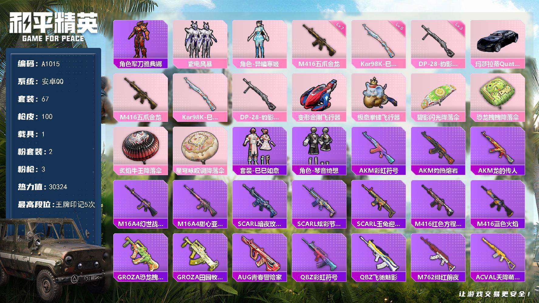 [16354909]安卓 【小号 军刀雅典娜 紫电风暴 异瞳寒姬 m416-五爪金龙七级 玛莎拉蒂quattropte(夜幕蓝)】手q-2粉装-3特效呛-1载具-2粉色飞行器-30324热力值-5王牌印记-67套装-100呛皮 【热门品类】:角色-军刀雅典娜 【粉色套装】:粉装-紫电风暴,角色-异瞳寒姬 【粉色呛皮等级】:m416-五爪金龙七级,kar98k-巳巳如意五级,dp-28-豹影疾电三级 【粉色载具】:玛莎拉蒂quattropte(夜幕蓝) 【粉色呛皮】:m416-五爪金龙,kar98k-巳巳如意,dp-28-豹影疾电 【粉色飞行器】:变形金刚飞行器,极意拳锋飞行器 【粉色降落伞】:碧影闪光降落伞,恐龙拽拽降落伞,炙焰牛王降落伞,星穹咏叹调降落伞 【稀有套装】:套装-巳巳如意,套装-琴音绮想 【稀有呛皮】:akm-彩虹符号,akm-灼热熔岩,akm-龙的传人,m16a4-幻世战舞者,m16a4-甜心亚梦,scar-l-暗夜玫瑰,scar-l-炫彩节奏,scar-l-玉兔迎春,m416-红色方程式,m416-蓝色火焰,groza-恐龙拽拽,groza-田园牧歌,aug-青春冒险家,q-彩虹符号,q-飞驰魅影,m762-绯红前夜,ac-val-天降萌叽,ac-val-甜心亚梦,蜜獾-垂柳戏鸭,蜜獾-娇憨猪猪,ace32-画境星梦,uzi-天降萌叽,uzi-娇憨猪猪,ump45-生命誓言,vect-田园牧歌,汤姆逊-天降萌叽,汤姆逊-环太平洋,mp5k-画境星梦,p90-飞驰魅影,p90-巳巳如意,kar98k-炫彩节奏,kar98k-王子的夏天,kar98k-飞驰魅影,m24-炫彩节奏,awm-垂柳戏鸭,awm-恐龙拽拽,sks-炫彩节奏,sks-糯团青竹,vss-彩虹符号,vss-田园牧歌,mini14-筑梦精灵,slr-娇憨猪猪,amr-喜羊羊与灰太狼,m417-惊鸿侠骨,mk20-h-莲影清波,m200-惊鸿侠骨,m1加兰德-画境星梦,s1897-炫彩节奏,s1897-飞驰魅影,s12k-玩趣呆呆,s12k-垂柳戏鸭,s12k-娇憨猪猪,s12k-幻世战舞者,s12k-极意拳锋,dbs-甜心亚梦,aa12-g-画境星梦,spas-12-田园牧歌,m249-彩虹符号,dp-28-甜心亚梦,mg3-幻世战舞者,mg3-惊鸿侠骨,mg3-第五
