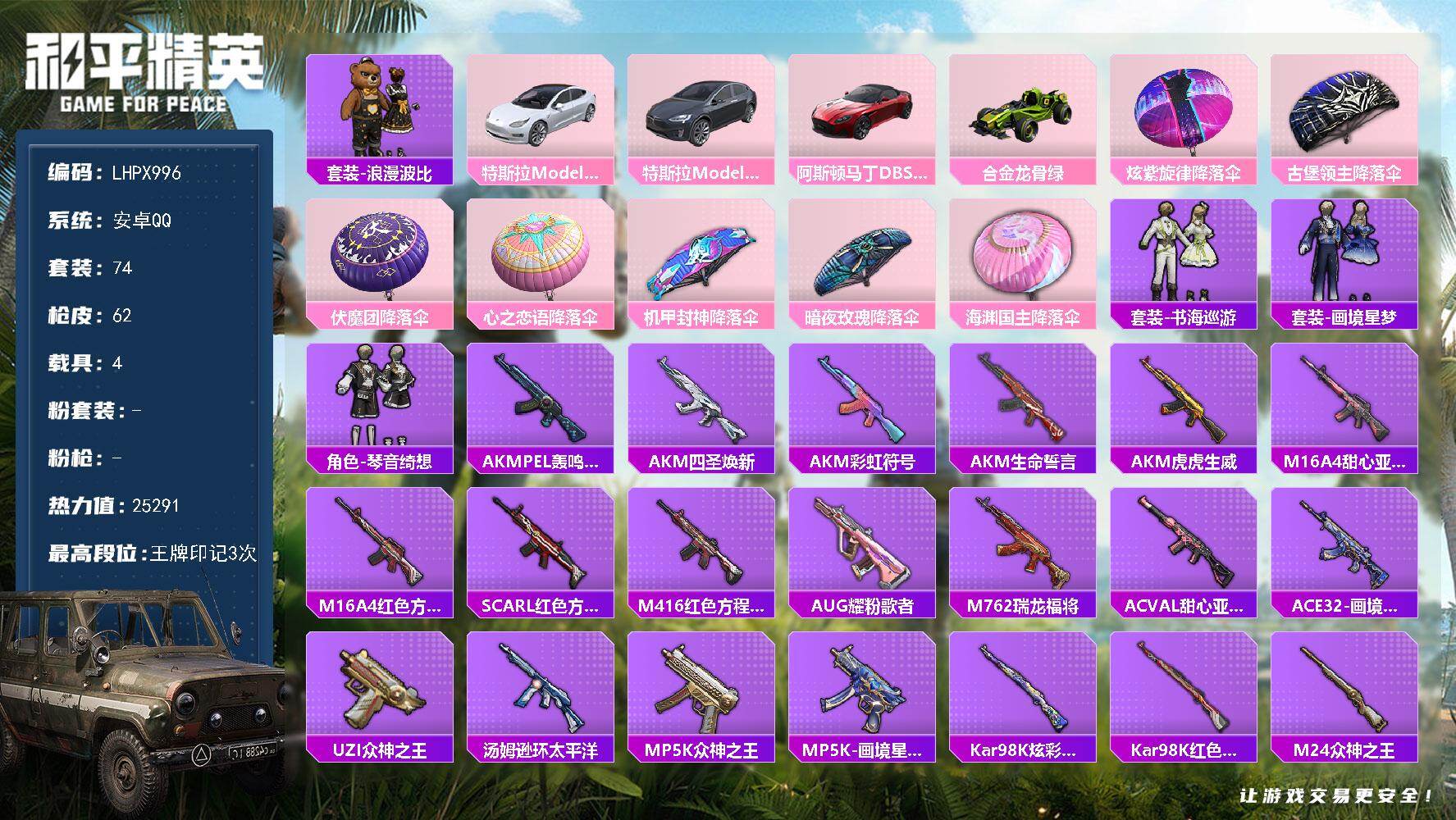 [16606079]【店主推荐捡漏号!可直接换绑】安卓 手q-0粉装-0特效呛-4载具-1粉色飞行器-25291热力值-3王牌印记-74套装-62呛皮【热门品类】:套装-浪漫波比【粉色载具】:特斯拉model 3(珍珠白),特斯拉model x(冷光银),阿斯顿马丁dbs(红),合金龙骨(绿)