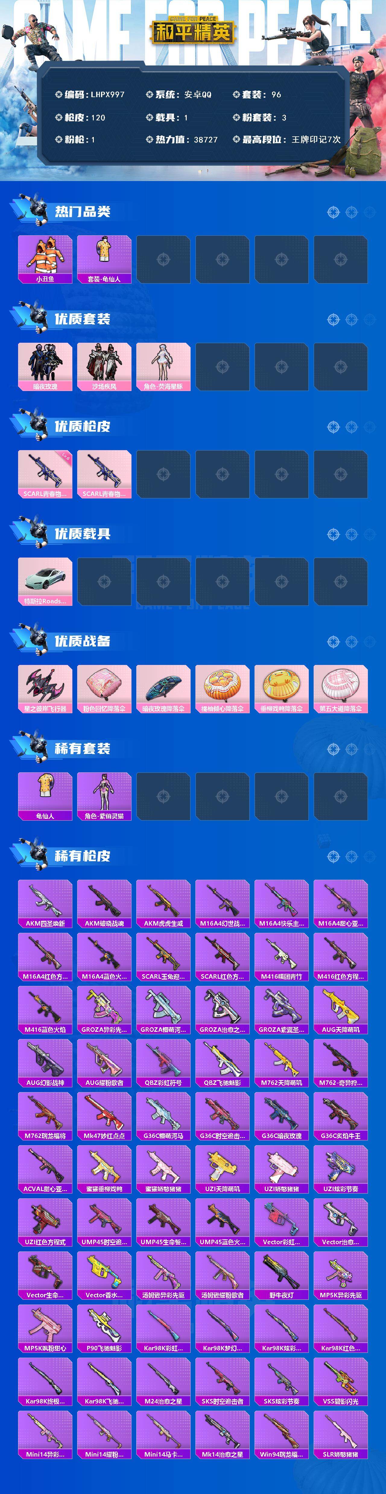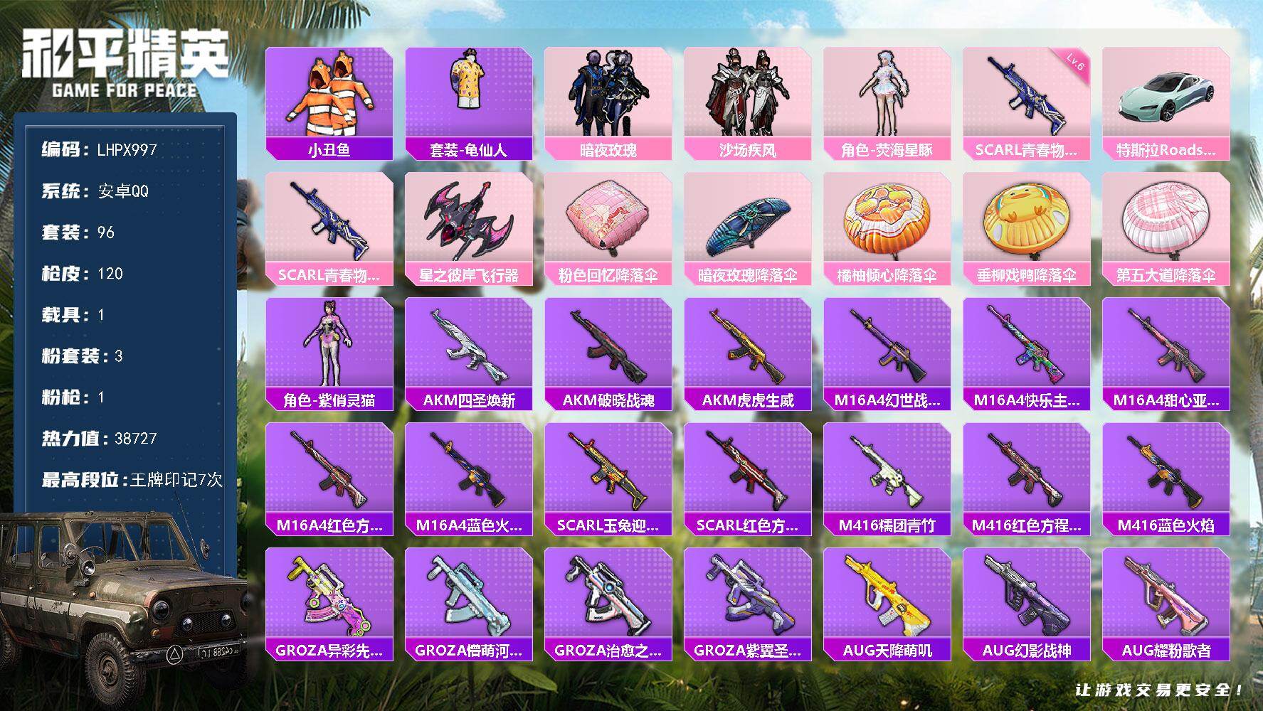 [16606070]【店主推荐捡漏号!可直接换绑】安卓 手q-3粉装-1特效呛-1载具-1粉色飞行器-38727热力值-7王牌印记-96套装-120呛皮【热门品类】:套装-小丑鱼,套装-龟仙人【粉色套装】:粉装-暗夜玫瑰,粉装-沙场疾风,角色-荧海星豚【粉色呛皮等级】:scar-l-青春物语六级【粉色载具】:特斯拉roadster(水滴蓝)【粉色呛皮】:scar-l-青春物语【粉色飞行器】:星之彼岸飞行器