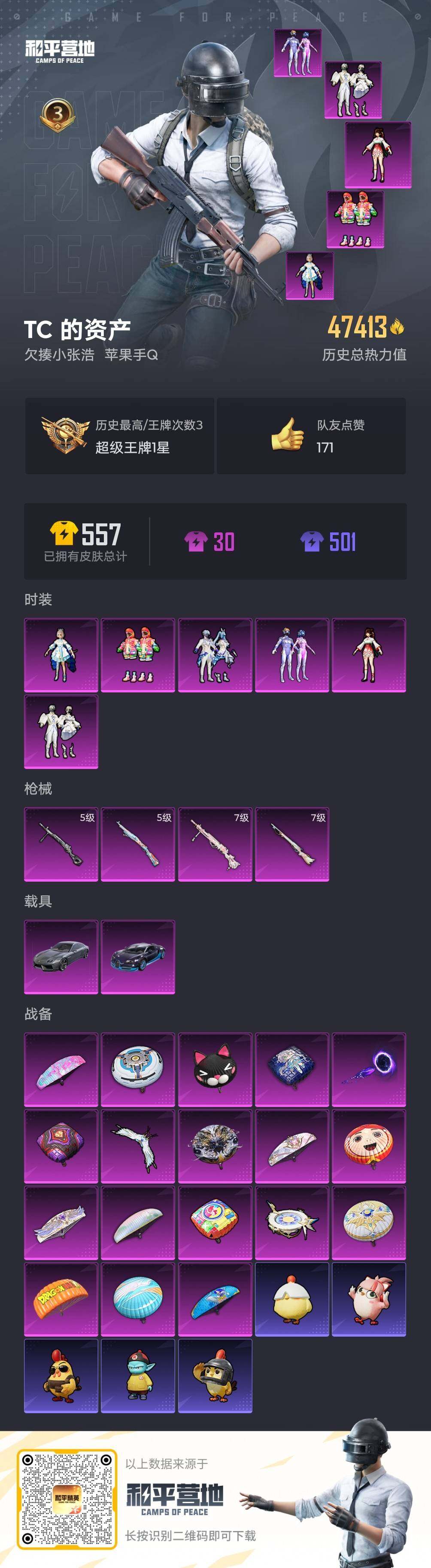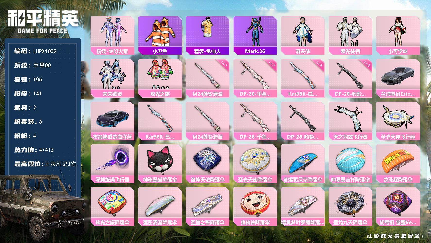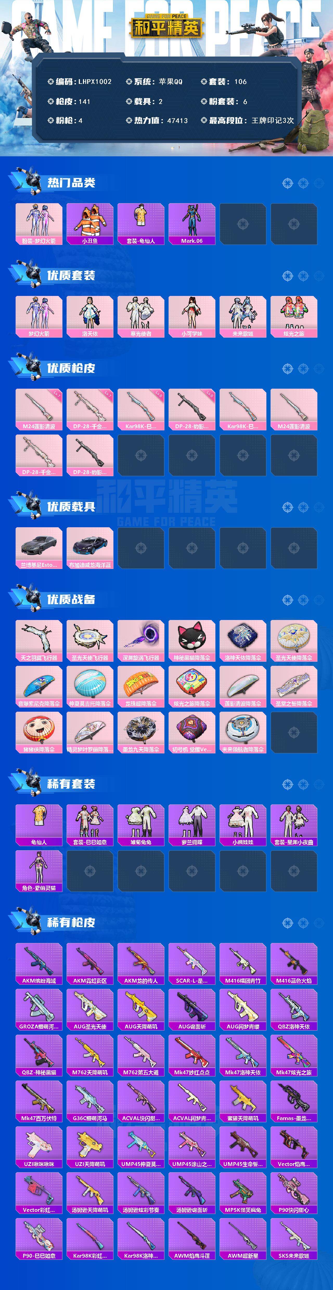 [16606040]【店主推荐捡漏号!可直接换绑】苹果 手q-6粉装-4特效呛-2载具-3粉色飞行器-47413热力值-3王牌印记-106套装-141呛皮【热门品类】:粉装-梦幻火箭,套装-小丑鱼,套装-龟仙人,角色-mark.06【粉色套装】:粉装-梦幻火箭,角色-洛天依,粉装-寒光使者,角色-小可学妹,粉装-未来歌姬,粉装-炫光之旅【粉色呛皮等级】:kar98k-巳巳如意五级,m24-莲影清波七级,dp-28-千金淑猫七级,dp-28-豹影疾电五级【粉色载具】:兰博基尼estoque(银翼灰),布加迪威龙(海洋蓝)【粉色呛皮】:kar98k-巳巳如意,m24-莲影清波,dp-28-千金淑猫,dp-28-豹影疾电【粉色飞行器】:天之羽翼飞行器,圣光天使飞行器,深渊漩涡飞行器