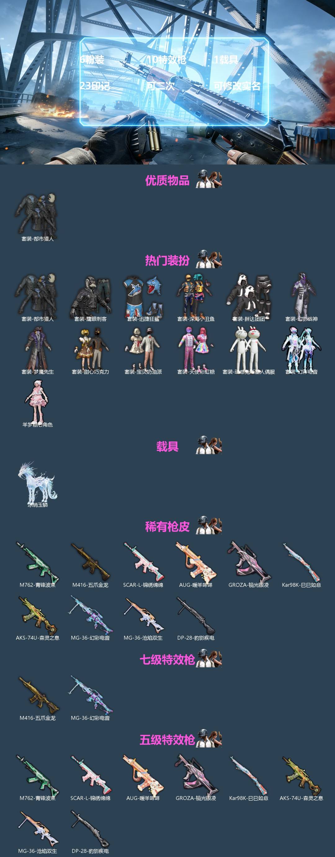 [16611079]6粉装 10特效呛 1载具 23印记 可二次 可修改实名 【热门装扮】羊梦糖心幻彩电音甜心巧克力天使彩虹糖幻影战神宝贝奶油派动感兔斯基胖达团团迅捷狂鲨鹰眼刺客梦魇先生深海小丑鱼都市猎人 【载具】冰绡玉鳞 【稀有呛皮】aug-暖羊咩咩m762-青锋波束groza-镜光银凌kar98k-巳巳如意mg-36-幻彩电音aks-74u-森灵之息mg-36-沧焰双生dp-28-豹影疾电m416五爪金龙scar-l-锦绣绵绵 【七级特效呛】七级m416-五爪金龙七级mg-36-幻彩电音 【五级特效呛】五级m762-青锋波束五级groza-镜光银凌五级kar98k-巳巳如意五级aug-暖羊咩咩五级dp-28-豹影疾电五级mg-36-沧焰双生五级aks-74u-森灵之息五级scar-l-锦绣绵绵 【紫色装扮】凌霄紫焰朱霞炽焰擎苍青焰狂鲨锋刃ss34特训套装北国孤狼冰川特警旭日情侣ss30特训套装ss31特训套装云朵鹅雪绒豹ss33特训套装青涩时光顶瓜瓜吉莉礼服涂山之恋橘黑制服沙漠兵团海岛探路者海滨突袭者柠萌假日深蓝色名流清新柠檬湖蓝色名流滨海假日滨海厨神灼焰舞者格斗先锋极速红龙怒火燎原夏日倾情夏日音浪夜莺强袭者幻影武者极地朋克战地督导探宝勇士ss23特训极速竞梦ss18特训飞驰魅影音速流光ss19特训竞技角斗士异彩先驱时空追击者暴风机械师ss16特训瑞龙福将团圆交子ss17特训炫光向阳ss22特训热血青春ss20特训酸甜橘柚夏雨游龙娇憨猪猪萌趣咩咩ss21特训炫蓝之夏牛气满满午间小调ss35特训萌鸡速递元气之梦云魄琉璃申公豹喜羊羊美羊羊懒羊羊薄荷星砂琴音绮想画境星梦书海巡游雪国风尚福星高照空岛之星竞技勇士朋克竞技达人朋克红色运动绮丽涂鸦缤纷果语耀眼新星荣耀蓝彩潮人狂沙舞者牛气冲天猎鹰破蛋小黄鸡猛禽王牌教练疯狂小兔子白熊同盟白色伏地魔破晓战魂荷畔雨呱蓝色守护者霓虹街区青年教官飞行日记骑行爱好者魅力单车黄色伏地魔黄色运动黑色伏地魔龙的传人冰河战士蝶变香桃花海霓虹极客蓝色运动迎春赐吉虎虎生威吉莉街头潮人