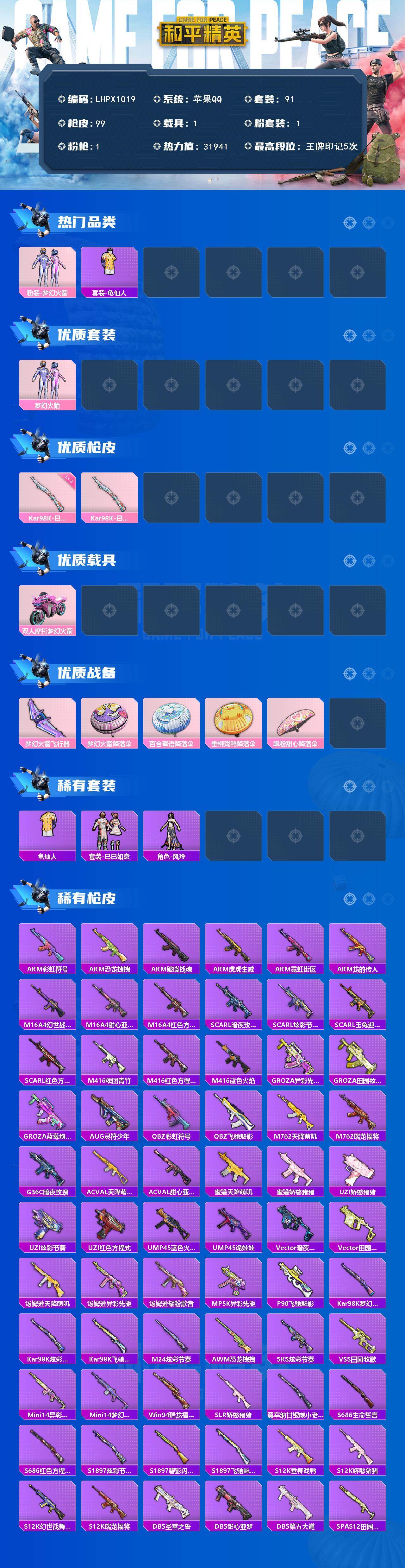 【店主推荐捡漏号!可直接换绑】苹果 手q-1粉装-1特效呛-1载具-2粉色飞行器-31941热力值-5王牌印记-91套装-99呛皮【热门品类】:粉装-梦幻火箭,套装-龟仙人【粉色套装】:粉装-梦幻火箭【粉色呛皮等级】:kar98k-巳巳如意三级【粉色载具】:双人摩托-梦幻火箭【粉色呛皮】:kar