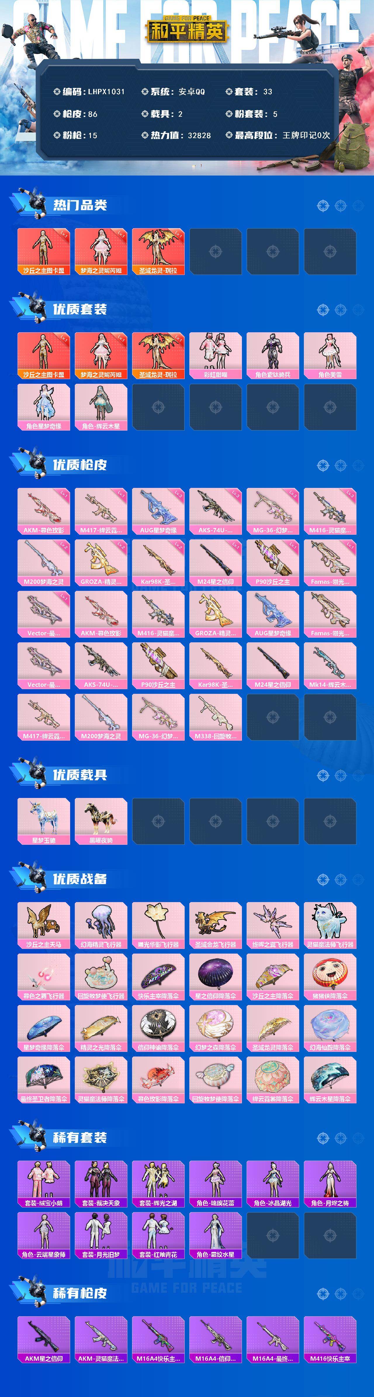 2载具-33套装-86呛皮-【特价出售/店主推荐】安卓 手q-3神装-5粉装-15特效呛-2载具-9粉色飞行器-32828热力值-2王牌印记-33套装-86呛皮 【红色神装等级】:圣域龙灵-瑞拉一级,梦海之灵-妮芮妲一级,沙丘之主-图卡盟一级 【红色角色神装】:圣域龙灵-瑞拉,梦海之灵-妮芮妲,沙丘之主-图卡盟 【