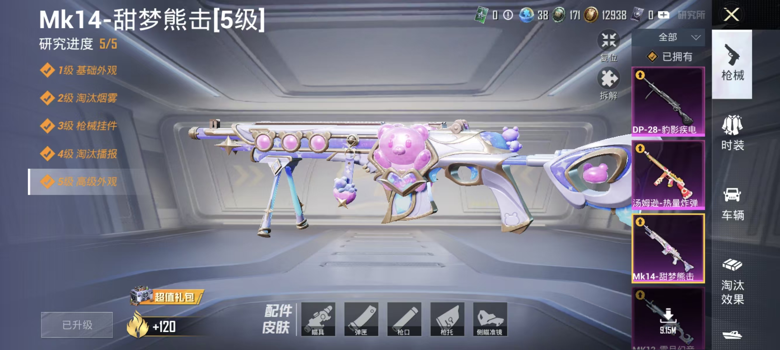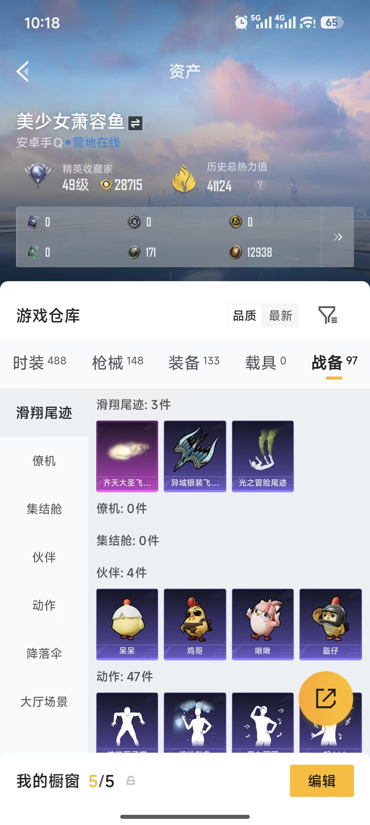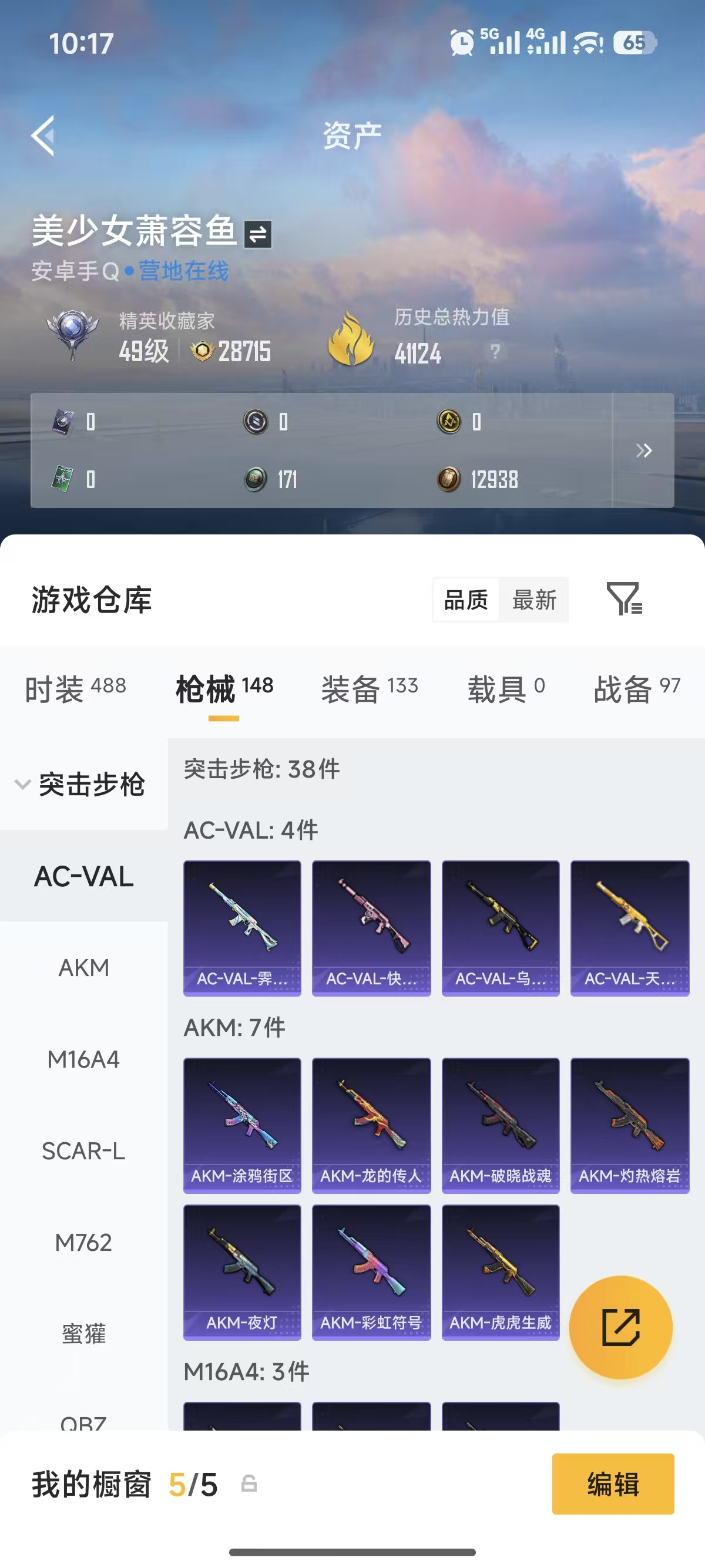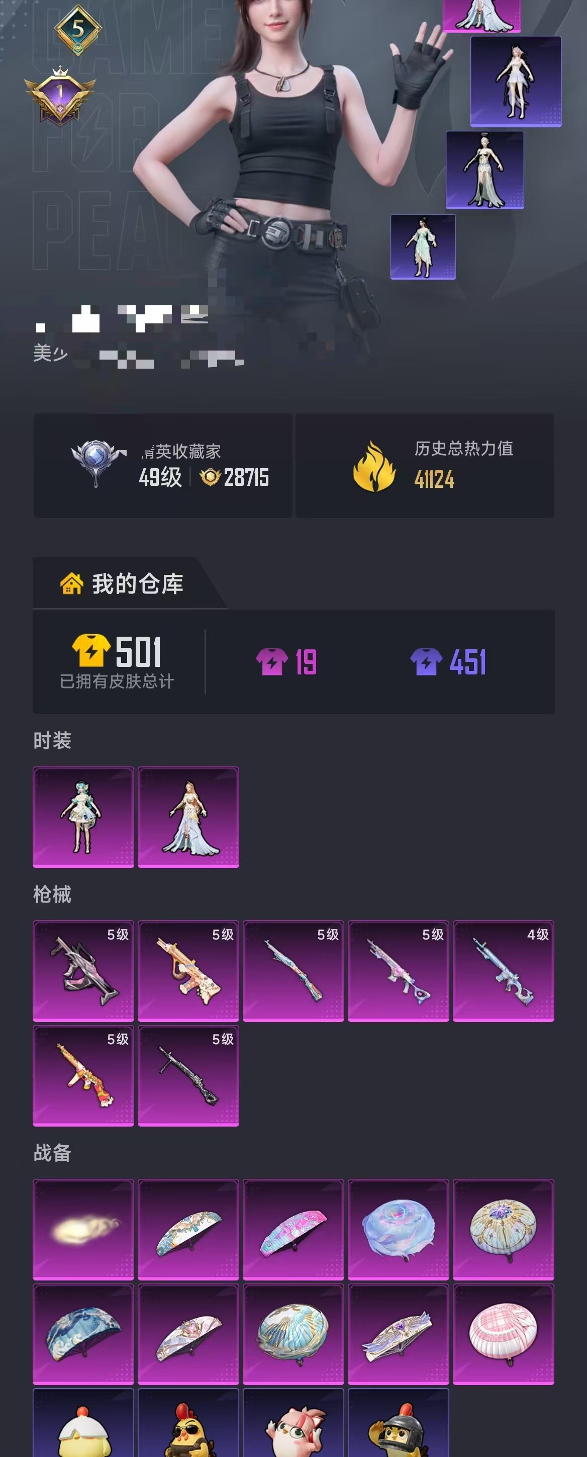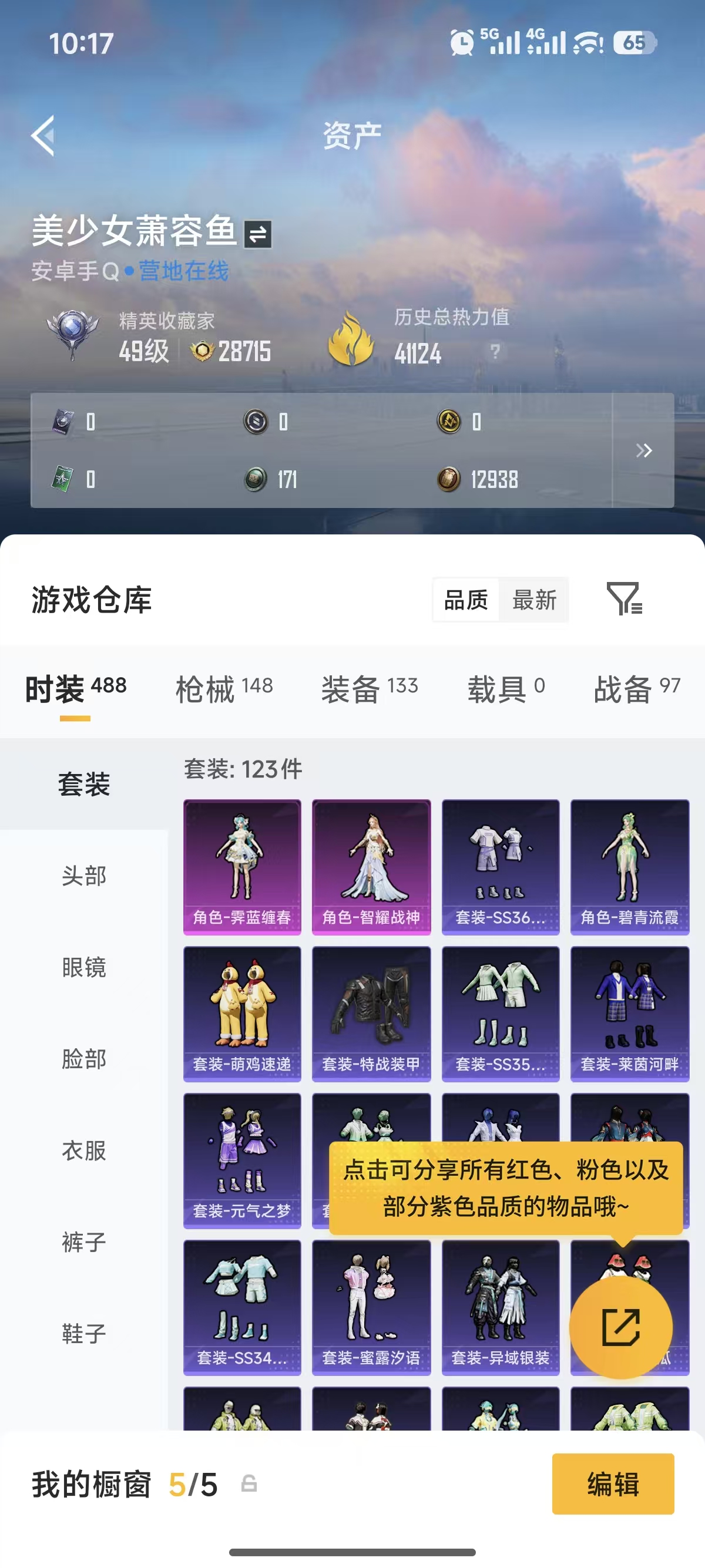 0载具-123套装-148呛皮-【1粉装7特效呛可秒换绑】 安卓q区-41124热力值-5印记-123套装-148呛皮 【1粉装】 角色-智耀战神【7特效呛】 mk12-雪月幻音4级 mk14-甜梦熊击5级 汤姆逊-热量炸弹5级 groza-镜光银凌5级 kar98k-巳巳如意5级 dp-28-豹影疾电5级 aug-暖羊咩咩5级【27热门】 m416-蓝色火焰 groza-彩虹符号