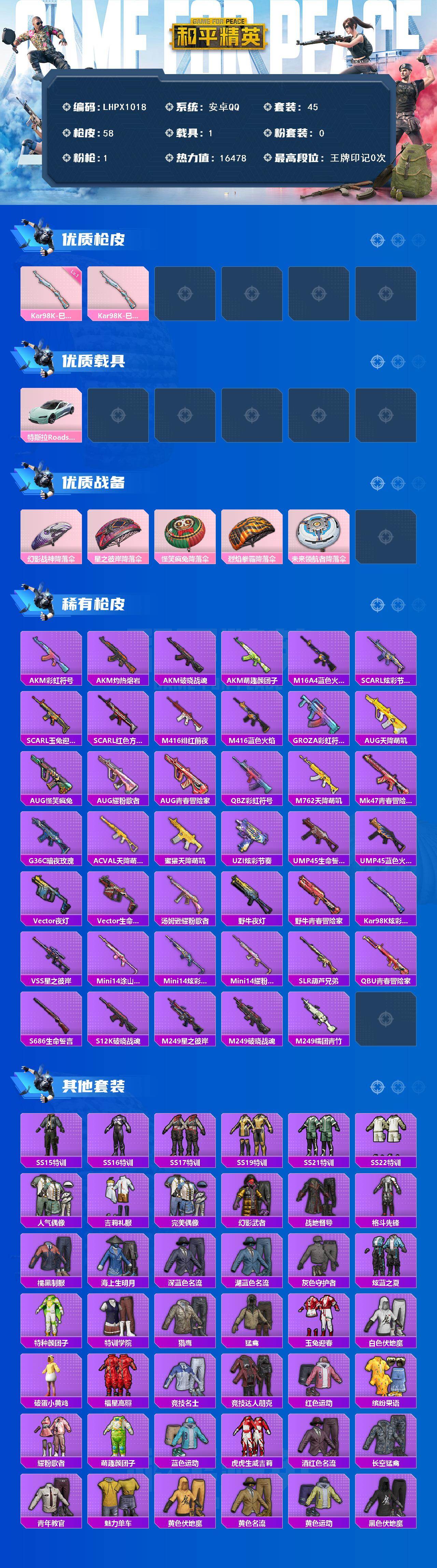 【店主推荐捡漏号!可直接换绑】安卓 手q-0粉装-1特效呛-1载具-0粉色飞行器-16478热力值-1王牌印记-45套装-58呛皮【粉色呛皮等级】:kar98k-巳巳如意一级【粉色载具】:特斯拉roadster(水滴蓝)【粉色呛皮】:kar98k-巳巳如意