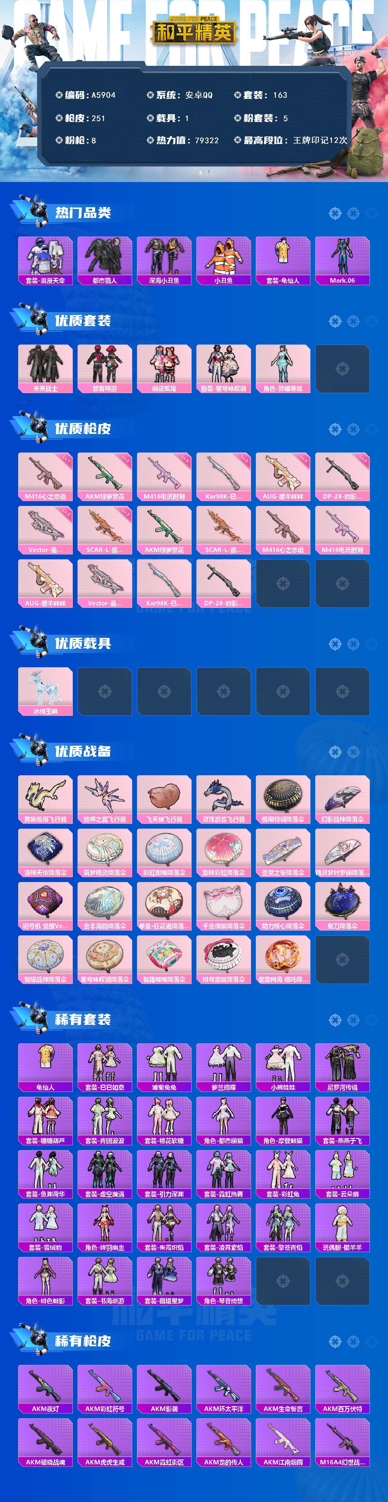 [16615300]安卓【呛皮号 m416-心之恋语七级/m416-电玩时刻五级/aug-暖羊咩咩五级/scar-l-魔童闹海 哪吒三级/都市猎人/蓝螳螂/放客神游】 手q-5粉装-8特效呛-1载具-5粉色飞行器-79322热力值-12王牌印记-163套装-251呛皮 【热门品类】:套装-浪漫天命,套装-都市猎人,套装-深海小丑鱼,套装-小丑鱼,套装-龟仙人,角色-mark.06 【粉色套装】:粉装-未来战士,粉装-放客神游,粉装-俏皮狐尾,粉装-星穹咏叹调,角色-异瞳寒姬 【粉色呛皮等级】:akm-绿萝繁花五级,scar-l-魔童闹海 哪吒三级,m416-心之恋语七级,m416-电玩时刻五级,aug-暖羊咩咩五级,vect-最终圣卫者三级,kar98k-巳巳如意五级,dp-28-豹影疾电五级 【粉色载具】:冰绡玉鳞 【粉色呛皮】:akm-绿萝繁花,scar-l-魔童闹海 哪吒,m416-心之恋语,m416-电玩时刻,aug-暖羊咩咩,vect-最终圣卫者,kar98k-巳巳如意,dp-28-豹影疾电 【粉色飞行器】:黄族统领飞行器,终晖之翼飞行器,飞天猪飞行器,灵珠游龙飞行器 【粉色降落伞】:极限特训降落伞,幻影战神降落伞,洛神天依降落伞,筑梦精灵降落伞,彩虹甜喵降落伞,旋转彩虹降落伞,圣堂之誓降落伞,精灵梦叶罗丽降落伞,初号机 觉醒ver.降落伞,金丰海韵降落伞,拳皇·狂花道降落伞,千金淑猫降落伞,动力核心降落伞,鬼刀降落伞,智耀战神降落伞,星穹咏叹调降落伞,智趣喵喵降落伞,绯穹魔姬降落伞,魔童闹海 哪吒降落伞,炫彩糖果降落伞 【稀有套装】:套装-龟仙人,套装-巳巳如意,套装-雪国风尚,套装-炫彩糖果,套装-雏菊兔兔,套装-萝兰蝴蝶,套装-小熊娃娃,套装-尼罗河传说,套装-糖糖葫芦,套装-青团波波,套装-棉花软糖,角色-都市丽猫,角色-摩登魅猫,套装-燕燕于飞,套装-鱼渊荷华,套装-虚空漩涡,套装-引力深渊,套装-霓虹热舞,套装-彩虹兔,套装-云朵鹅,套装-雪绒豹,角色-绛羽幽主,套装-朱霞炽焰,套装-凌霄紫焰,套装-擎苍青焰,玩偶服-懒羊羊,角色-绯色魅影,套装-书海巡游,套装-画境星梦,套装-琴音绮想 【稀有呛皮】:akm-夜灯,akm-彩虹符号,akm-影袭,akm-江南烟雨,akm-环太平洋,akm-生命誓言,akm-
