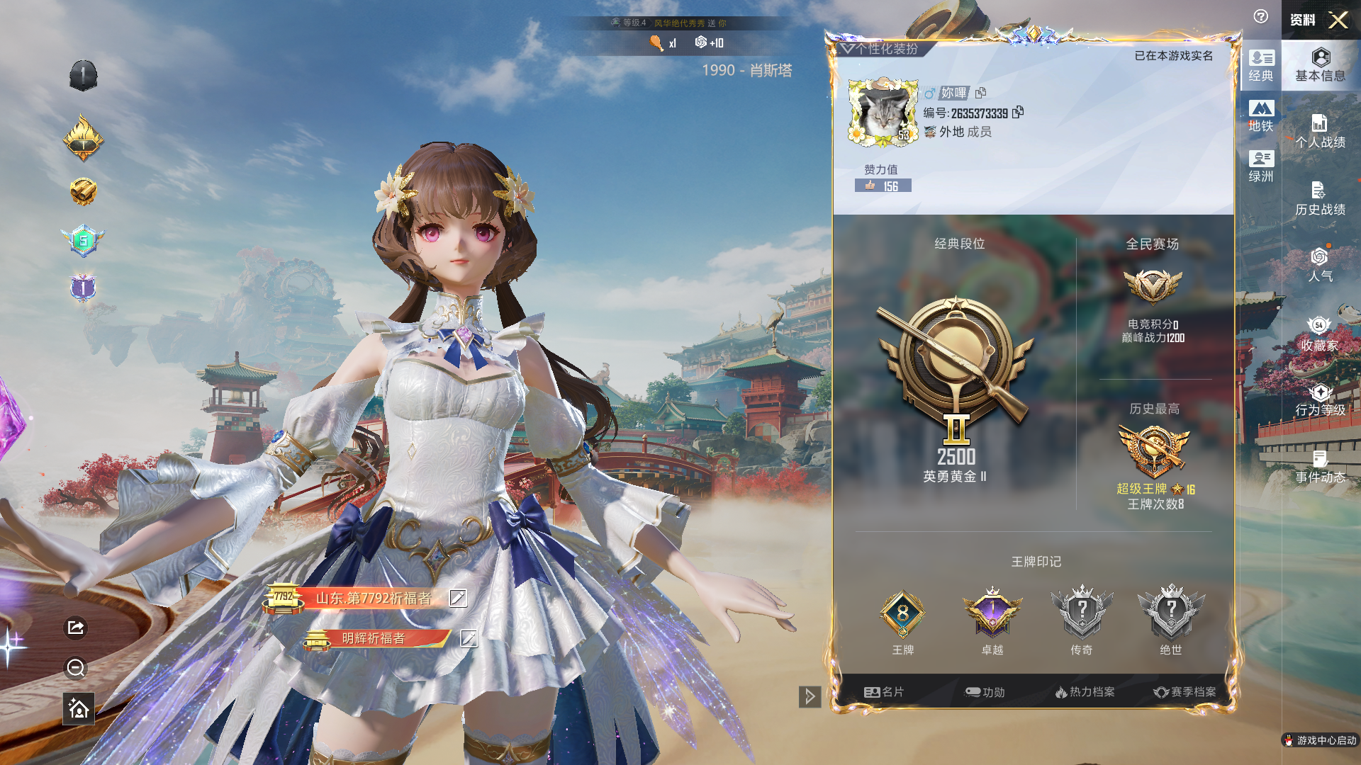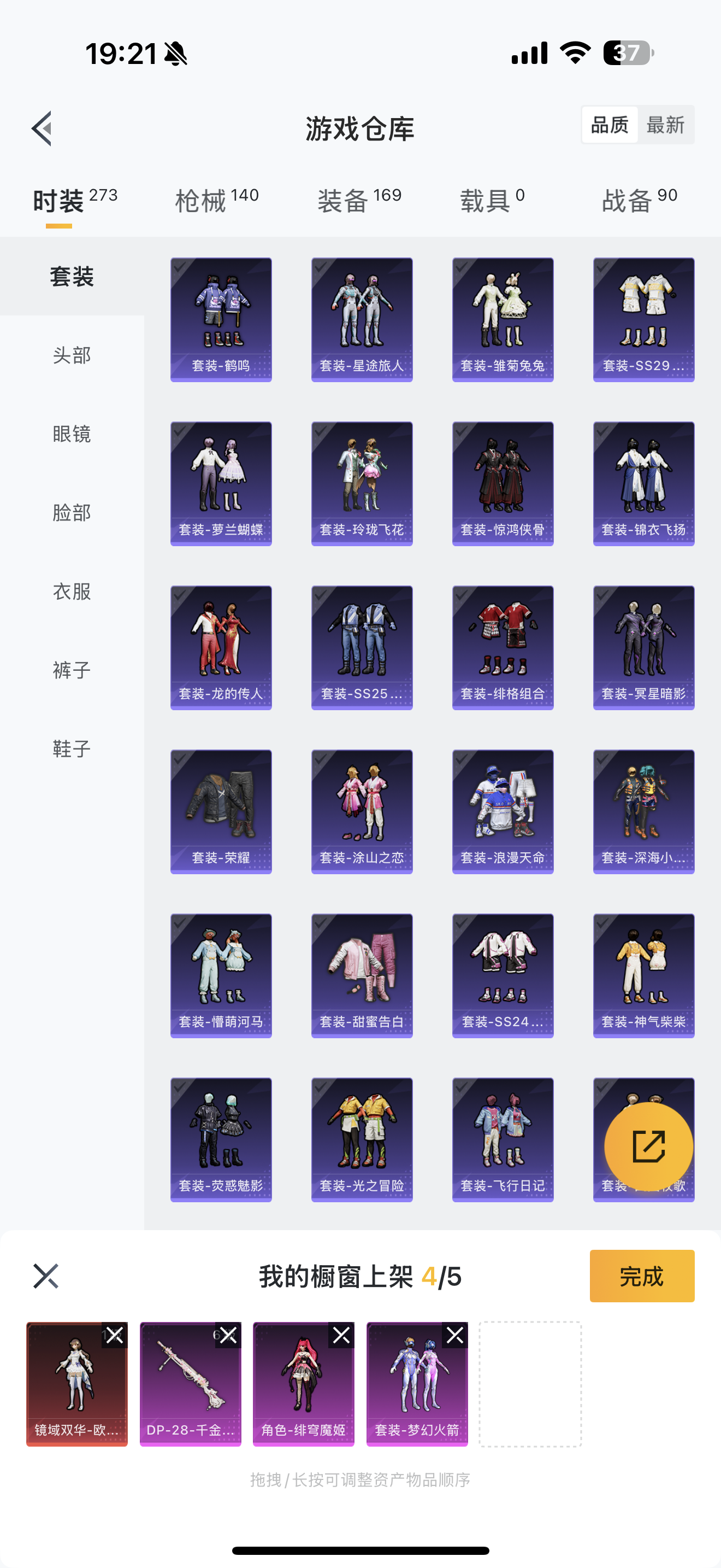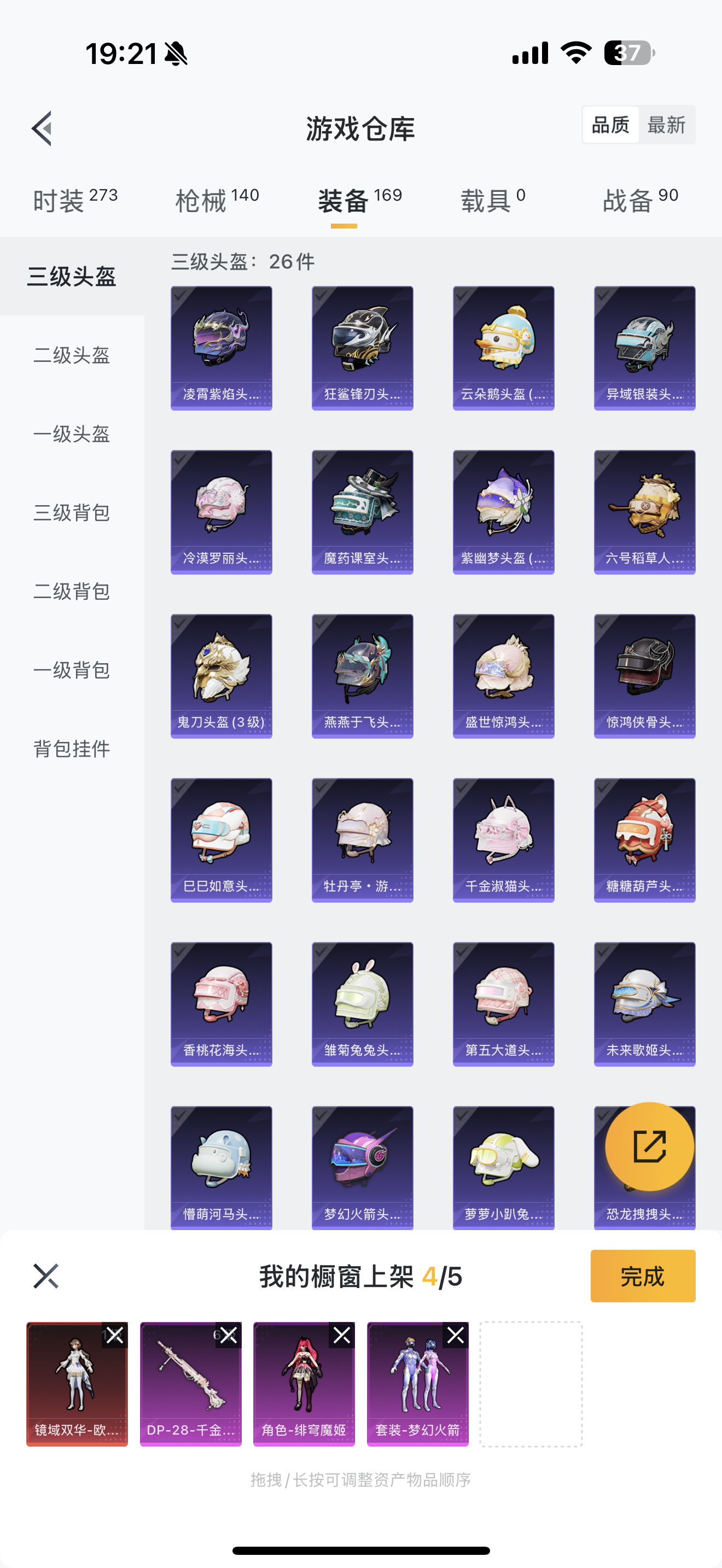 0载具-0套装-140呛皮-实名: 可修改 时装数: 273 呛械数: 140 战备数: 90 神级装扮: 镜域双华-欧若拉 热门装扮: 梦幻火箭新101深海小丑鱼猪猪侠萨利娅绯穹魔姬 稀有呛皮: dp-28-千金淑猫groza-镜光银凌kar98k-巳巳如意aug-暖羊咩咩