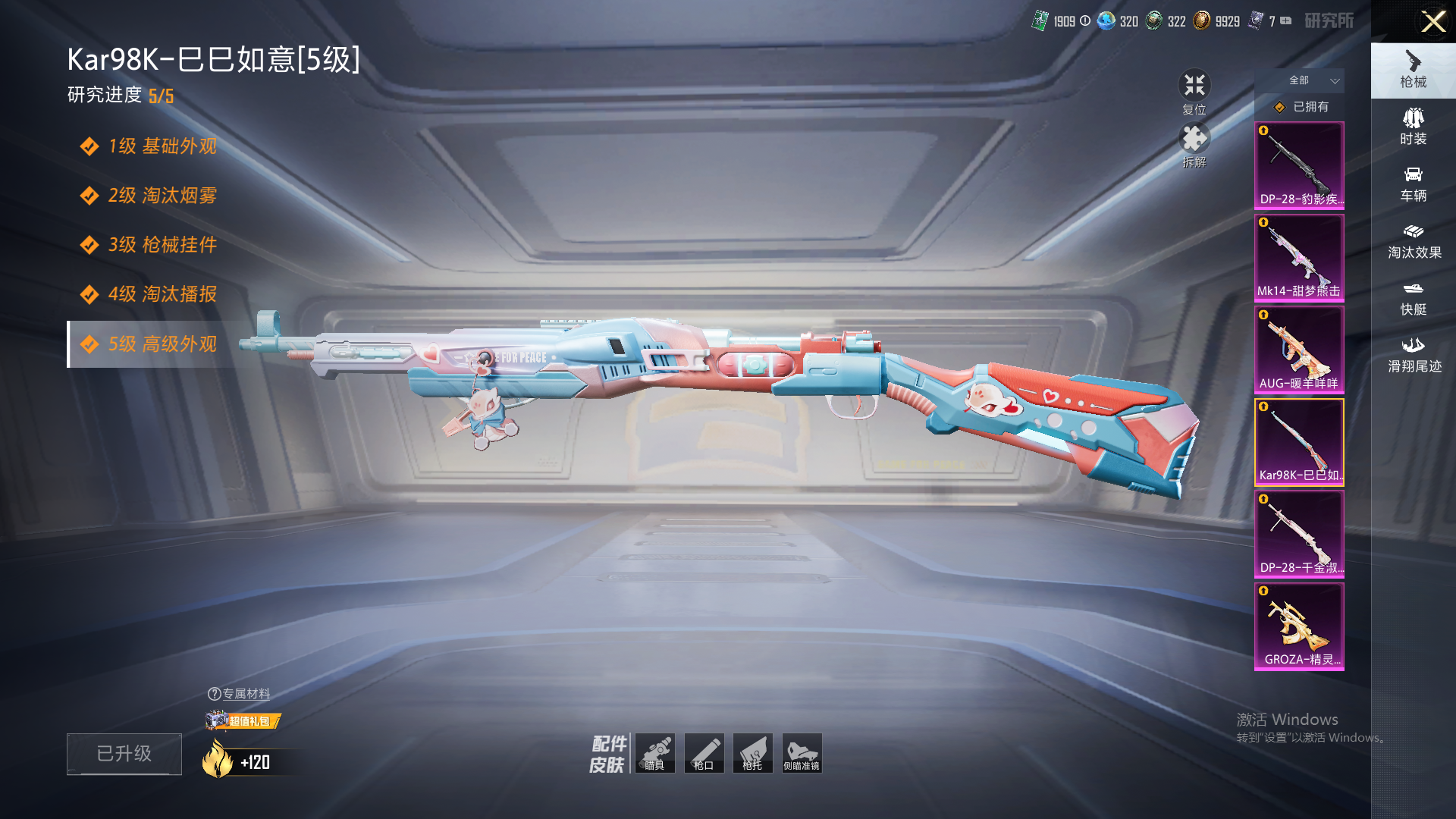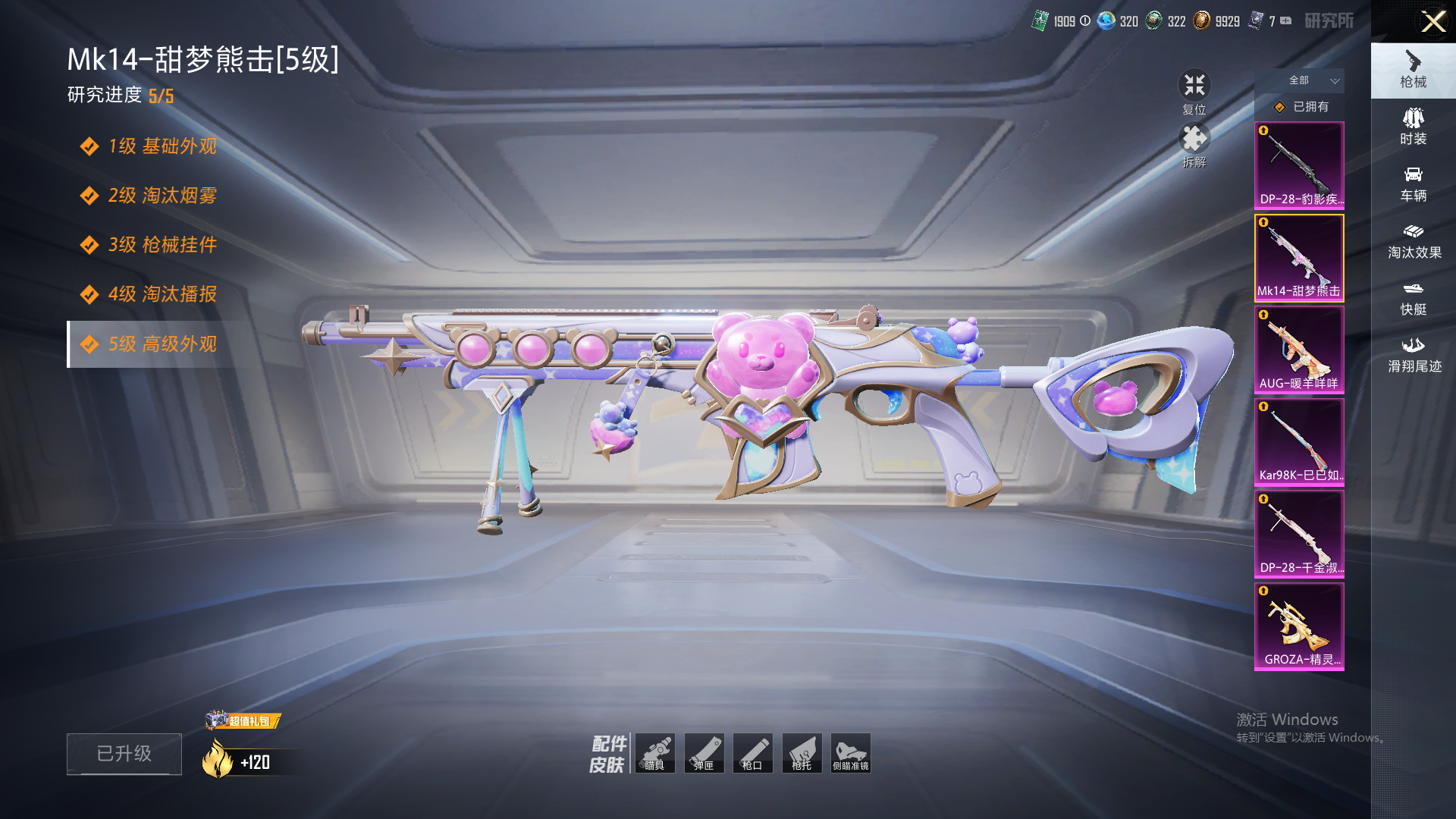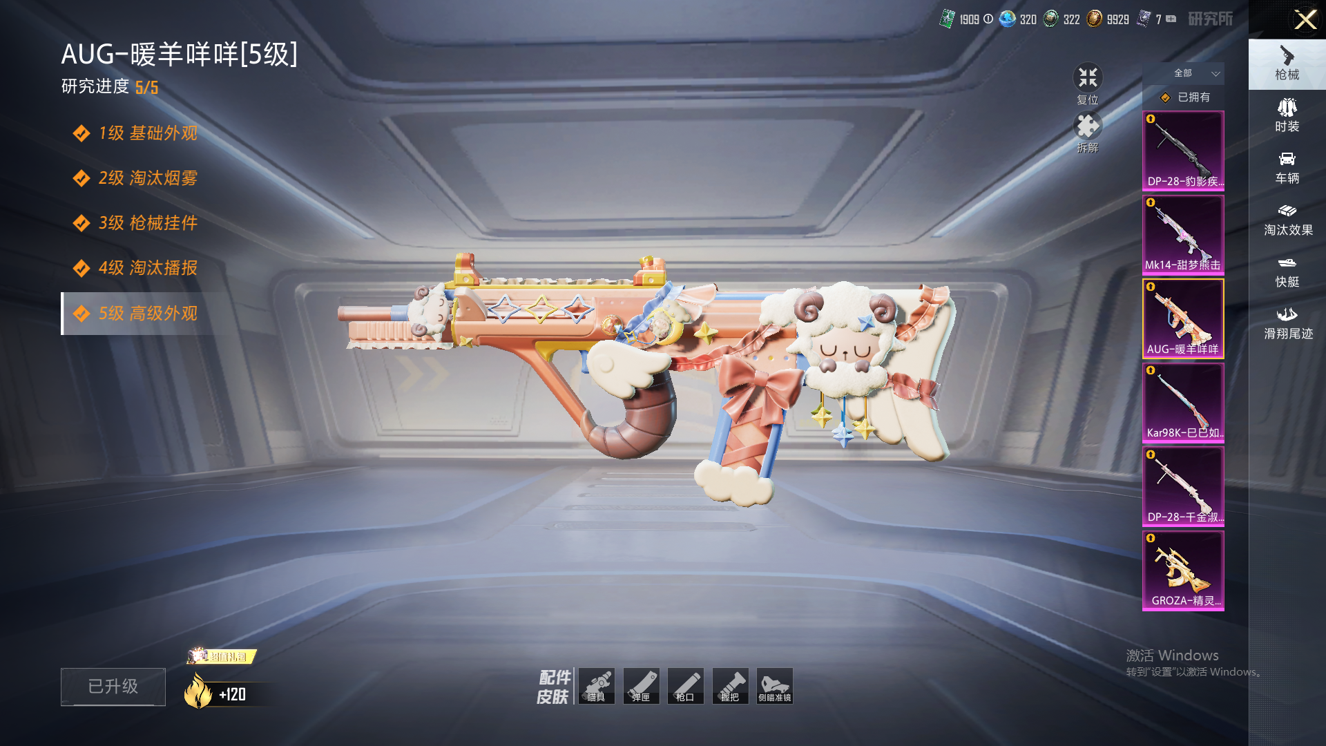 【精品号手慢无】可换绑 时装318 呛械144 载具1 战备86 英伦信使千金淑猫雪月幻音 星河领航磐石银 七级dp-28-千金淑猫 五级kar98k-巳巳如意五级aug-暖羊咩咩五级14-甜梦熊击五级dp-28-豹影疾电 三级groza-精灵之光
