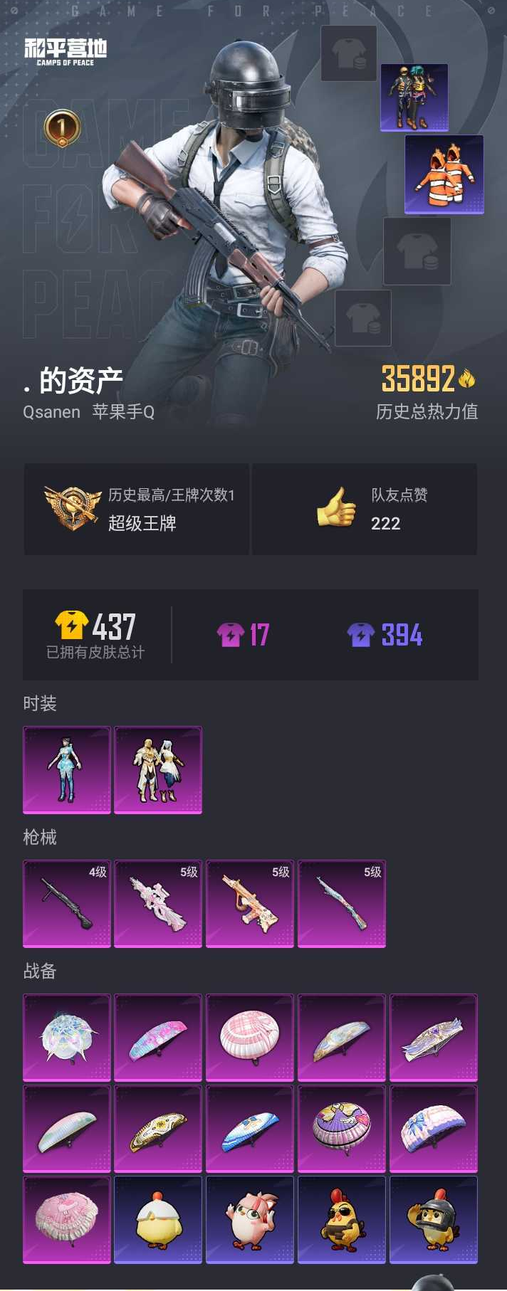 【和平精英】【lyhp21972】2粉装,4特效呛,0载具,历史最高段位:超级王牌 王牌印记1次 热力值:35892,97套装,125呛械,137装备,64战备;套装:套装-天星战神,角色-异瞳寒姬,套装-特训学院,套装-猎鹰,套装-青年教官,套装-橘黑制服,套装-红色运动,套装-黄色运动,套装-蓝色运动,套装-黄色伏地魔,套装-白色伏地魔,套装-黑色伏地魔,套装-竞技名士,套装-酒红色名流,套装-猛禽,套装-长空猛禽,套装-漫步者,套装-海岛探路者,套装-旭日情侣,套装-冷焰舞者,套装-特战装甲,套装-战地督导,套装-活力之心,套装-燃烧卡路里,套装-沙漠毒蛇,套装-鹰眼刺客,套装-冰冻风暴,套装-完美偶像,套装-幻影武者,套装-魅力单车,套装-绮丽涂鸦,套装-耀眼新星,套装-竞技达人朋克,套装-都市魅力,套装-火舞潮人,套装-清新柠檬,套装-血色贵族,套装-弄潮海豚,套装-深海小丑鱼,套装-缤纷果语,套装-龙魂突击队,套装-冰川特警,套装-元素星魂,套装-幻影公爵,套装-极速红龙,套装-小丑鱼,套装-黑夜传说,套装-破蛋小黄鸡,套装-鹤鸣,套装-霓虹街区,套装-白糯汤圆,套装-战术大师,套装-耀粉歌者,套装-绯格组合,套装-ss23特训,套装-香榭午后,套装-白兰地假日,套装-神气柴柴,套装-懵萌河马,套装-妙红点点,套装-幻彩翩翩,套装-青玉碎影,套装-ss24特训,套装-荧惑魅影,套装-龟仙人,套装-涂山之恋,套装-ss25特训,套装-惊鸿侠骨,套装-锦衣飞扬,套装-云霞荷露,套装-元气发射,套装-果汁能量,套装-龙的传人,套装-ss26特训,套装-快闪甜心,套装-春光漫游,套装-空岛之星,套装-云魄琉璃,套装-ss27特训,套装-ss28特训,套装-街头风暴,套装-海盐绵绵冰,套装-ss29特训,角色-绯色魅影,套装-ss31特训,套装-智谋强哥,套装-ss33特训,套装-巳巳如意,套装-ss32特训,套装-顶瓜瓜,套装-ss34特训,套装-薄荷星砂,套装-ss35特训,套装-琴音绮想,套装-画境星梦,套装-ss37特训,套装-ss36特训;呛皮:scar-l-红色方程式,scar-l-夜灯,scar-l-炫彩节奏,scar-l-甜蜜旋律,scar-l-海盐豹豹,ace32-画境星梦,ace32-冰晶雪宝,5级aug-暖羊咩咩,aug-耀粉歌者,aug-天降萌叽,aug-紫晶流影,mk47-妙红点点,mk47-炫光之旅,famas-乌木金纹,akm-缤纷海域,akm-破晓战魂,akm-彩虹符号,akm-龙的传人,蜜獾-天降萌叽,蜜獾-乌木金纹,m16a4-快乐主宰,m16a4-冰河战士,ac-val-乌木金纹,ac-val-天降萌叽,ac-val-快闪甜心,groza-懵萌河马,groza-2b战斗服款,groza-福马献瑞,m416-诡夜天鹅,m416-糯团青竹,q-银碳小老虎,g36c-懵萌河马,m200-仲夏莫吉托,m200-梦幻舞会,m200-惊鸿侠骨,m200-乌木金纹,5级kar98k-巳巳如意,amr-妙红点点,amr-乌木金纹,莫辛纳甘-乌木金纹,莫辛纳甘-懵萌河马,m24-影袭,m24-仲夏莫吉托,win94-乌木金纹,mini14-穿刺龙虾,mini14-香桃花海,mini14-鸡智如我,vss-彩虹符号,sks-迅猛狂鲨,sks-炫彩节奏,mk20-h-莲影清波,mk20-h-快闪甜心,mk20-h-狂鲨锋刃,mk20-h-乌木金纹,mk14-冰河战士,mk14-薄荷星砂,slr-乌木金纹,mk12-乌木金纹,qbu-飒粉甜心,m1加兰德-画境星梦,m417-惊鸿侠骨,mp5k-飒粉甜心,mp5k-画境星梦,mp5k-乌木金纹,汤姆逊-耀粉歌者,汤姆逊-炫彩节奏,汤姆逊-天降萌叽,uzi-红色方程式,uzi-影袭,uzi-天降萌叽,uzi-冰河战士,uzi-啾咪啾咪,uzi-炫彩糖果,ump45-夜灯,ump45-仲夏莫吉托,ump45-涂山之恋,ump45-海盐豹豹,ump45-极意拳锋,vect-生命誓言,vect-彩虹符号,5级p90-冷漠罗丽,p90-快闪甜心,p90-玩趣呆呆,p90-巳巳如意,p90-紫矿核心,p90-乌木金纹,aks-74u-乌木金纹,s686-生命誓言,s686-巳巳如意,aa12-g-橘猫汽水,aa12-g-画境星梦,s12k-夜灯,s12k-音爆索尼克,s12k-玩趣呆呆,s1897-小鹦鹉bebe,s1897-精灵梦叶罗丽,dbs-乌木金纹,m249-彩虹符号,m249-糯团青竹,m249-妙红点点,4级dp-28-豹影疾电,dp-28-彩虹符号,mg-36-薄荷星砂,pkm-懵萌河马,mg3-幻世战舞者,mg3-妙红点点,mg3-惊鸿侠骨,蝎式手呛-金丰海韵,沙墨之鹦-快闪甜心,p1911-创世·救赎,平底锅-五爪金龙,平底锅-妙红点点,平底锅-懵萌河马,平底锅-惊鸿侠骨,平底锅-快闪甜心,平底锅-空岛之星,平底锅-画境星梦,爆炸猎弓-惊鸿侠骨,燃烧瓶-福马献瑞,盐雾蛋-冰氧夏日,破片手留单-呆爆全场,破片手留单-拽到爆炸,破片手留单-巳巳如意,十子怒-异瞳寒姬,铝热弹-炫彩糖果;降落伞:黄色滑翔尾迹,登顶巅峰飞行器,马上有福飞行器; 详情看图2粉装4特效呛 异瞳寒姬 5级p90冷漠罗丽 满级aug地铁满天赋