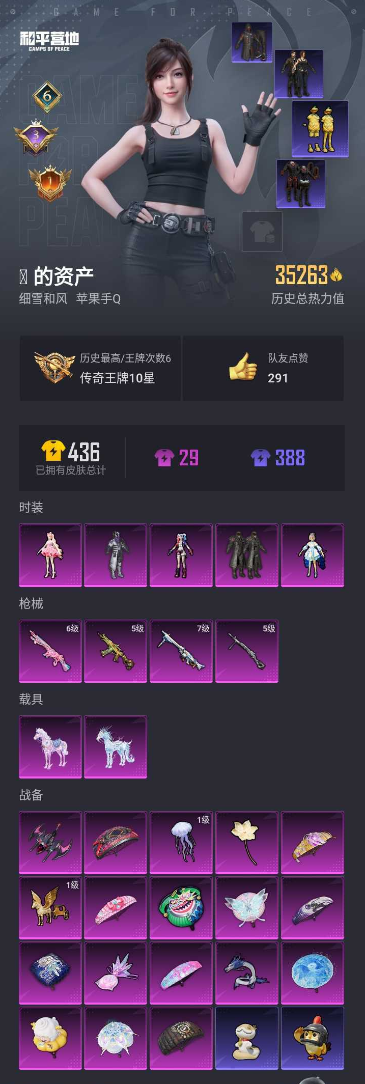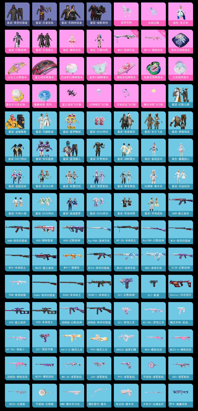 【和平精英】【lyhp21959】5粉装,4特效呛,2载具,历史最高段位:传奇王牌10星 王牌印记6次 热力值:35263,68套装,127呛械,160装备,68战备;套装:套装-幻影战神,套装-未来战士,角色-洛天依,角色-樱桃泡泡,角色-狂魅哈莉,套装-深蓝色名流,套装-长空猛禽,套装-旭日情侣,套装-贵族骑装,套装-活力之心,套装-街头潮人,套装-魅力单车,套装-幻世保卫者,套装-奇异狩猎者,套装-金耀舞者,套装-蓝调潮人,套装-暗影哥特,套装-青涩时光,套装-缤纷果语,套装-龙魂突击队,套装-元素星魂,套装-幻影公爵,套装-忍者信条,套装-旷野奇兵,套装-东方飞龙,套装-天网终结者,套装-破蛋小黄鸡,套装-疯狂小兔子,套装-霓虹街区,套装-天籁歌者,套装-电音精灵,套装-吉莉礼服,套装-快乐星愿,套装-星梦畅游,套装-光之冒险,套装-柠萌假日,套装-龙的传人,套装-ss26特训,套装-空岛之星,套装-ss27特训,套装-老实芭蕉,套装-街头风暴,套装-海盐绵绵冰,套装-湖畔霞光,角色-蜜桃派对,角色-糖霜甜心,套装-诡诞巡游,套装-青翼流星,套装-混沌火种,套装-炫彩糖果,玩偶服-喜羊羊,套装-ss34特训,套装-擎苍青焰,套装-朱霞炽焰,套装-凌霄紫焰,套装-ss35特训,套装-午间小调,套装-风迹短诗,套装-琴音绮想,套装-画境星梦,套装-书海巡游,套装-阳光菠萝,套装-ss37特训,套装-ss36特训,套装-理性主义,套装-红釉青花,套装-雪国风尚,套装-萌鸡速递;呛皮:groza-海盐豹豹,groza-晶梦幻蝶,groza-拉面少女,groza-福马献瑞,scar-l-未来战士,scar-l-彩虹符号,scar-l-海盐豹豹,scar-l-绿洲时空,m16a4-幻世战舞者,m16a4-冰河战士,m16a4-雨过天青,akm-奇异狩猎者,akm-破晓战魂,akm-星之彼岸,akm-霓彩脉冲,famas-霓彩脉冲,蜜獾-天降萌叽,蜜獾-风迹短诗,蜜獾-冰澜龙吟,ac-val-梦海之灵,ac-val-兔兔小魔女,aug-幻影战神,aug-终结者,aug-耀粉歌者,aug-冰晶雪宝,q-洛神天依,arx-凌霄紫焰,mk47-洛神天依,mk47-风迹短诗,ace32-画境星梦,ace32-冰晶雪宝,m416-糯团青竹,m762-奇异狩猎者,kar98k-幻影战神,kar98k-彩虹符号,kar98k-洛神天依,m24-奇异狩猎者,m24-未来战士,m24-樱桃泡泡,amr-喜羊羊与灰太狼,amr-雨过天青,amr-乌木金纹,svd-霓彩脉冲,m200-爆裂游戏,m200-无垠阁,win94-乌木金纹,莫辛纳甘-风迹短诗,slr-霓彩脉冲,slr-乌木金纹,mk12-风迹短诗,mk12-乌木金纹,vss-未来战士,vss-星之彼岸,m1加兰德-画境星梦,m417-猪猪侠,mk20-h-樱桃泡泡,mk20-h-狂鲨锋刃,6级mk14-樱桃泡泡,mk14-冰河战士,mk14-阳光菠萝,uzi-影袭,uzi-幻影战神,uzi-冰河战士,uzi-啾咪啾咪,uzi-梦海之灵,uzi-霓彩节奏,uzi-炫彩糖果,vect-生命誓言,vect-彩虹符号,vect-风花雪月,野牛-魔童闹海 敖闰,汤姆逊-奇异狩猎者,汤姆逊-幻影战神,汤姆逊-天降萌叽,汤姆逊-樱桃泡泡,ump45-蓝色火焰,ump45-极意拳锋,5级aks-74u-森灵之息,aks-74u-乌木金纹,mp5k-画境星梦,mp5k-乌木金纹,p90-精灵之光,js9-凌霄紫焰,s686-奇异狩猎者,s686-未来战士,s686-生命誓言,s686-终结者,dbs-风迹短诗,dbs-乌木金纹,s12k-幻影战神,s12k-霓彩脉冲,aa12-g-精灵之光,aa12-g-橘猫汽水,aa12-g-画境星梦,aa12-g-雨过天青,spas-12-狂鲨锋刃,m249-星之彼岸,m249-拉面少女,m249-冰晶雪宝,pkm-蜜语绒猫,pkm-雨过天青,5级dp-28-豹影疾电,dp-28-未来战士,7级mg3-洛神天依,mg3-幻世战舞者,mg-36-凌霄紫焰,mg-36-薄荷星砂,电击呛-喜羊羊与灰太狼,沙墨之鹦-雨过天青,p92-凌霄紫焰,信号呛-异瞳寒姬,蝎式手呛-奶油梦幻熊,平底锅-终结者,平底锅-空岛之星,平底锅-无垠阁,平底锅-凌霄紫焰,平底锅-画境星梦,大砍刀-冰澜龙吟,撬棍-冰晶雪宝,破片手留单-呆爆全场,破片手留单-拽到爆炸,破片手留单-爆破雪人,燃烧瓶-福马献瑞,燃点复合弓-罪夜之冕,铝热弹-炫彩糖果,盐雾蛋-冰澜龙吟,爆炸猎弓-喜羊羊与灰太狼;载具:晶梦灵驹,冰绡玉鳞;降落伞:星之彼岸飞行器,曦光华影飞行器,炫彩糖果飞行器,灵珠游龙飞行器,沙丘之主天马,幻海精灵飞行器,粉色滑翔尾迹,空岛之星尾迹,鸡智如我飞行器,马上有福飞行器; 详情看图5粉装4特效呛2载具 樱桃泡泡 幻影战神 狂魅哈莉 洛天依 天网 阳光菠萝 暗影哥特 6级mk14樱桃泡泡 满级mg3洛神天依 冰销玉麟 晶梦灵驹