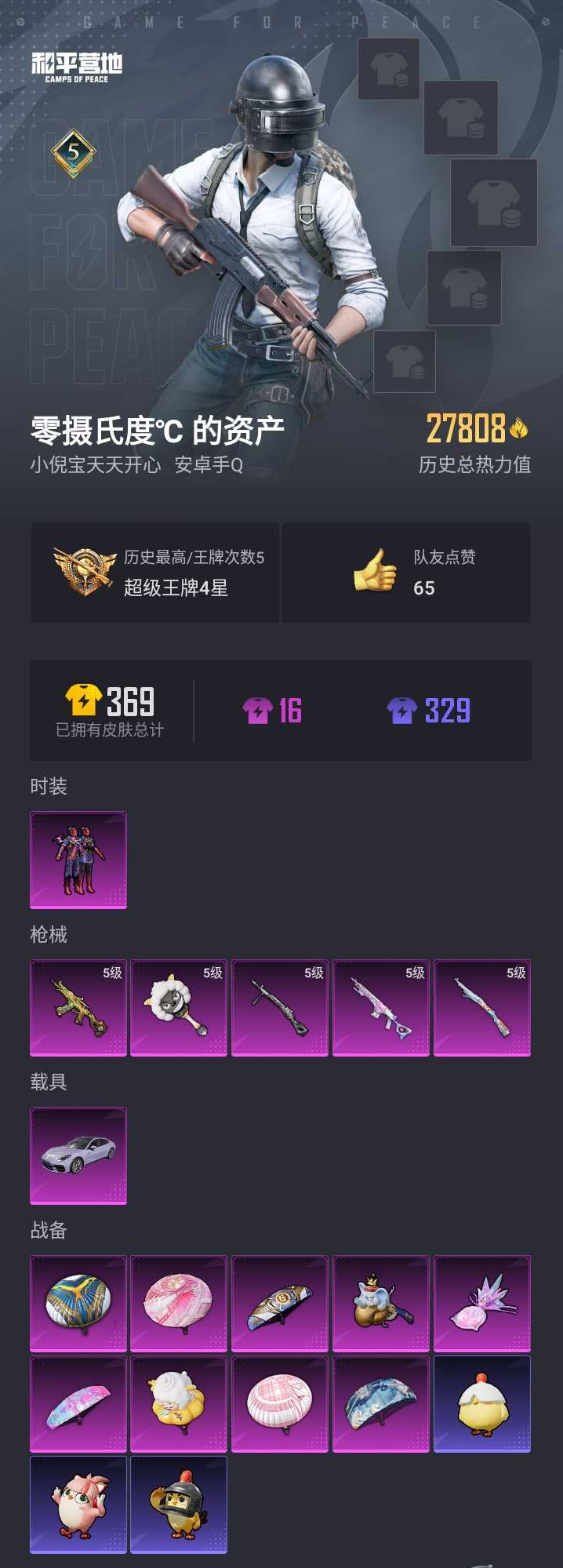 【和平精英】【lyhp21950】1粉装,5特效呛,1载具,历史最高段位:超级王牌4星 王牌印记5次 热力值:27808,86套装,90呛械,116装备,62战备;套装:套装-星之彼岸,套装-特训学院,套装-青年教官,套装-橘黑制服,套装-红色运动,套装-黄色运动,套装-蓝色运动,套装-黄色伏地魔,套装-白色伏地魔,套装-黑色伏地魔,套装-竞技名士,套装-深蓝色名流,套装-酒红色名流,套装-湖蓝色名流,套装-猛禽,套装-长空猛禽,套装-海岛探路者,套装-沙漠探路者,套装-旭日情侣,套装-冷焰舞者,套装-灼焰舞者,套装-特战装甲,套装-人气偶像,套装-街头潮人,套装-暗金炫舞,套装-蓝彩潮人,套装-魅力单车,套装-绮丽涂鸦,套装-竞技达人朋克,套装-破晓战魂,套装-森林游猎者,套装-都市魅力,套装-青涩时光,套装-缤纷果语,套装-滨海厨神,套装-龙魂突击队,套装-元素星魂,套装-极速红龙,套装-粉红小猪,套装-破蛋小黄鸡,套装-顽皮玉兔,套装-白糯汤圆,套装-战术大师,套装-耀粉歌者,套装-王牌教练,套装-冰河战士,套装-云魄琉璃,套装-恋语绒绒,套装-ss28特训,套装-街头风暴,套装-海盐绵绵冰,套装-蝶变,套装-ss29特训,角色-绯色魅影,套装-异域银装,套装-星途旅人,套装-ss30特训,角色-绛羽幽主,套装-ss31特训,套装-智谋强哥,角色-海琴烟,套装-ss33特训,套装-巳巳如意,套装-ss32特训,套装-青翼流星,套装-顶瓜瓜,套装-狂鲨锋刃,套装-大橘大利,角色-时希公主,套装-炫彩糖果,套装-元气之梦,套装-ss34特训,套装-游乐,套装-薄荷星砂,套装-ss35特训,套装-午间小调,套装-风迹短诗,套装-琴音绮想,套装-画境星梦,套装-书海巡游,套装-ss37特训,套装-ss36特训,角色-霜刃之御,套装-雪国风尚,套装-萌鸡速递,套装-玲珑侠影;呛皮:蜜獾-天降萌叽,蜜獾-风迹短诗,蜜獾-乌木金纹,akm-破晓战魂,akm-环太平洋,akm-霓彩脉冲,m16a4-冰河战士,aug-耀粉歌者,aug-天降萌叽,aug-异域银装,aug-冰晶雪宝,groza-影袭,groza-海盐豹豹,groza-紫矿核心,famas-突变脉冲,famas-霓彩脉冲,famas-乌木金纹,scar-l-夜灯,scar-l-海盐豹豹,mk47-风迹短诗,ace32-画境星梦,ace32-冰晶雪宝,m416-红色方程式,q-彩虹符号,5级kar98k-巳巳如意,amr-喜羊羊与灰太狼,莫辛纳甘-风迹短诗,m200-乌木金纹,svd-霓彩脉冲,win94-乌木金纹,awm-天降萌叽,mini14-香桃花海,mini14-鸡智如我,m1加兰德-画境星梦,slr-霓彩脉冲,slr-乌木金纹,mk20-h-星途旅人,mk20-h-狂鲨锋刃,mk20-h-乌木金纹,mk12-风迹短诗,mk12-乌木金纹,vss-香桃花海,5级mk14-甜梦熊击,mk14-冰河战士,mk14-薄荷星砂,mk14-紫晶流影,sks-炫彩节奏,m417-玩趣呆呆,5级aks-74u-森灵之息,aks-74u-鸡智如我,aks-74u-乌木金纹,ump45-夜灯,ump45-海盐豹豹,p90-玩趣呆呆,p90-巳巳如意,p90-紫矿核心,汤姆逊-环太平洋,uzi-炫彩糖果,mp5k-画境星梦,aa12-g-画境星梦,spas-12-狂鲨锋刃,spas-12-福马献瑞,spas-12-乌木金纹,s686-红色方程式,s686-巳巳如意,dbs-风迹短诗,dbs-乌木金纹,s12k-夜灯,s12k-霓彩脉冲,s1897-糯团青竹,m249-破晓战魂,m249-冰晶雪宝,5级dp-28-豹影疾电,dp-28-彩虹符号,pkm-啾咪啾咪,mg-36-薄荷星砂,mg3-幻世战舞者,r45-幻彩电音,信号呛-异瞳寒姬,撬棍-冰晶雪宝,5级平底锅-喜羊羊与灰太狼,平底锅-画境星梦,十子怒-异瞳寒姬,十子怒-异域银装,破片手留单-拽到爆炸,破片手留单-巳巳如意,破片手留单-爆破雪人,燃烧瓶-福马献瑞,铝热弹-炫彩糖果,盐雾蛋-冰氧夏日;载具:保时捷panamera星辰紫;降落伞:炫彩糖果飞行器,极意拳锋飞行器,异域银装飞行器,狂鲨锋刃飞行器,马上有福飞行器; 详情看图1粉装5特效呛1载具 星之彼岸 保时捷 地铁满天赋