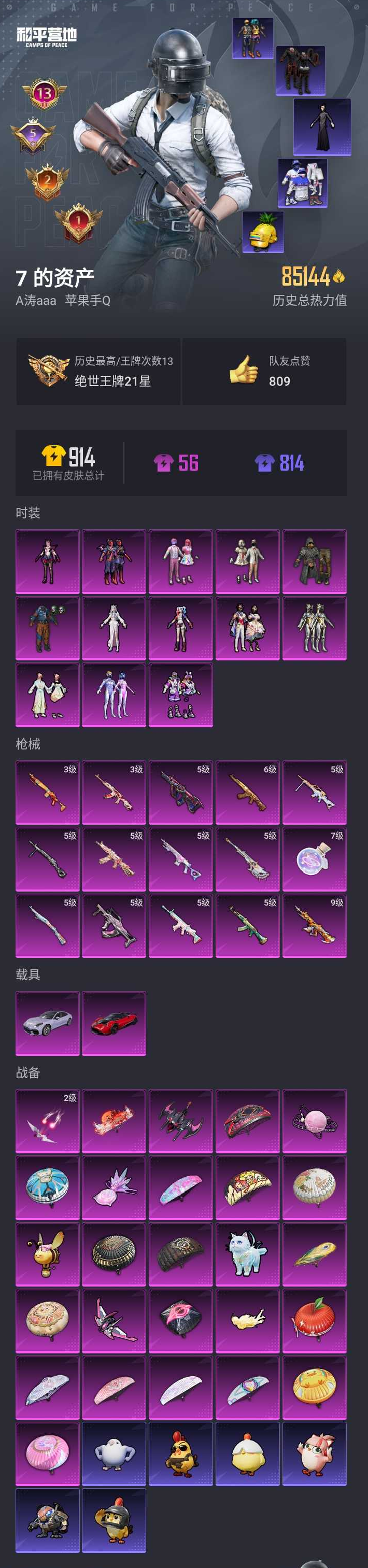 【和平精英】【lyhp21945】13粉装,15特效呛,2载具,历史最高段位:绝世王牌21星 王牌印记13次 热力值:85144,157套装,265呛械,319装备,145战备;套装:套装-极限特训,套装-怪诞乔克,套装-宝贝奶油派,套装-天使彩虹糖,套装-梦幻火箭,套装-绚金战神,套装-星之彼岸,套装-闪耀律动,套装-莲影清波,角色-狂魅哈莉,角色-冷漠罗丽,套装-星穹咏叹调,角色-罪夜之冕,套装-特训学院,套装-白色伏地魔,套装-黑色伏地魔,套装-竞技名士,套装-猛禽,套装-长空猛禽,套装-旭日情侣,套装-冷焰舞者,套装-浪漫天命,套装-贵族骑装,套装-鹰眼刺客,套装-冷酷挑战者,套装-蓝彩潮人,套装-魅力单车,套装-狂战萌兔,套装-沙漠兵团,套装-极地朋克,套装-幻世战舞者,套装-甜蜜菠萝,套装-蓝调潮人,套装-暗影哥特,套装-深海小丑鱼,套装-夏日倾情,套装-甜蜜熊情侣,套装-缤纷果语,套装-滨海厨神,套装-龙魂突击队,套装-冰川特警,套装-旷野奇兵,套装-麻辣教官,套装-东方飞龙,套装-破蛋小黄鸡,套装-霓虹街区,套装-萌黄之夏,套装-顽皮玉兔,套装-牛气满满,套装-白糯汤圆,套装-战术大师,套装-牛气冲天,套装-ss18特训,套装-电音精灵,套装-快乐星愿,套装-星梦畅游,套装-ss17特训,套装-水晶王族,套装-瑞龙福将,套装-团圆交子,套装-福星高照,套装-ss19特训,套装-jteam战队服,套装-ss20特训,套装-ss21特训,套装-萌趣咩咩,套装-娇憨猪猪,套装-荷畔雨呱,套装-玉兔迎春,套装-ss22特训,套装-田园牧歌,套装-轻风白浪,套装-光之冒险,套装-绯格组合,套装-ss23特训,套装-王牌教练,套装-柠萌假日,套装-ss24特训,套装-龟仙人,套装-ss25特训,套装-惊鸿侠骨,套装-锦衣飞扬,套装-云霞荷露,套装-冰河战士,套装-ss26特训,套装-快闪甜心,套装-春光漫游,套装-漫游都市,套装-空岛之星,套装-贝斯之夜,套装-ss27特训,套装-恋语绒绒,套装-ss28特训,角色-白光莹,套装-街头风暴,套装-海盐绵绵冰,套装-ss29特训,套装-虚空漩涡,套装-引力深渊,套装-雏菊兔兔,套装-萝兰蝴蝶,角色-绯色魅影,套装-异域银装,套装-闪电轻猫,套装-ss30特训,套装-青团波波,套装-糖糖葫芦,套装-蓝调潮影,套装-小鸟芋圆,套装-诡诞巡游,套装-墨青刃影,套装-ss31特训,套装-鱼渊荷华,套装-燕燕于飞,角色-瑰梦爱神,套装-紫幽梦,套装-粉恋花,套装-ss33特训,角色-猎影月神,套装-云朵鹅,套装-巳巳如意,套装-ss32特训,套装-彩虹兔,套装-青翼流星,套装-蓝冰羽,套装-顶瓜瓜,套装-雪绒豹,套装-狂鲨锋刃,套装-混沌火种,套装-大橘大利,套装-极速光影,套装-星渊小夜曲,套装-炫彩糖果,套装-星影赞美诗,套装-砂语先知,套装-元气之梦,套装-ss34特训,套装-擎苍青焰,套装-朱霞炽焰,角色-申公豹,套装-游乐,套装-凌霄紫焰,套装-薄荷星砂,套装-ss35特训,套装-午间小调,套装-秘语星愿,套装-风迹短诗,套装-琴音绮想,套装-粉黛兰香,套装-画境星梦,套装-书海巡游,套装-ss37特训,套装-ss36特训,套装-红釉青花,套装-雪国风尚,套装-雨过天青,套装-萌鸡速递;呛皮:5级aug-星之彼岸,aug-耀粉歌者,aug-青春冒险家,aug-2p战斗服款,aug-异域银装,aug-冰晶雪宝,aug-紫晶流影,6级akm-甜心宝贝,5级akm-绿萝繁花,3级akm-暮色玫影,akm-影袭,akm-破晓战魂,akm-星之信仰,akm-霓虹街区,akm-涂鸦街区,akm-星之彼岸,akm-彩虹符号,akm-极光猎影,akm-霓彩脉冲,5级scar-l-锦绣绵绵,scar-l-未来战士,scar-l-夜灯,scar-l-炫彩节奏,scar-l-暗夜玫瑰,scar-l-彩虹符号,scar-l-玉兔迎春,scar-l-海盐豹豹,9级m416-至情至圣,m416-蓝色火焰,m416-红色方程式,m16a4-蓝色火焰,m16a4-红色方程式,m16a4-幻世战舞者,m16a4-最终圣卫者,m16a4-雨过天青,蜜獾-娇憨猪猪,蜜獾-天降萌叽,蜜獾-糖糖葫芦,蜜獾-绯穹魔姬,蜜獾-风迹短诗,蜜獾-绿洲时空,蜜獾-乌木金纹,famas-湮灭星辰,famas-霓彩脉冲,famas-乌木金纹,m762-奇异狩猎者,m762-甜心宝贝,m762-瑞龙福将,m762-彩虹符号,m762-天降萌叽,m762-雏菊兔兔,m762-云朵鹅,m762-登顶巅峰,mk47-洛神天依,mk47-乌木金纹,mk47-风迹短诗,ac-val-乌木金纹,ac-val-天降萌叽,ac-val-快闪甜心,arx-凌霄紫焰,5级groza-镜光银凌,groza-黑色刀锋,groza-田园牧歌,groza-紫矿核心,groza-福马献瑞,g36c-暗夜玫瑰,g36c-星穹咏叹调,g36c-乌木金纹,q-洛神天依,ace32-画境星梦,ace32-冰晶雪宝,5级amr-智耀战神,amr-雨过天青,amr-乌木金纹,5级kar98k-巳巳如意,kar98k-金玉无双,kar98k-彩虹符号,kar98k-电玩视界,kar98k-洛神天依,kar98k-星穹咏叹调,莫辛纳甘-乌木金纹,莫辛纳甘-风迹短诗,svd-云朵鹅,svd-霓彩脉冲,awm-垂柳戏鸭,awm-绿洲时空,m200-惊鸿侠骨,m200-乌木金纹,m24-未来战士,m24-幻彩电音,m24-乌木金纹,win94-瑞龙福将,win94-乌木金纹,vss-未来战士,vss-星之彼岸,vss-田园牧歌,vss-彩虹符号,slr-娇憨猪猪,slr-圣穹绘梦,slr-霓彩脉冲,slr-乌木金纹,5级mk14-甜梦熊击,3级mk14-福马献瑞,mk14-乌木金纹,mk14-猪猪侠,mk14-紫幽梦,mk14-薄荷星砂,sks-金玉无双,sks-夜灯,sks-糯团青竹,m417-惊鸿侠骨,m417-玩趣呆呆,mini14-金玉无双,mini14-梦幻火箭,mini14-耀粉歌者,mini14-雏菊兔兔,mini14-鸡智如我,mk12-风迹短诗,mk12-乌木金纹,mk20-h-快闪甜心,mk20-h-糖糖葫芦,mk20-h-狂鲨锋刃,mk20-h-乌木金纹,m1加兰德-画境星梦,vect-生命誓言,vect-金玉无双,vect-田园牧歌,vect-突变脉冲,vect-创世·救赎,vect-燕燕于飞,p90-飞驰魅影,p90-快闪甜心,p90-玩趣呆呆,p90-魔法小松鼠,p90-紫矿核心,p90-乌木金纹,ump45-蓝色火焰,ump45-生命誓言,ump45-金玉无双,ump45-海盐豹豹,ump45-糖糖葫芦,ump45-极意拳锋,mp5k-画境星梦,mp5k-乌木金纹,5级aks-74u-