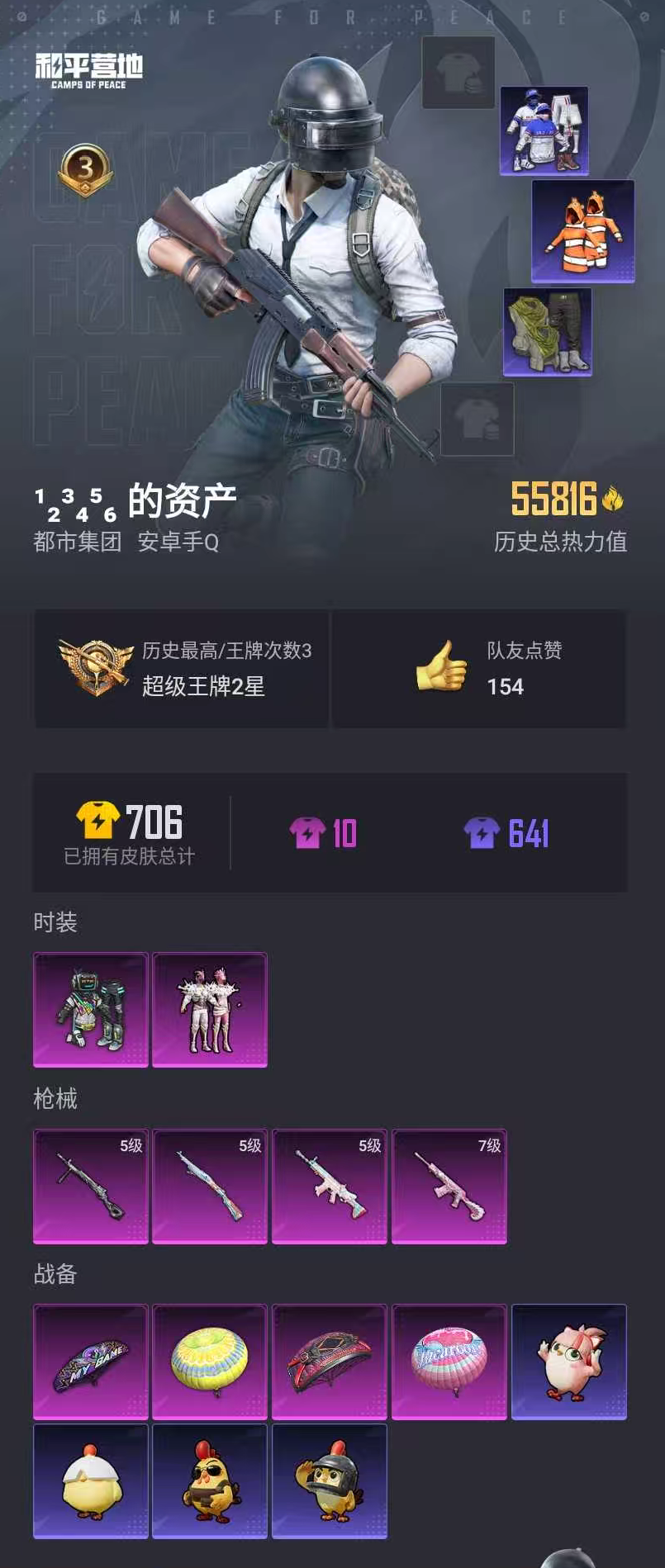 【和平精英】【lyhp21943】2粉装,4特效呛,0载具,历史最高段位:超级王牌2星 王牌印记3次 热力值:55816,158套装,209呛械,212装备,98战备;套装:套装-快乐主宰,套装-海渊国主,套装-特训学院,套装-猎鹰,套装-青年教官,套装-橘黑制服,套装-红色运动,套装-黄色运动,套装-蓝色运动,套装-黄色伏地魔,套装-白色伏地魔,套装-黑色伏地魔,套装-竞技名士,套装-深蓝色名流,套装-猛禽,套装-棕色飞行服,套装-长空猛禽,套装-沙漠雄狮,套装-漫步者,套装-竞技勇士朋克,套装-海岛探路者,套装-雨林探路者,套装-沙漠探路者,套装-刚毅裁决者,套装-浪漫天命,套装-特战装甲,套装-战地督导,套装-街舞之王,套装-街舞达人,套装-灰色格斗者,套装-春日漫步,套装-龙腾端午,套装-燃烧卡路里,套装-滨海假日,套装-鹰眼刺客,套装-冰冻风暴,套装-完美偶像,套装-幻影武者,套装-特战英豪,套装-千禧之恋,套装-魅力单车,套装-绮丽涂鸦,套装-耀眼新星,套装-坚韧舞者,套装-竞技达人朋克,套装-野性战心,套装-狂沙舞者,套装-破晓战魂,套装-森林游猎者,套装-荣耀,套装-热血青春,套装-沙漠兵团,套装-丛林猎人,套装-极地朋克,套装-幻世战舞者,套装-无烬之地,套装-清新柠檬,套装-蓝调潮人,套装-恒星战甲,套装-甜蜜熊情侣,套装-缤纷果语,套装-冰川特警,套装-格斗先锋,套装-冷血极客,套装-麻辣教官,套装-小丑鱼,套装-破蛋小黄鸡,套装-疯狂小兔子,套装-迷域探索者,套装-军械专家,套装-北国孤狼,套装-ss6特训,套装-跃动心情,套装-ss7特训,套装-黑色刀锋,套装-核芯基因,套装-精神漫游,套装-鹤鸣,套装-霓虹街区,套装-五号元素,套装-ss10特训,套装-ss8特训,套装-白熊同盟,套装-萌黄之夏,套装-pel摇滚竞梦者,套装-夏日音浪,套装-ss9特训,套装-抹茶蜜豆,套装-探宝勇士,套装-蓝甜马卡龙,套装-牛气满满,套装-白糯汤圆,套装-原初圣火,套装-逆风勇士,套装-萌趣颜团子,套装-战术大师,套装-ss12特训,套装-牛气冲天,套装-ss18特训,套装-耀粉歌者,套装-治愈之星,套装-科技之星,套装-飞行日记,套装-ss13特训,套装-冰爽海盐,套装-ss14特训,套装-吉莉礼服,套装-ss15特训,套装-ss17特训,套装-瑞龙福将,套装-团圆交子,套装-虎虎生威吉莉,套装-异彩先驱,套装-霓虹极客,套装-空投萌叽,套装-ss19特训,套装-飞驰魅影,套装-音速流光,套装-炫蓝之夏,套装-ss20特训,套装-浑天鲲鹏,套装-甜心亚梦,套装-虚音幻奏,套装-ss21特训,套装-萌趣咩咩,套装-娇憨猪猪,套装-玉兔迎春,套装-ss22特训,套装-田园牧歌,套装-轻风白浪,套装-光之冒险,套装-绯格组合,套装-ss23特训,套装-神气柴柴,套装-懵萌河马,套装-妙红点点,套装-幻彩翩翩,套装-王牌教练,套装-柠萌假日,套装-青玉碎影,套装-ss24特训,套装-龟仙人,套装-涂山之恋,套装-ss25特训,套装-果汁能量,套装-冰河战士,套装-ss26特训,套装-ss27特训,套装-老实芭蕉,套装-ss28特训,套装-海盐绵绵冰,角色-风玲,套装-ss33特训,套装-巳巳如意,套装-ss32特训,套装-ss34特训,套装-ss35特训,套装-萌鸡速递;呛皮:m762-绯红前夜,m762-快乐主宰,m762-深海曼妙,m762-牛气冲天,m762-瑞龙福将,m762-天降萌叽,m762-乌木金纹,q-原初圣火,q-彩虹符号,q-洛神天依,q-飞驰魅影,q-乌木金纹,akm-灼热熔岩,akm-生命誓言,akm-影袭,akm-破晓战魂,akm-霓虹街区,akm-夜灯,akm-彩虹符号,akm-萌趣颜团子,akm-虎虎生威,akm-乌木金纹,groza-黑色刀锋,groza-马卡龙,groza-治愈之星,groza-彩虹符号,groza-异彩先驱,groza-恐龙拽拽,groza-田园牧歌,groza-懵萌河马,groza-乌木金纹,5级scar-l-锦绣绵绵,scar-l-黄金龙骨,scar-l-炫彩节奏,scar-l-玉兔迎春,scar-l-海盐豹豹,scar-l-乌木金纹,m16a4-蓝色火焰,m16a4-快乐主宰,m16a4-夜灯,m16a4-甜心亚梦,m16a4-幻世战舞者,m416-蓝色火焰,m416-绯红前夜,m416-红色方程式,m416-糯团青竹,m416-乌木金纹,mk47-乌木金纹,mk47-妙红点点,aug-耀粉歌者,aug-天降萌叽,ac-val-甜心亚梦,ac-val-乌木金纹,ac-val-天降萌叽,g36c-懵萌河马,g36c-星穹咏叹调,g36c-乌木金纹,蜜獾-娇憨猪猪,蜜獾-垂柳戏鸭,蜜獾-天降萌叽,蜜獾-乌木金纹,famas-霓彩脉冲,amr-暗夜行者,amr-妙红点点,amr-鬼刀,amr-乌木金纹,win94-瑞龙福将,win94-萝萝小趴兔,win94-乌木金纹,m24-影袭,m24-治愈之星,m24-香水柠檬,m24-炫彩节奏,m24-乌木金纹,莫辛纳甘-乌木金纹,莫辛纳甘-懵萌河马,m200-乌木金纹,5级kar98k-巳巳如意,kar98k-影袭,kar98k-勇闯险境,kar98k-彩虹符号,kar98k-炫彩节奏,kar98k-灵符少年,kar98k-飞驰魅影,awm-胡桃卫兵,awm-乌木金纹,svd-霓彩脉冲,mini14-金鼠迎春,mini14-原初圣火,mini14-炫彩节奏,mini14-异彩先驱,mini14-涂山之恋,mini14-乌木金纹,sks-夜灯,sks-勇闯险境,sks-炫彩节奏,sks-糯团青竹,slr-娇憨猪猪,slr-彩虹符号,mk14-治愈之星,mk14-乌木金纹,mk14-冰河战士,vss-黑色刀锋,vss-田园牧歌,vss-彩虹符号,vss-乌木金纹,p90-飞驰魅影,p90-玩趣呆呆,p90-巳巳如意,p90-乌木金纹,vect-生命誓言,vect-黑色刀锋,vect-彩虹符号,vect-治愈之星,vect-香水柠檬,vect-田园牧歌,vect-创世·救赎,vect-乌木金纹,汤姆逊-奇异狩猎者,汤姆逊-勇闯险境,汤姆逊-炫彩节奏,汤姆逊-异彩先驱,汤姆逊-环太平洋,汤姆逊-天降萌叽,汤姆逊-乌木金纹,ump45-夜灯,ump45-生命誓言,ump45-快乐主宰,ump45-天启纪元,ump45-灵符少年,ump45-涂山之恋,mp5k-异彩先驱,mp5k-乌木金纹,uzi-红色方程式,uzi-娇憨猪猪,uzi-天降萌叽,uzi-幽秘魅影,uzi-啾咪啾咪,uzi-乌木金纹,aks-74u-乌木金纹,野牛-乌木金纹,spas-12-太空嘟嘟,spas-12-田园牧歌,7级s12k-海渊国主,s12k-华贵