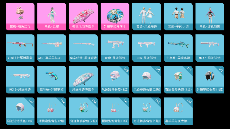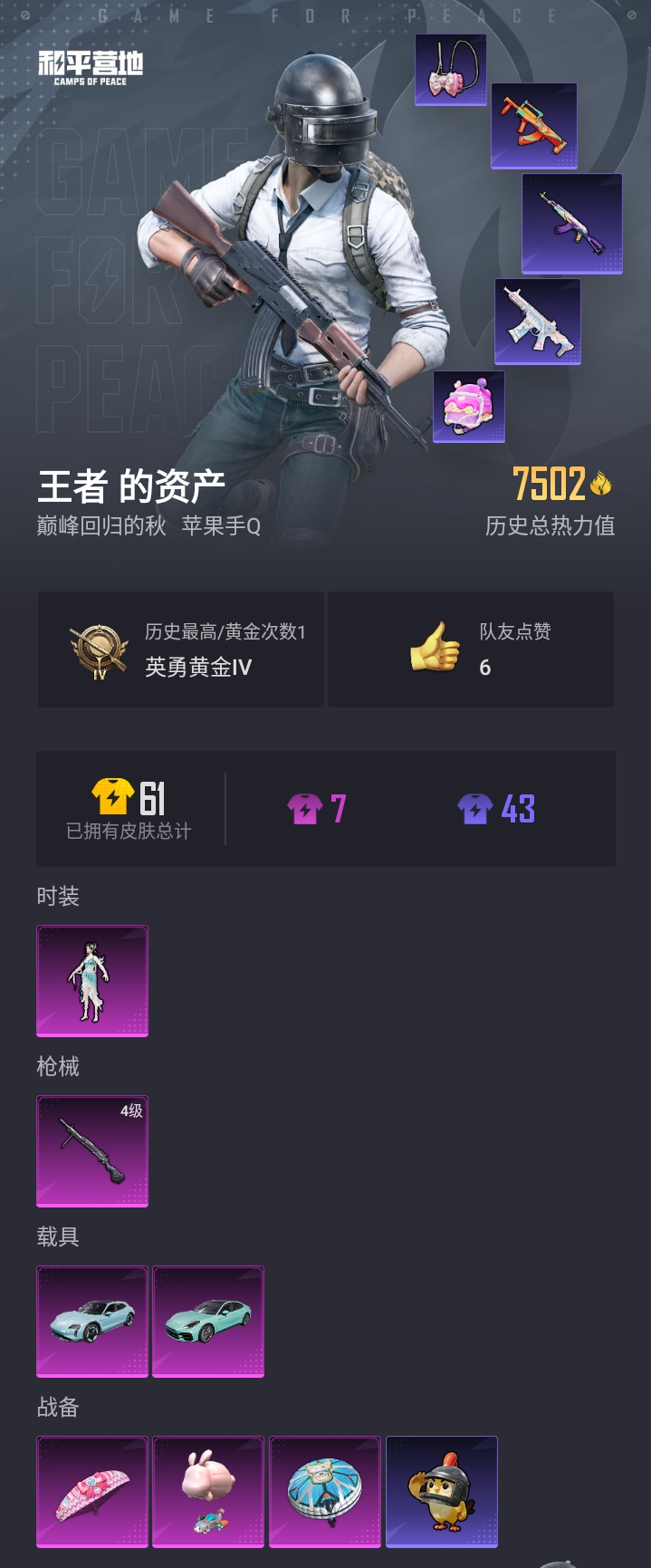 【和平精英】【lyhp21965】1粉装,1特效呛,2载具,历史最高段位:英勇黄金ⅳ 热力值:7502,5套装,17呛械,16装备,12战备;套装:角色-灵玺,角色-绯色魅影,套装-午间小调,套装-风迹短诗,套装-萌鸡速递;呛皮:akm-霓彩脉冲,groza-紫矿核心,groza-福马献瑞,蜜獾-风迹短诗,mk47-风迹短诗,莫辛纳甘-风迹短诗,win94-乌木金纹,amr-喜羊羊与灰太狼,awm-天降萌叽,mini14-耀粉歌者,mk12-风迹短诗,mk12-乌木金纹,dbs-风迹短诗,4级dp-28-豹影疾电,信号呛-异瞳寒姬,十子怒-异瞳寒姬,破片手留单-拽到爆炸;载具:保时捷taycan 旅行版冰晶蓝,保时捷panamera梦幻青;降落伞:鸡智如我飞行器,马上有福飞行器;滑翔尾迹:僚机-萌兔起飞; 详情看图1粉装1特效呛2载具 灵玺 保时捷双车型