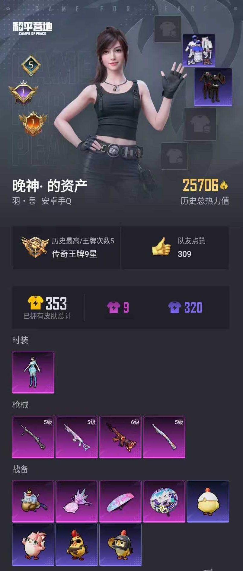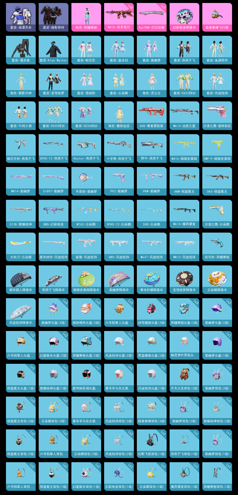 【和平精英】【lyhp21933】1粉装,4特效呛,0载具,历史最高段位:传奇王牌9星 王牌印记5次 热力值:25706,64套装,98呛械,111装备,65战备;套装:角色-异瞳寒姬,套装-特训学院,套装-猎鹰,套装-黄色运动,套装-蓝色运动,套装-黄色伏地魔,套装-白色伏地魔,套装-黑色伏地魔,套装-深蓝色名流,套装-酒红色名流,套装-湖蓝色名流,套装-黄色名流,套装-漫步者,套装-海岛探路者,套装-旭日情侣,套装-灼焰舞者,套装-浪漫天命,套装-特战装甲,套装-沙漠毒蛇,套装-魅力单车,套装-绮丽涂鸦,套装-超能勇士,套装-幻世战舞者,套装-暗影哥特,套装-夏日倾情,套装-alan walker,套装-麻辣教官,套装-白糯汤圆,套装-战术大师,套装-王牌教练,套装-恋语绒绒,套装-异域银装,角色-馥郁金蕊,套装-ss31特训,套装-鱼渊荷华,套装-燕燕于飞,套装-智谋强哥,套装-紫幽梦,套装-粉恋花,套装-ss33特训,角色-猎影月神,套装-云朵鹅,套装-巳巳如意,套装-ss32特训,套装-青翼流星,套装-蓝冰羽,套装-顶瓜瓜,套装-雪绒豹,套装-狂鲨锋刃,套装-大橘大利,套装-圣穹绘梦,角色-灵公主,套装-元气之梦,套装-ss34特训,套装-薄荷星砂,套装-ss35特训,套装-午间小调,套装-风迹短诗,套装-粉黛兰香,套装-ss37特训,套装-ss36特训,套装-雪国风尚,套装-萌鸡速递,套装-玲珑侠影;呛皮:m762-彩虹符号,m762-云朵鹅,famas-霓彩脉冲,famas-乌木金纹,aug-青春冒险家,aug-异域银装,aug-紫晶流影,6级m416-风花雪月,m416-萌萌史莱姆,groza-海盐豹豹,groza-紫矿核心,groza-福马献瑞,mk47-乌木金纹,mk47-风迹短诗,scar-l-夜灯,scar-l-玉兔迎春,scar-l-绿洲时空,蜜獾-风迹短诗,蜜獾-乌木金纹,akm-涂鸦街区,akm-棋盘冕主,akm-霓彩脉冲,ace32-冰晶雪宝,5级kar98k-巳巳如意,svd-云朵鹅,svd-霓彩脉冲,莫辛纳甘-风迹短诗,amr-鸡智如我,m24-炫彩节奏,m200-乌木金纹,win94-乌木金纹,5级mk14-甜梦熊击,mk14-治愈之星,mk14-魔药课室,mk14-紫幽梦,mk14-薄荷星砂,mk14-紫晶流影,slr-霓彩脉冲,slr-乌木金纹,mini14-香桃花海,mini14-鸡智如我,mk12-风迹短诗,mk12-乌木金纹,mk20-h-狂鲨锋刃,m417-玩趣呆呆,sks-棋盘冕主,p90-巳巳如意,p90-紫矿核心,uzi-啾咪啾咪,aks-74u-鸡智如我,aks-74u-乌木金纹,野牛-燕燕于飞,ump45-夜灯,ump45-海盐豹豹,vect-燕燕于飞,s686-生命誓言,s686-巳巳如意,spas-12-燕燕于飞,spas-12-狂鲨锋刃,spas-12-云朵鹅,spas-12-福马献瑞,spas-12-乌木金纹,s12k-夜灯,s12k-玩趣呆呆,s12k-智耀战神,s12k-霓彩脉冲,dbs-彩虹符号,dbs-幻彩电音,dbs-风迹短诗,s1897-紫幽梦,s1897-糯团青竹,m249-糯团青竹,m249-无面战甲,m249-冰晶雪宝,pkm-啾咪啾咪,pkm-紫幽梦,mg-36-薄荷星砂,5级dp-28-豹影疾电,mg3-幻世战舞者,mg3-乌木金纹,信号呛-异瞳寒姬,tmp-9-萌萌史莱姆,蝎式手呛-燕燕于飞,沙墨之鹦-旋转彩虹,沙墨之鹦-云朵鹅,p92-紫幽梦,平底锅-紫幽梦,平底锅-属我最6,大砍刀-云朵鹅,撬棍-冰晶雪宝,破片手留单-海盐豹豹,破片手留单-拽到爆炸,破片手留单-巳巳如意,破片手留单-爆破雪人,燃烧瓶-福马献瑞,盐雾蛋-冰氧夏日,十子怒-燕燕于飞,十子怒-异域银装;降落伞:炫彩糖果飞行器,极意拳锋飞行器,异域银装飞行器,顶峰精英尾迹,狂鲨锋刃飞行器,鸡智如我飞行器,登顶巅峰飞行器,马上有福飞行器; 详情看图1粉装4特效呛 暗影哥特 浪漫天命 6级m4风花血月地铁满天赋