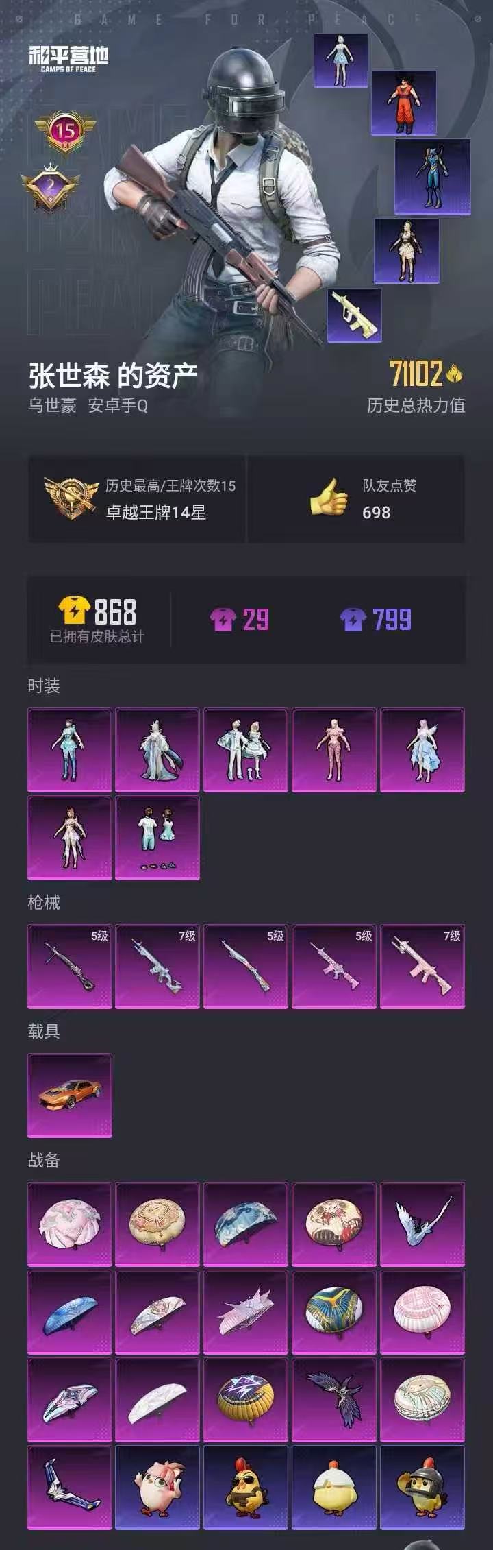 【和平精英】【lyhp21957】7粉装,5特效呛,1载具,历史最高段位:卓越王牌14星 王牌印记15次 热力值:71102,176套装,216呛械,316装备,131战备;套装:套装-仲夏莫吉托,角色-圣堂之誓,角色-守护天翼,角色-星梦奇缘,角色-异瞳寒姬,套装-雪月幻音,角色-宁雨蝶,套装-特训学院,套装-猎鹰,套装-青年教官,套装-橘黑制服,套装-红色运动,套装-黄色运动,套装-蓝色运动,套装-黄色伏地魔,套装-白色伏地魔,套装-黑色伏地魔,套装-竞技名士,套装-深蓝色名流,套装-酒红色名流,套装-湖蓝色名流,套装-黄色名流,套装-猛禽,套装-长空猛禽,套装-竞技勇士朋克,套装-海岛探路者,套装-旭日情侣,套装-六六大吉,套装-特战装甲,套装-贵族骑装,套装-春日漫步,套装-龙腾端午,套装-完美偶像,套装-人气偶像,套装-幻影武者,套装-街头潮人,套装-蓝彩潮人,套装-魅力单车,套装-绮丽涂鸦,套装-竞技达人朋克,套装-都市漫游者,套装-野性战心,套装-都市魅力,套装-荣耀,套装-热血青春,套装-沙漠兵团,套装-幻世战舞者,套装-金耀舞者,套装-青涩时光,套装-缤纷果语,套装-滨海厨神,套装-龙魂突击队,套装-冰川特警,套装-格斗先锋,套装-麻辣教官,套装-破蛋小黄鸡,套装-疯狂小兔子,套装-北国孤狼,套装-跃动心情,套装-鹤鸣,套装-霓虹街区,套装-萌黄之夏,套装-夏日音浪,套装-探宝勇士,套装-牛气满满,套装-白糯汤圆,套装-战术大师,套装-牛气冲天,套装-耀粉歌者,套装-飞行日记,套装-曼妙人鱼,套装-热情海星,套装-纯真浪花,套装-快乐星愿,角色-英勇保护者,角色-军刀雅典娜,套装-ss19特训,套装-飞驰魅影,套装-音速流光,套装-炫蓝之夏,套装-ss20特训,套装-猎梦纪元,套装-甜心亚梦,套装-虚音幻奏,套装-ss21特训,套装-暖心熊熊,套装-萌趣咩咩,套装-娇憨猪猪,套装-梦幻奶油,套装-玉兔迎春,套装-ss22特训,套装-和煦暖阳,套装-田园牧歌,套装-轻风白浪,套装-白啸长虹,套装-光之冒险,套装-绯格组合,套装-ss23特训,角色-孙悟空,套装-莱茵河畔,套装-香榭午后,套装-神气柴柴,套装-懵萌河马,套装-妙红点点,套装-幻彩翩翩,套装-王牌教练,套装-柠萌假日,套装-青玉碎影,套装-ss24特训,套装-银松藏云,套装-日照花林,角色-短笛,套装-龟仙人,套装-涂山之恋,套装-ss25特训,套装-金戈铁马,套装-惊鸿侠骨,套装-锦衣飞扬,套装-香桃花海,套装-龙的传人,套装-冰河战士,套装-ss26特训,套装-云魄琉璃,套装-焰鹰斗篷,套装-幽夜迷踪,套装-幻羽潜行,套装-ss27特训,套装-恋语绒绒,套装-老实芭蕉,套装-ss28特训,角色-极地流光,角色-粉雾星云,角色-白光莹,角色-冰公主,角色-mark.06,套装-街头风暴,套装-海盐绵绵冰,套装-蝶变,套装-创世·追猎,套装-小熊娃娃,套装-ss29特训,套装-雏菊兔兔,角色-狂花道·娜可露露,套装-萝兰蝴蝶,套装-先驱飞行员,套装-异域银装,角色-摩登魅猫,套装-星途旅人,套装-ss30特训,套装-青团波波,套装-糖糖葫芦,套装-ss31特训,套装-鱼渊荷华,套装-燕燕于飞,套装-紫幽梦,套装-粉恋花,套装-ss33特训,套装-云朵鹅,套装-巳巳如意,套装-ss32特训,套装-彩虹兔,套装-蓝冰羽,套装-顶瓜瓜,套装-雪绒豹,套装-大橘大利,套装-星渊小夜曲,套装-星影赞美诗,角色-乐音,套装-元气之梦,套装-ss34特训,套装-朱霞炽焰,套装-凌霄紫焰,套装-薄荷星砂,套装-ss35特训,套装-ss36特训,套装-萌鸡速递;呛皮:mk47-乌木金纹,mk47-妙红点点,m762-第五大道,m762-天降萌叽,m762-雏菊兔兔,m762-云朵鹅,famas-霓彩脉冲,famas-乌木金纹,aug-耀粉歌者,aug-天降萌叽,aug-闲梦青缨,aug-异域银装,5级m416-电玩时刻,m416-蓝色火焰,m416-红色方程式,m416-糯团青竹,akm-灼热熔岩,akm-奇异狩猎者,akm-缤纷海域,akm-破晓战魂,akm-彩虹符号,akm-环太平洋,akm-龙的传人,scar-l-红色方程式,scar-l-银碳小老虎,scar-l-玉兔迎春,scar-l-星途旅人,scar-l-海盐豹豹,scar-l-冷漠罗丽,蜜獾-娇憨猪猪,蜜獾-垂柳戏鸭,蜜獾-天降萌叽,蜜獾-精灵梦叶罗丽,蜜獾-糖糖葫芦,蜜獾-乌木金纹,q-彩虹符号,q-飞驰魅影,q-未来歌姬,q-纯真浪花,m16a4-甜心亚梦,m16a4-幻世战舞者,m16a4-冰河战士,arx-凌霄紫焰,ac-val-甜心亚梦,ac-val-乌木金纹,g36c-懵萌河马,g36c-星穹咏叹调,groza-田园牧歌,groza-懵萌河马,groza-海盐豹豹,5级kar98k-巳巳如意,kar98k-王子的夏天,kar98k-彩虹符号,kar98k-炫彩节奏,kar98k-飞驰魅影,kar98k-顶峰精英,kar98k-星穹咏叹调,m24-炫彩节奏,m24-乌木金纹,svd-云朵鹅,awm-垂柳戏鸭,awm-飒粉甜心,awm-焰鹰斗篷,awm-纯真浪花,amr-妙红点点,amr-乌木金纹,莫辛纳甘-乌木金纹,莫辛纳甘-懵萌河马,m200-惊鸿侠骨,m200-乌木金纹,mk14-乌木金纹,mk14-海螺星光,mk14-冰河战士,mk14-紫幽梦,slr-娇憨猪猪,slr-彩虹符号,slr-霓彩脉冲,7级m417-第五大道,m417-惊鸿侠骨,m417-玩趣呆呆,sks-金玉无双,sks-炫彩节奏,sks-糯团青竹,sks-未来歌姬,mini14-耀粉歌者,mini14-涂山之恋,mini14-香桃花海,mini14-雏菊兔兔,mini14-绯穹魔姬,mk20-h-星梦奇缘,mk20-h-星途旅人,mk20-h-糖糖葫芦,mk20-h-乌木金纹,7级mk12-雪月幻音,mk12-乌木金纹,vss-星之彼岸,vss-田园牧歌,vss-香桃花海,uzi-红色方程式,uzi-娇憨猪猪,uzi-天降萌叽,uzi-冰河战士,uzi-啾咪啾咪,汤姆逊-奇异狩猎者,汤姆逊-耀粉歌者,汤姆逊-炫彩节奏,汤姆逊-环太平洋,汤姆逊-暗夜鎏金,汤姆逊-天降萌叽,汤姆逊-星梦奇缘,汤姆逊-纯真浪花,aks-74u-鬼刀,aks-74u-鸡智如我,aks-74u-乌木金纹,js9-凌霄紫焰,ump45-生命誓言,ump45-涂山之恋,ump45-海盐豹豹,ump45-糖糖葫芦,vect-生命誓言,vect-彩虹符号,vect-田园牧歌,vect-炎氏