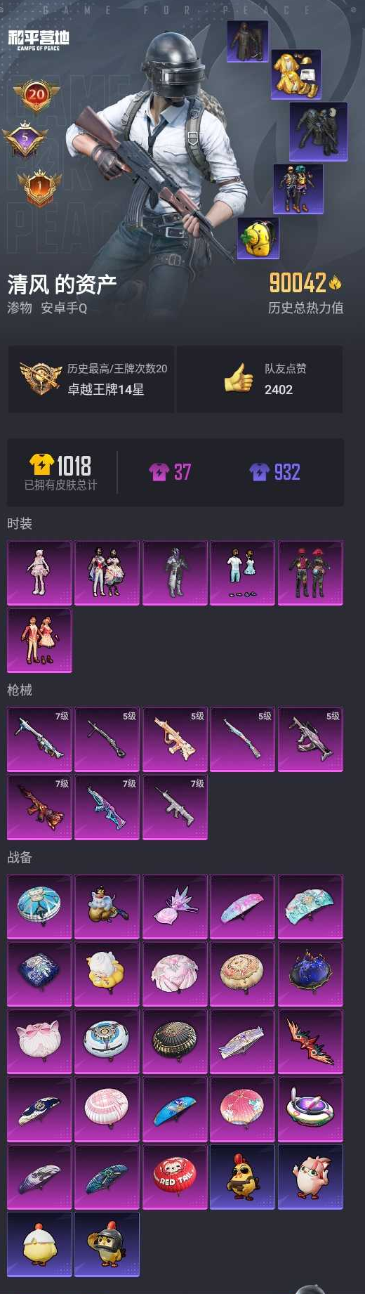 【和平精英】【lyhp21970】6粉装,8特效呛,0载具,历史最高段位:卓越王牌14星 王牌印记20次 热力值:90082,202套装,290呛械,341装备,160战备;套装:套装-幻影战神,套装-放客神游,套装-妙趣可丽,套装-仲夏莫吉托,套装-星穹咏叹调,角色-羊梦糖心,套装-特训学院,套装-蓝色运动,套装-白色伏地魔,套装-黑色伏地魔,套装-竞技名士,套装-湖蓝色名流,套装-黄色名流,套装-猛禽,套装-长空猛禽,套装-漫步者,套装-黎明保卫者,套装-海岛探路者,套装-时尚圣诞,套装-旭日情侣,套装-六六大吉,套装-冷焰舞者,套装-都市猎人,套装-浪漫天命,套装-特战装甲,套装-浪漫假日,套装-贵族骑装,套装-特殊使命,套装-灰色格斗者,套装-春日漫步,套装-龙腾端午,套装-燃烧卡路里,套装-滨海假日,套装-暗黑骑手,套装-沙漠毒蛇,套装-鹰眼刺客,套装-冰冻风暴,套装-完美偶像,套装-幻影武者,套装-特战英豪,套装-千禧之恋,套装-怒火燎原,套装-魅力单车,套装-绮丽涂鸦,套装-狂战萌兔,套装-野性战心,套装-野性战魂,套装-狂沙舞者,套装-破晓战魂,套装-森林游猎者,套装-热血青春,套装-沙漠兵团,套装-派对舞王,套装-酷潮明星,套装-极地朋克,套装-幻世战舞者,套装-清新柠檬,套装-奇异狩猎者,套装-蓝调潮人,套装-迅捷狂鲨,套装-深海小丑鱼,套装-夏日倾情,套装-青涩时光,套装-缤纷果语,套装-冰川特警,套装-幻影公爵,套装-极速红龙,套装-旷野奇兵,套装-海上生明月,套装-麻辣教官,套装-金环蜂王,套装-破蛋小黄鸡,套装-军械专家,套装-鹤鸣,套装-霓虹街区,套装-ss10特训,套装-ss8特训,套装-白熊同盟,套装-萌黄之夏,套装-夏日音浪,套装-ss9特训,套装-抹茶蜜豆,套装-探宝勇士,套装-牛气满满,套装-ss11特训,套装-青春冒险家,套装-潮流游乐家,套装-萌趣颜团子,套装-特种颜团子,套装-战术大师,套装-ss12特训,套装-牛气冲天,套装-ss18特训,套装-飞行日记,套装-ss13特训,套装-竞技角斗士,套装-ss14特训,套装-吉莉礼服,套装-快乐星愿,套装-ss15特训,套装-ss16特训,套装-暴风机械师,套装-时空追击者,套装-ss17特训,套装-水晶王族,套装-瑞龙福将,套装-团圆交子,套装-冰爽风暴,套装-福星高照,套装-雪兔飞飞,套装-虎虎生威吉莉,套装-空投萌叽,套装-ss19特训,套装-飞驰魅影,套装-音速流光,套装-炫蓝之夏,套装-ss20特训,套装-猎梦纪元,套装-甜心亚梦,套装-虚音幻奏,套装-ss21特训,套装-萌趣咩咩,套装-娇憨猪猪,套装-梦幻奶油,套装-玉兔迎春,套装-ss22特训,套装-和煦暖阳,套装-田园牧歌,套装-轻风白浪,套装-绚烂繁星,套装-熠彩粉晶,套装-光之冒险,套装-绯格组合,套装-ss23特训,套装-莱茵河畔,套装-龙舌兰冰茶,套装-甜梦熊熊,套装-神气柴柴,套装-懵萌河马,套装-灵蜜圈圈,套装-妙红点点,套装-幻彩翩翩,套装-王牌教练,套装-柠萌假日,套装-青玉碎影,套装-ss24特训,套装-龟仙人,套装-涂山之恋,套装-ss25特训,套装-香桃花海,套装-龙的传人,套装-ss26特训,套装-空岛之星,套装-明鸳圣池,套装-焰鹰斗篷,套装-幻羽潜行,套装-ss27特训,套装-老实芭蕉,套装-街头风暴,套装-ss29特训,角色-绯色魅影,套装-异域银装,角色-摩登魅猫,套装-星途旅人,套装-ss30特训,套装-青团波波,套装-棉花软糖,角色-夜瞳黯灵,套装-糖糖葫芦,套装-ss31特训,套装-鱼渊荷华,套装-燕燕于飞,套装-智谋强哥,套装-紫幽梦,套装-粉恋花,套装-ss33特训,套装-云朵鹅,套装-巳巳如意,套装-ss32特训,套装-彩虹兔,套装-青翼流星,套装-蓝冰羽,套装-雪绒豹,套装-大橘大利,角色-时希公主,套装-星渊小夜曲,套装-炫彩糖果,套装-元气之梦,套装-ss34特训,套装-擎苍青焰,套装-朱霞炽焰,套装-凌霄紫焰,套装-ss35特训,套装-午间小调,套装-秘语星愿,套装-风迹短诗,套装-ss37特训,套装-ss36特训,角色-霜刃之御,套装-雪国风尚,套装-萌鸡速递,套装-玲珑侠影;呛皮:5级groza-镜光银凌,groza-影袭,groza-马卡龙,groza-彩虹符号,groza-恐龙拽拽,groza-田园牧歌,groza-懵萌河马,groza-荧海星豚,groza-紫矿核心,groza-乌木金纹,mk47-青春冒险家,mk47-洛神天依,mk47-乌木金纹,mk47-妙红点点,mk47-风迹短诗,5级aug-暖羊咩咩,aug-甜蜜菠萝,aug-幻影战神,aug-耀粉歌者,aug-青春冒险家,aug-天降萌叽,aug-异域银装,7级scar-l-纯梦嫁纱,scar-l-红色方程式,scar-l-黄金龙骨,scar-l-粉色回忆,scar-l-炫彩节奏,scar-l-彩虹符号,scar-l-玉兔迎春,scar-l-星途旅人,7级m416-风花雪月,m416-夜灯,m416-蓝色火焰,m416-绯红前夜,m416-红色方程式,m416-梨园星光,m416-糯团青竹,蜜獾-娇憨猪猪,蜜獾-垂柳戏鸭,蜜獾-天降萌叽,蜜獾-糖糖葫芦,蜜獾-风迹短诗,蜜獾-乌木金纹,ace32-冰晶雪宝,7级akm-梦之光华,akm-灼热熔岩,akm-生命誓言,akm-影袭,akm-破晓战魂,akm-霓虹街区,akm-夜灯,akm-涂鸦街区,akm-彩虹符号,akm-萌趣颜团子,akm-虎虎生威,akm-龙的传人,akm-霓彩脉冲,m16a4-红色方程式,m16a4-甜心亚梦,m16a4-幻世战舞者,q-神秘黑猫,q-彩虹符号,q-飞驰魅影,q-乌木金纹,m762-绯红前夜,m762-牛气冲天,m762-瑞龙福将,m762-彩虹符号,m762-天降萌叽,m762-云朵鹅,m762-登顶巅峰,arx-凌霄紫焰,ac-val-甜心亚梦,ac-val-乌木金纹,ac-val-天降萌叽,ac-val-玩趣呆呆,famas-霓彩脉冲,famas-乌木金纹,g36c-时空追击者,g36c-懵萌河马,g36c-乌木金纹,5级kar98k-巳巳如意,kar98k-影袭,kar98k-幻影战神,kar98k-深海曼妙,kar98k-彩虹符号,kar98k-欢乐麻酱,kar98k-炫彩节奏,kar98k-飞驰魅影,kar98k-顶峰精英,kar98k-乌木金纹,amr-妙红点点,amr-喜羊羊与灰太狼,amr-乌木金纹,m24-影袭,m24-奇异狩猎者,m24-炫彩节