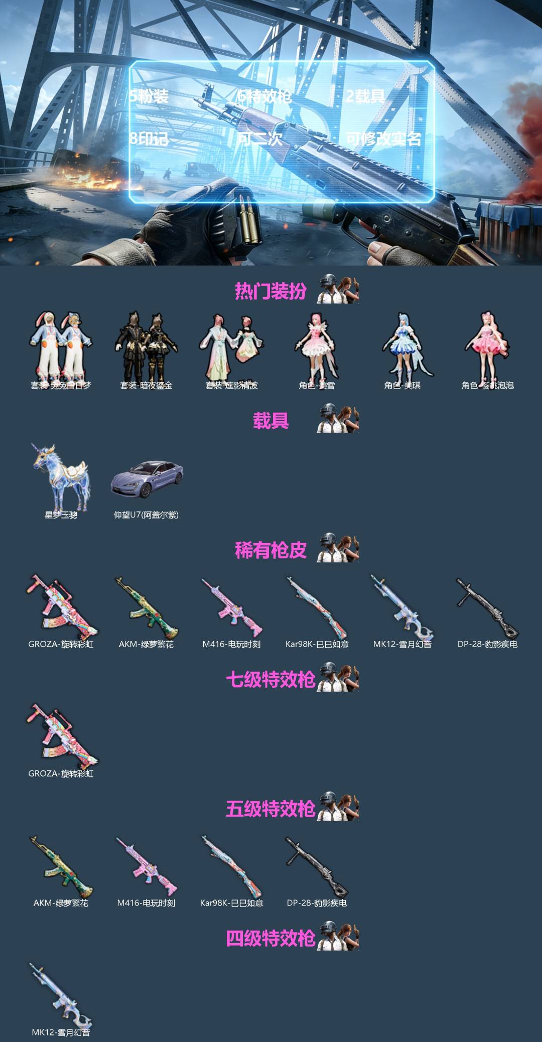 [16623868]5粉装 6特效呛 2载具 8印记 可二次 可修改实名 【热门装扮】樱桃泡泡暗夜鎏金莲影清波美雪美琪兔兔白日梦 【载具】星梦玉骢仰望u7先锋版阿盖尔紫 【稀有呛皮】mk12-雪月幻音m416电玩时刻kar98k-巳巳如意dp-28-豹影疾电groza旋转彩虹akm绿萝繁花 【七级特效呛】七级groza-旋转彩虹 【五级特效呛】五级kar98k-巳巳如意五级dp-28-豹影疾电五级m416-电玩时刻五级akm-绿萝繁花 【四级特效呛】四级mk12-雪月幻音 【紫色装扮】ss34特训套装吉莉礼服ss31特训套装沙漠毒蛇海岛探路者湖蓝色名流滨海假日滨海厨神完美偶像帅气教官幻世战舞者探宝勇士极地朋克柠萌假日军刀雅典娜甜心亚梦天籁歌者虚音幻奏田园牧歌轻风白浪ss22特训ss23特训牛气满满猎梦纪元夏雨游龙ss20特训娇憨猪猪萌趣咩咩ss21特训牛气冲天萌鸡速递ss35特训秘语星愿喜羊羊元气之梦风迹短诗午间小调竞技达人朋克绮丽涂鸦缤纷果语蓝色运动特殊使命特训学院猛禽白色伏地魔破蛋小黄鸡黑色伏地魔魅力单车麻辣教官黄色名流黄色运动龟仙人龙魂突击队软软马卡龙长空猛禽竞技名士mark.06新蓝螳螂铁血战翼ss29特训纯白跃动糖霜甜心蜜桃派对鱼渊荷华玉兔迎春燕燕于飞巳巳如意焰鹰斗篷幻羽潜行幽夜迷踪ss27特训湖雨初晴情公主白光莹纯真浪花热情海星曼妙人鱼ss28特训晨曦薄雾ss26特训春光漫游快闪甜心明鸳圣池恋语绒绒耀粉歌者智慧之神蓝冰羽紫幽梦ss32特训套装幽秘之星冷霜之星金耀舞者贵族骑装 【优质战备】魔法神域降落伞初号机 觉醒ver.降落伞创世·救赎降落伞盛世惊鸿降落伞墨龙九天降落伞精灵梦叶罗丽降落伞蜜语绒猫降落伞巴啦啦小魔仙降落伞江南烟雨降落伞盛世惊鸿飞行器炫彩糖果降落伞炫彩糖果飞行器樱桃泡泡降落伞彩虹独角兽降落伞音爆索尼克降落伞环太平洋降落伞垂柳戏鸭降落伞星之彼岸降落伞天之羽翼降落伞