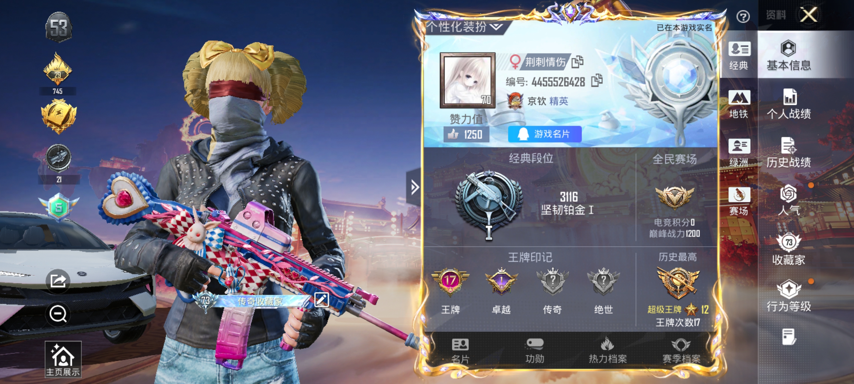 【和平精英】【txhp7054】13粉装,8特效呛,1载具,历史最高段位:超级王牌12星 王牌印记17次 热力值:84933,196套装,250呛械,343装备,173战备;套装:套装-幻影战神,套装-甜心巧克力,套装-宝贝奶油派,套装-天使彩虹糖,套装-冰霜白皇,套装-炙焰红王,套装-星之彼岸,套装-庄周梦蝶,角色-复仇流浪者,套装-傲雪凌霜,套装-旋转彩虹,套装-莲影清波,套装-幻影飞狐,套装-猎鹰,套装-青年教官,套装-黄色运动,套装-黑色伏地魔,套装-骑行爱好者,套装-竞技名士,套装-深蓝色名流,套装-酒红色名流,套装-湖蓝色名流,套装-黄色名流,套装-猛禽,套装-长空猛禽,套装-漫步者,套装-黎明保卫者,套装-蓝色守护者,套装-海岛探路者,套装-旭日情侣,套装-灼焰舞者,套装-都市猎人,套装-特战装甲,套装-战地督导,套装-春日漫步,套装-滨海假日,套装-鹰眼刺客,套装-冰冻风暴,套装-完美偶像,套装-蓝彩潮人,套装-怒火燎原,套装-魅力单车,套装-绮丽涂鸦,套装-竞技达人朋克,套装-破晓战魂,套装-荣耀,套装-沙漠兵团,套装-酷潮明星,套装-幻世战舞者,套装-蓝调潮人,套装-暗影哥特,套装-弄潮海豚,套装-迅捷狂鲨,套装-夏日倾情,套装-甜蜜熊情侣,套装-青涩时光,套装-缤纷果语,套装-龙魂突击队,套装-元素星魂,套装-忍者信条,套装-极速红龙,套装-格斗先锋,套装-冷血极客,套装-麻辣教官,套装-粉红小猪,套装-破蛋小黄鸡,套装-疯狂小兔子,套装-仓鼠灰灰,套装-鹤鸣,套装-霓虹街区,套装-暗夜契约,套装-纯白誓言,套装-罗小黑,套装-大橘为重,套装-白熊同盟,套装-萌黄之夏,套装-夏日音浪,套装-探宝勇士,套装-牛气满满,套装-白糯汤圆,套装-萌趣颜团子,套装-特种颜团子,套装-战术大师,套装-牛气冲天,套装-ss18特训,套装-耀粉歌者,套装-星梦畅游,套装-ss15特训,套装-ss16特训,角色-英勇保护者,套装-ss17特训,套装-醒狮腾龙,套装-瑞龙福将,套装-团圆交子,套装-福星高照,套装-遗落祭司,套装-豚鼠丹丹,套装-雪兔飞飞,套装-虎虎生威吉莉,套装-缤纷焰火,套装-异彩先驱,套装-霓虹极客,套装-空投萌叽,套装-ss19特训,套装-兔兔白日梦,套装-飞驰魅影,套装-音速流光,套装-炫蓝之夏,套装-ss20特训,套装-奶芙汪汪,套装-恶魔喵喵,套装-猎梦纪元,套装-甜心亚梦,套装-虚音幻奏,套装-香草威化,套装-ss21特训,套装-暖心熊熊,套装-萌趣咩咩,套装-娇憨猪猪,套装-荷畔雨呱,套装-灵幻魔术师,套装-暖心橘喵,套装-玉兔迎春,套装-ss22特训,套装-和煦暖阳,套装-田园牧歌,套装-轻风白浪,套装-星夜迷魅,套装-光之冒险,套装-绯格组合,套装-ss23特训,套装-甜梦熊熊,套装-神气柴柴,套装-懵萌河马,套装-王牌教练,套装-柠萌假日,套装-青玉碎影,套装-ss24特训,套装-日照花林,套装-龟仙人,套装-涂山之恋,套装-ss25特训,套装-金戈铁马,套装-惊鸿侠骨,套装-锦衣飞扬,套装-元气发射,套装-香桃花海,套装-龙的传人,套装-冰河战士,套装-ss26特训,套装-快闪甜心,套装-春光漫游,套装-漫游都市,套装-空岛之星,套装-无暇誓言,套装-云魄琉璃,套装-贝斯之夜,玩偶服-超人强,套装-ss27特训,套装-老实芭蕉,套装-ss28特训,玩偶服-卖崽青蛙,角色-拉斐尔,角色-mark.06,套装-街头风暴,套装-海盐绵绵冰,套装-ss29特训,套装-异域银装,角色-摩登魅猫,套装-星途旅人,套装-ss30特训,套装-ss31特训,套装-智谋强哥,套装-ss33特训,套装-云朵鹅,套装-巳巳如意,套装-ss32特训,套装-青翼流星,套装-雪绒豹,套装-狂鲨锋刃,套装-炫彩糖果,套装-元气之梦,套装-ss34特训,套装-擎苍青焰,套装-朱霞炽焰,套装-凌霄紫焰,套装-薄荷星砂,套装-ss35特训,套装-琴音绮想,套装-画境星梦,套装-书海巡游,套装-阳光菠萝,套装-ss37特训,套装-ss36特训,套装-雪国风尚,套装-萌鸡速递;呛皮:m762-甜心宝贝,m762-瑞龙福将,m762-彩虹符号,m762-绒雪飘舞,m762-天降萌叽,m762-云朵鹅,groza-影袭,groza-异彩先驱,groza-恐龙拽拽,groza-田园牧歌,groza-懵萌河马,groza-守护天翼,groza-海盐豹豹,akm-灼热熔岩,akm-生命誓言,akm-影袭,akm-破晓战魂,akm-霓虹街区,akm-涂鸦街区,akm-彩虹符号,akm-萌趣颜团子,akm-虎虎生威,akm-环太平洋,akm-龙的传人,akm-荧星灵猫,akm-霓彩脉冲,akm-绿洲时空,m16a4-红色方程式,m16a4-甜心亚梦,m16a4-幻世战舞者,m16a4-冰河战士,蜜獾-娇憨猪猪,蜜獾-垂柳戏鸭,蜜獾-天降萌叽,蜜獾-冰澜龙吟,arx-凌霄紫焰,7级m416-五爪金龙,m416-蓝色火焰,m416-神秘黑猫,m416-暗夜行者,m416-糯团青竹,aug-幻影战神,aug-耀粉歌者,aug-天降萌叽,aug-2p战斗服款,aug-异域银装,aug-冰晶雪宝,aug-紫晶流影,g36c-懵萌河马,g36c-乌木金纹,7级scar-l-童趣迷兔,scar-l-夜灯,scar-l-炫彩节奏,scar-l-龙宫之主,scar-l-玉兔迎春,scar-l-粉锦千层,scar-l-海盐豹豹,scar-l-绿洲时空,mk47-乌木金纹,q-绚金瑰梦,q-飞驰魅影,ace32-画境星梦,ace32-冰晶雪宝,ac-val-甜心亚梦,ac-val-乌木金纹,ac-val-彩虹甜喵,ac-val-天降萌叽,ac-val-快闪甜心,famas-霓彩脉冲,famas-乌木金纹,m24-影袭,m24-炫彩节奏,m24-乌木金纹,awm-恐龙拽拽,awm-垂柳戏鸭,awm-天降萌叽,莫辛纳甘-乌木金纹,莫辛纳甘-懵萌河马,5级kar98k-巳巳如意,kar98k-彩虹符号,kar98k-飞驰魅影,kar98k-乌木金纹,win94-夏日绵绵冰,win94-瑞龙福将,win94-乌木金纹,m200-惊鸿侠骨,m200-乌木金纹,svd-云朵鹅,svd-霓彩脉冲,amr-乌木金纹,slr-月影鸳鸯,slr-娇憨猪猪,slr-霓彩脉冲,slr-乌木金纹,mk20-h-墨染幽兰,mk20-h-快闪甜心,mk20-h-狂鲨锋刃,mk20-h-乌木金纹,mk14-童趣迷兔,mk14-乌木金纹,mk14-海螺星光,mk14-冰河战士,mk14-薄荷星砂,mini14-耀