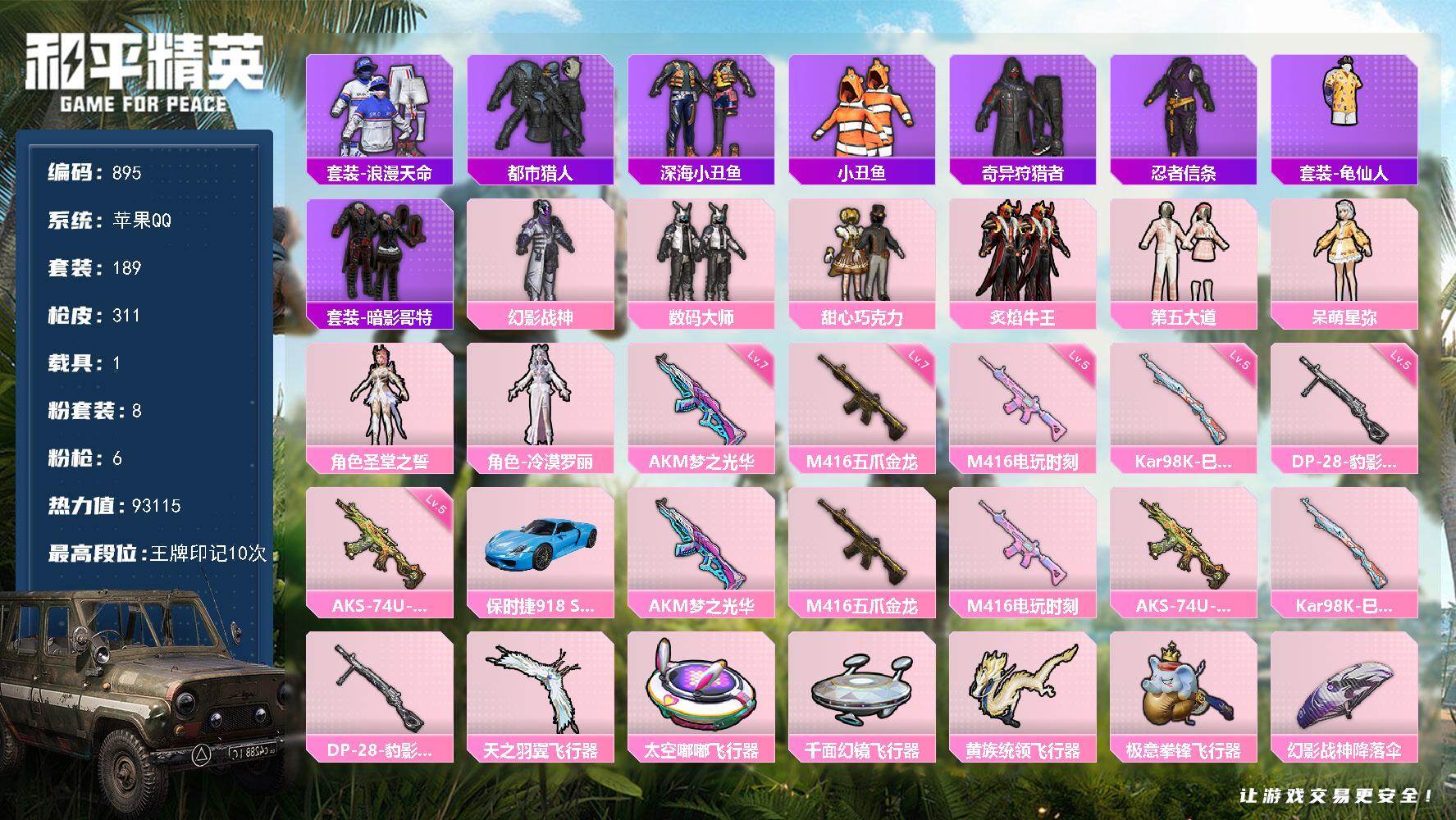 [16569394]苹果 手q-8粉装-6特效呛-1载具-6粉色飞行器-93115热力值-10王牌印记-189套装-311呛皮 【热门品类】:套装-浪漫天命,套装-都市猎人,套装-深海小丑鱼,套装-小丑鱼,套装-奇异狩猎者,套装-忍者信条,套装-龟仙人,套装-暗影哥特 【粉色套装】:粉装-幻影战神,粉装-数码大师,粉装-甜心巧克力,粉装-炙焰牛王,粉装-第五大道,角色-呆萌星弥,角色-圣堂之誓,角色-冷漠罗丽 【粉色呛皮等级】:akm-梦之光华七级,m416-五爪金龙七级,m416-电玩时刻五级,aks-74u-森灵之息五级,kar98k-巳巳如意五级,dp-28-豹影疾电五级 【粉色载具】:保时捷918 sper(沉静蓝) 【粉色呛皮】:akm-梦之光华,m416-五爪金龙,m416-电玩时刻,aks-74u-森灵之息,kar98k-巳巳如意,dp-28-豹影疾电 【粉色飞行器】:天之羽翼飞行器,太空嘟嘟飞行器,千面幻镜飞行器,黄族统领飞行器,极意拳锋飞行器 【粉色降落伞】:幻影战神降落伞,百万伏特降落伞,神秘黑猫降落伞,银刃赛罗降落伞,王牌四分卫降落伞,星之彼岸降落伞,齐天大圣降落伞,炙焰牛王降落伞,星夜魔法师降落伞,环太平洋降落伞,暖熊萌萌降落伞,太空嘟嘟降落伞,彩虹甜喵降落伞,暗夜鎏金降落伞,第五大道降落伞,飒粉甜心降落伞,炫光之旅降落伞,江南烟雨降落伞,精灵梦叶罗丽降落伞,拳皇·狂花道降落伞,异瞳寒姬降落伞,炫彩糖果降落伞 【稀有套装】:套装-龟仙人,套装-雪国风尚,套装-炫彩糖果,套装-樱梦幻音,套装-紫幽梦,套装-蓝冰羽,角色-夜瞳黯灵,套装-朱霞炽焰,套装-凌霄紫焰,套装-擎苍青焰,角色-敖闰,套装-书海巡游,套装-画境星梦,套装-琴音绮想 【稀有呛皮】:aug-冰晶雪宝,akm-冰凉西瓜,akm-夜灯,akm-奇异狩猎者,akm-小鹦鹉bebe,akm-彩虹符号,akm-影袭,akm-星之彼岸,akm-星兔领航员,akm-生命誓言,akm-破晓战魂,akm-萌趣颜团子,akm-虎虎生威,akm-霓虹街区,akm-龙的传人,m16a4-幻世战舞者,m16a4-甜心亚梦,m16a4-红色方程式,m16a4-蓝色火焰,scar-l-夜灯,scar-l-炫彩节奏,scar-l-玉兔迎春,scar-l-红色方程式,scar-l-黄金龙骨,m416-
