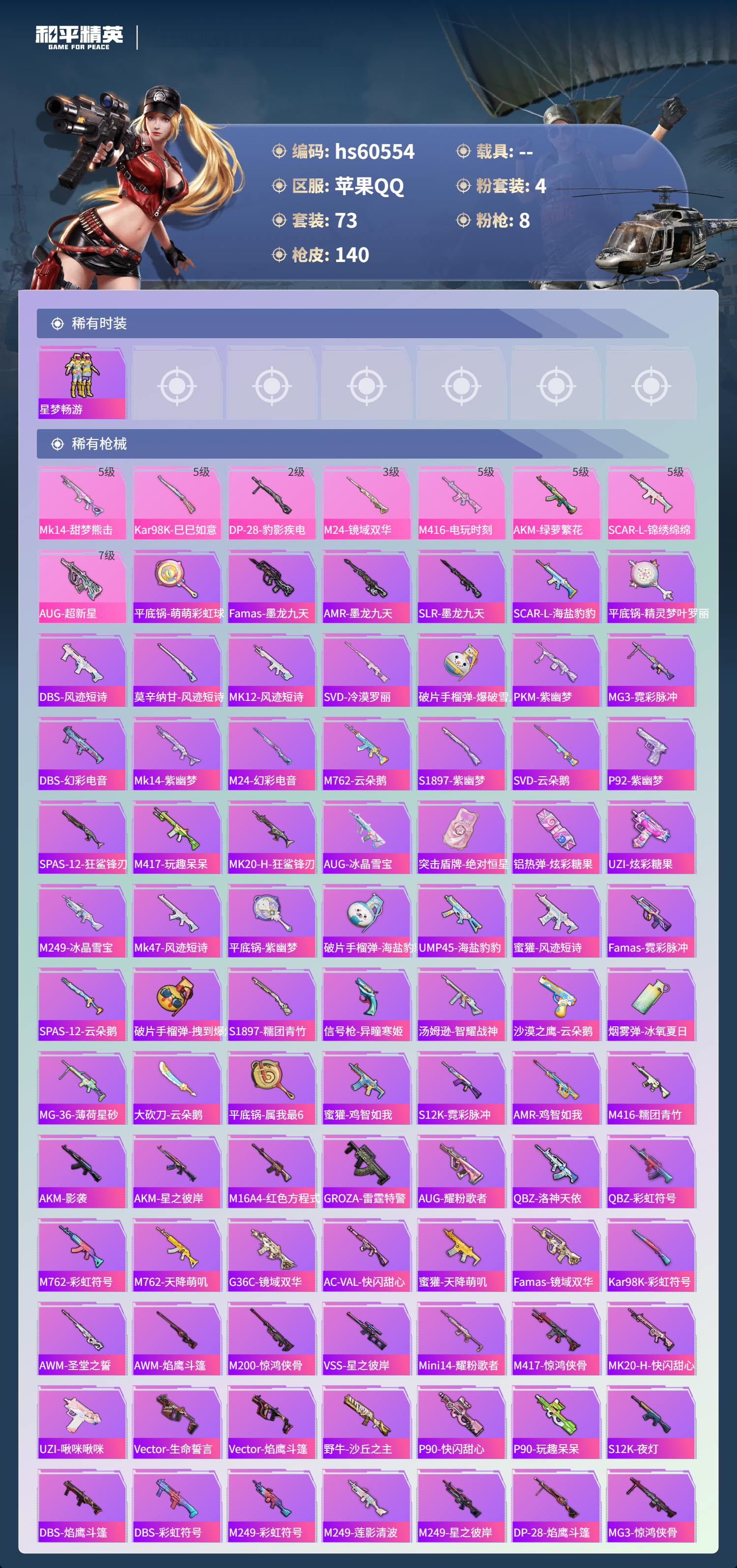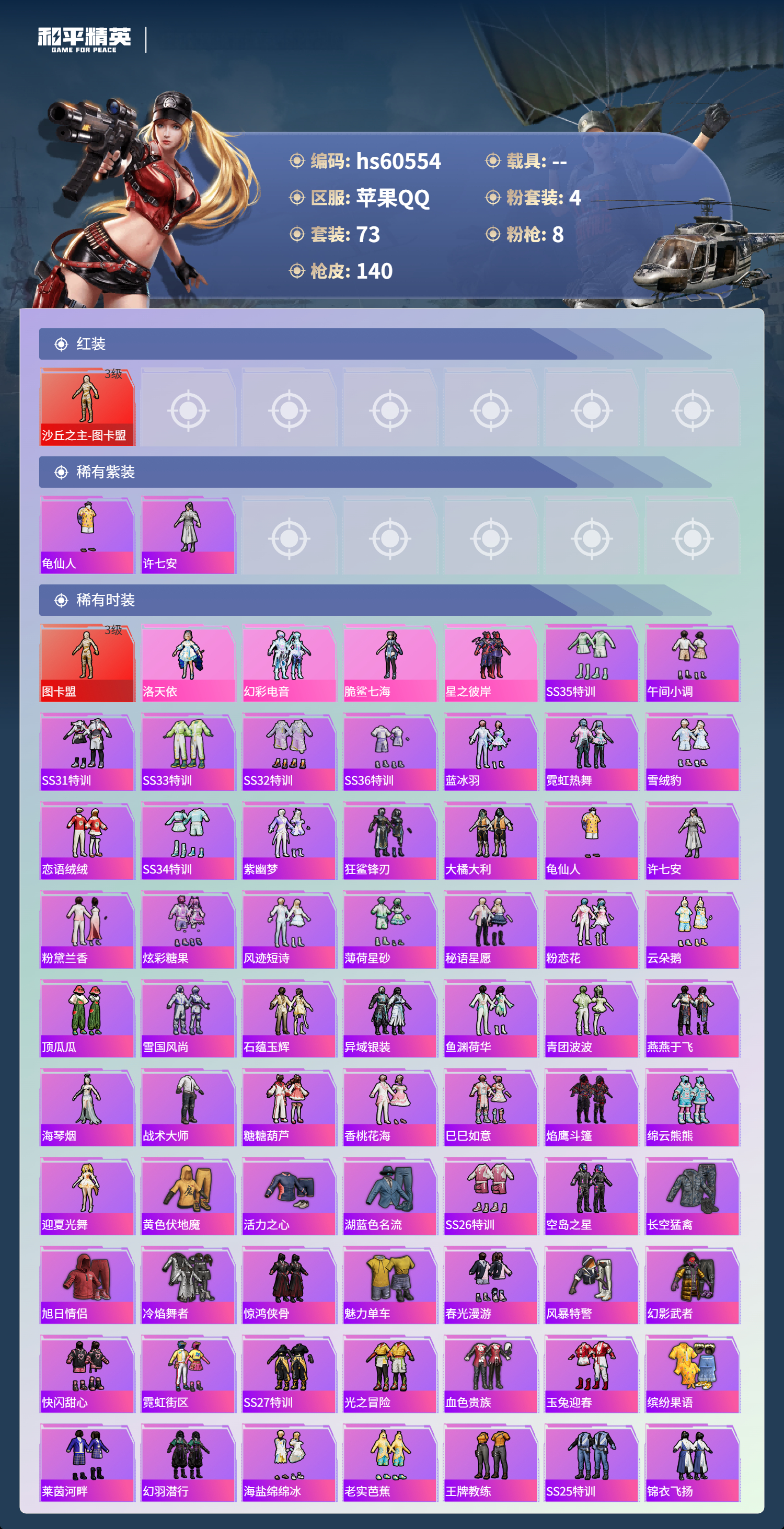 0载具-73套装-140呛皮-hs60554 苹果手q-8王牌印记-1红装-4粉装-8特效呛-42712热力值-73套装-140呛皮-2卓越印记-2传奇印记【1红装】沙丘之主-图卡盟/3级【4粉装】角色-洛天依套装-幻彩电音角色-脆鲨七海套装-星之彼岸【8特效呛】aug-超新星/7级m24-镜域双华/3级scar-l-锦绣绵绵/5级mk14-甜梦熊击/5级dp-28-豹影疾电/2级kar98k-巳巳如意/