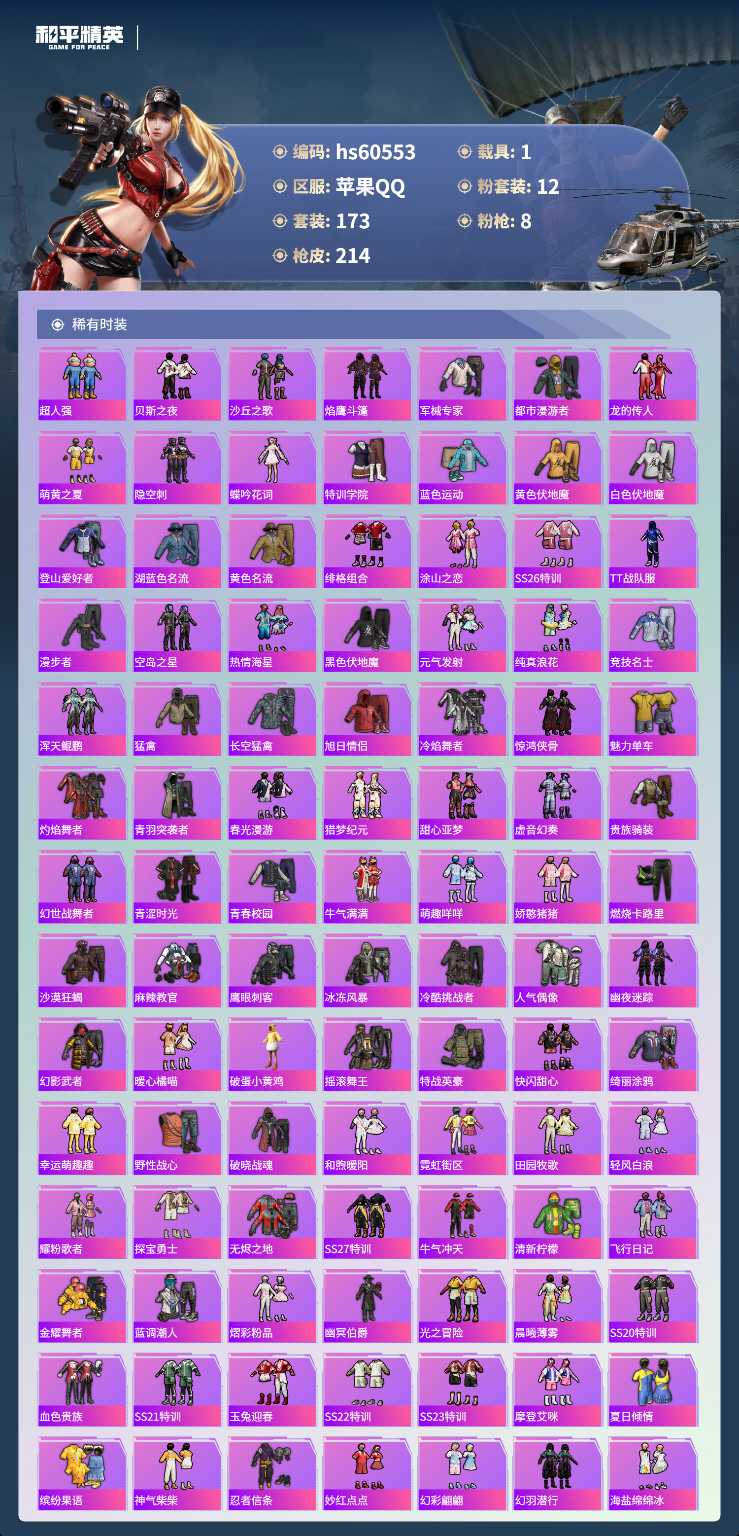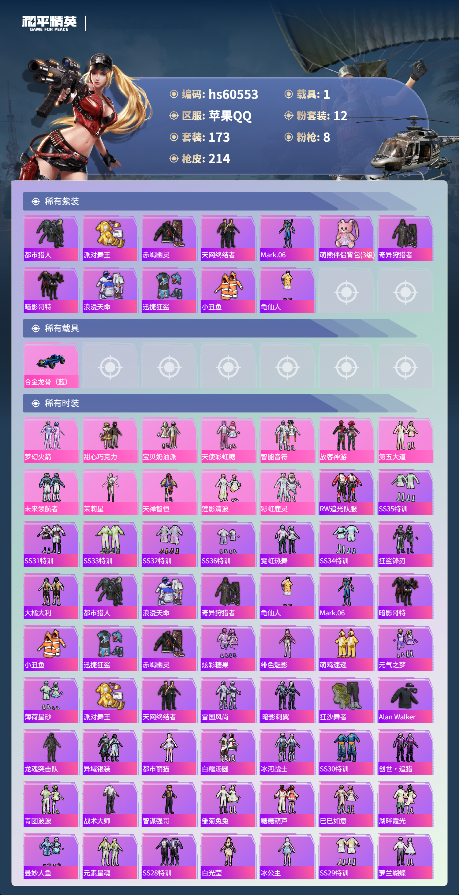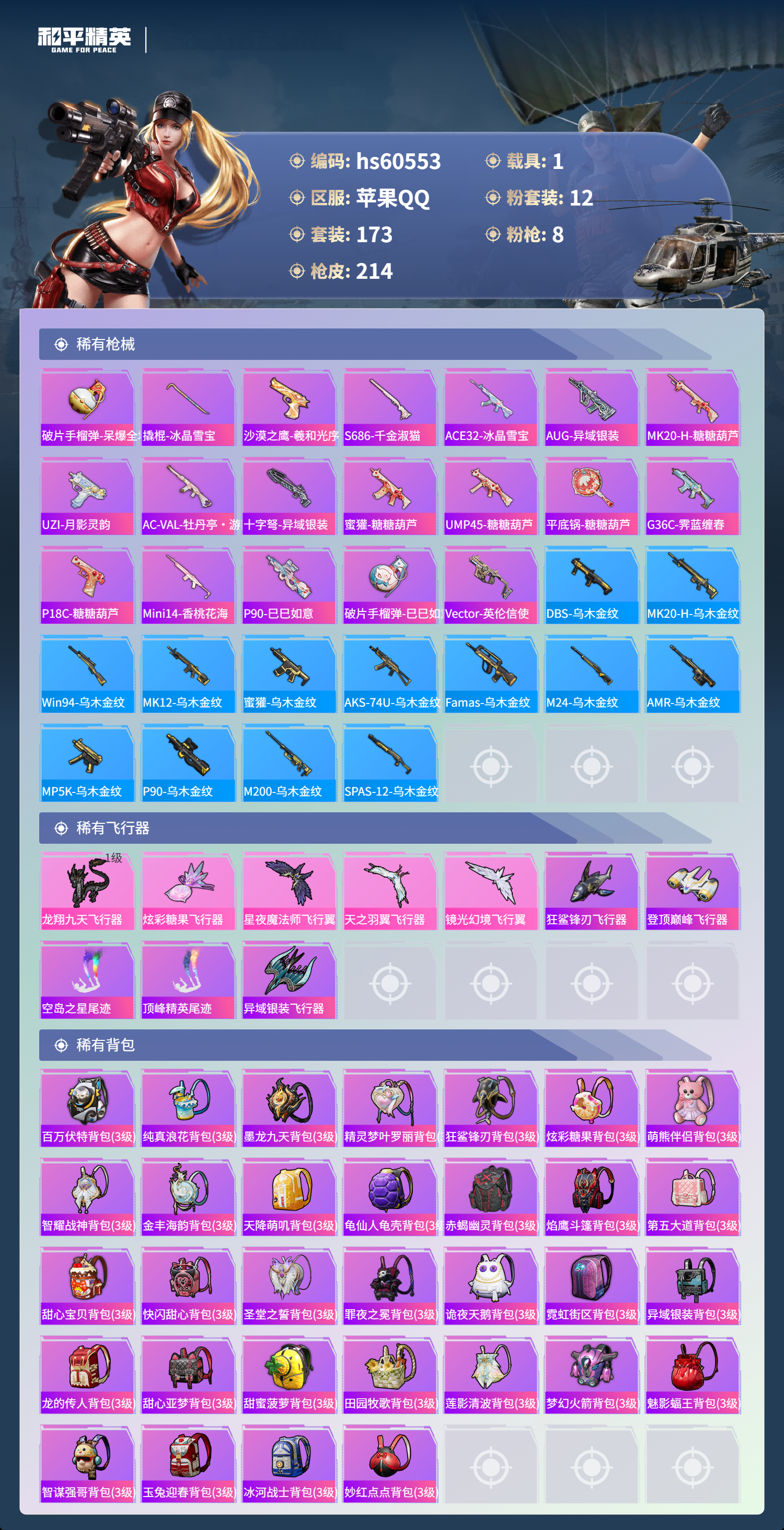 2444354苹果手q-14王牌印记-12粉装-8特效呛-1载具-74906热力值-173套装-214呛皮-2卓越印记 【12粉装】套装-放客神游套装-彩虹鹿灵套装-莲影清波套装-未来领航者套装-梦幻火箭套装-天禅智恒套装-宝贝奶油派套装-智能音符套装-天使彩虹糖角色-茉莉星套装-第五大道套装-甜心巧克力 【8特效呛】ump45-量子极限/5级m416-五爪金龙/