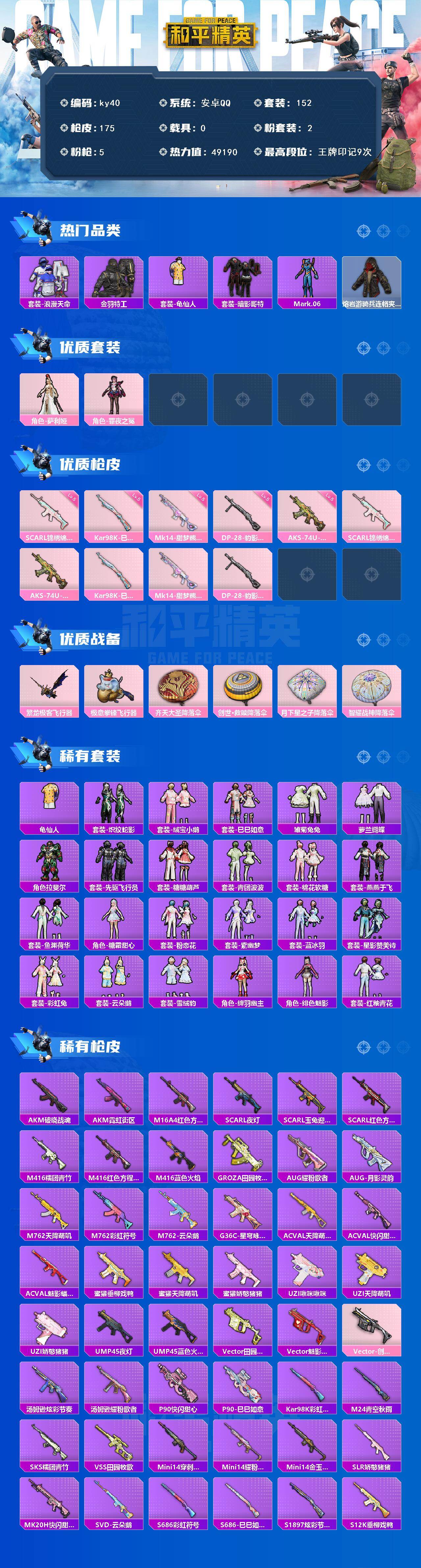 安卓 手q-2粉装-5特效呛-0载具-3粉色飞行器-49190热力值-9王牌印记-152套装-175呛皮 【热门品类】:套装-浪漫天命,套装-金羽特工,套装-龟仙人,套装-暗影哥特,角色-mark.06,熔岩游骑兵连帽夹克 【粉色套装】:角色-萨利娅,角色-罪夜之冕 【粉色呛皮等级】:scar-l-锦绣绵绵五级,aks-74u-森灵之息五级,kar98k-巳巳如意五级,mk14-甜