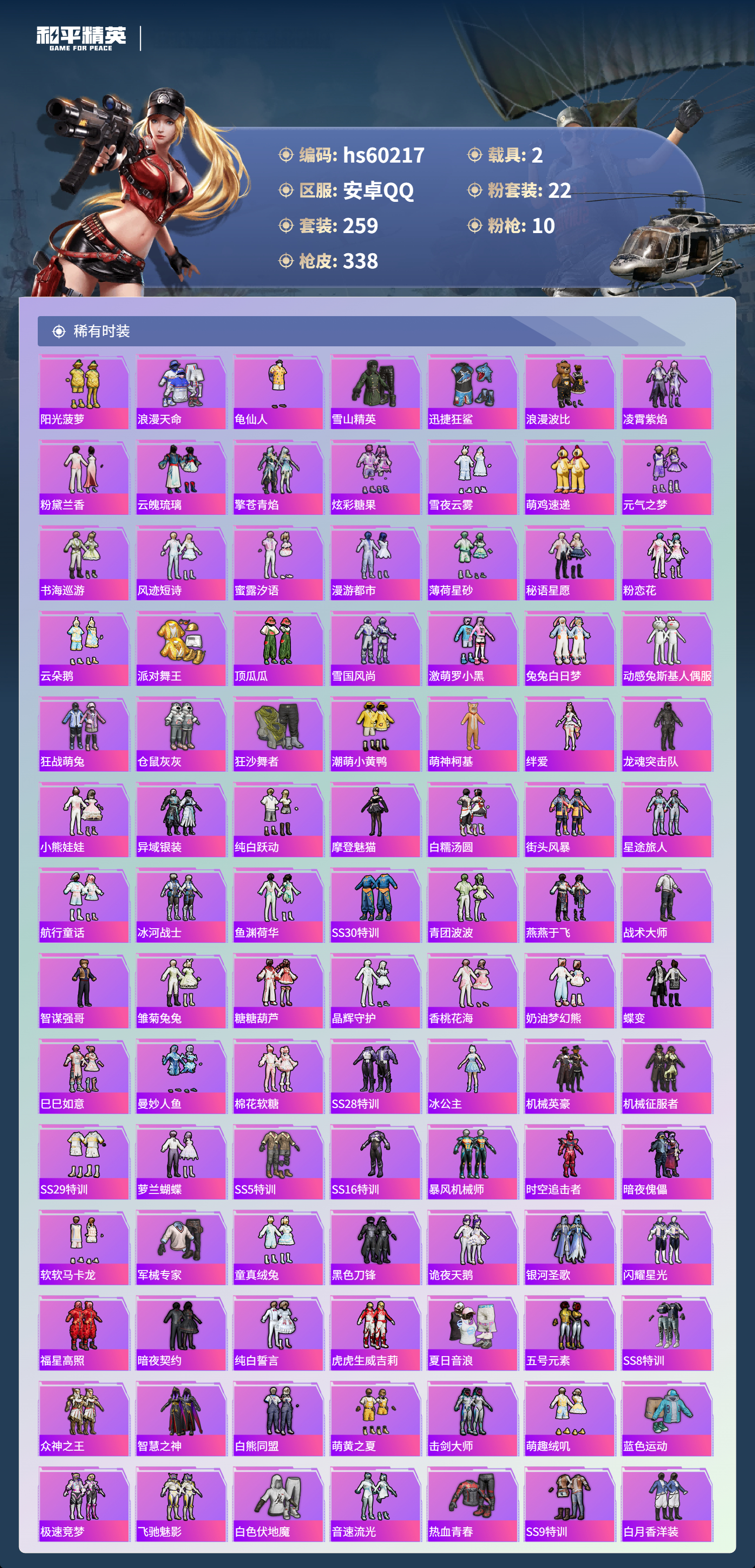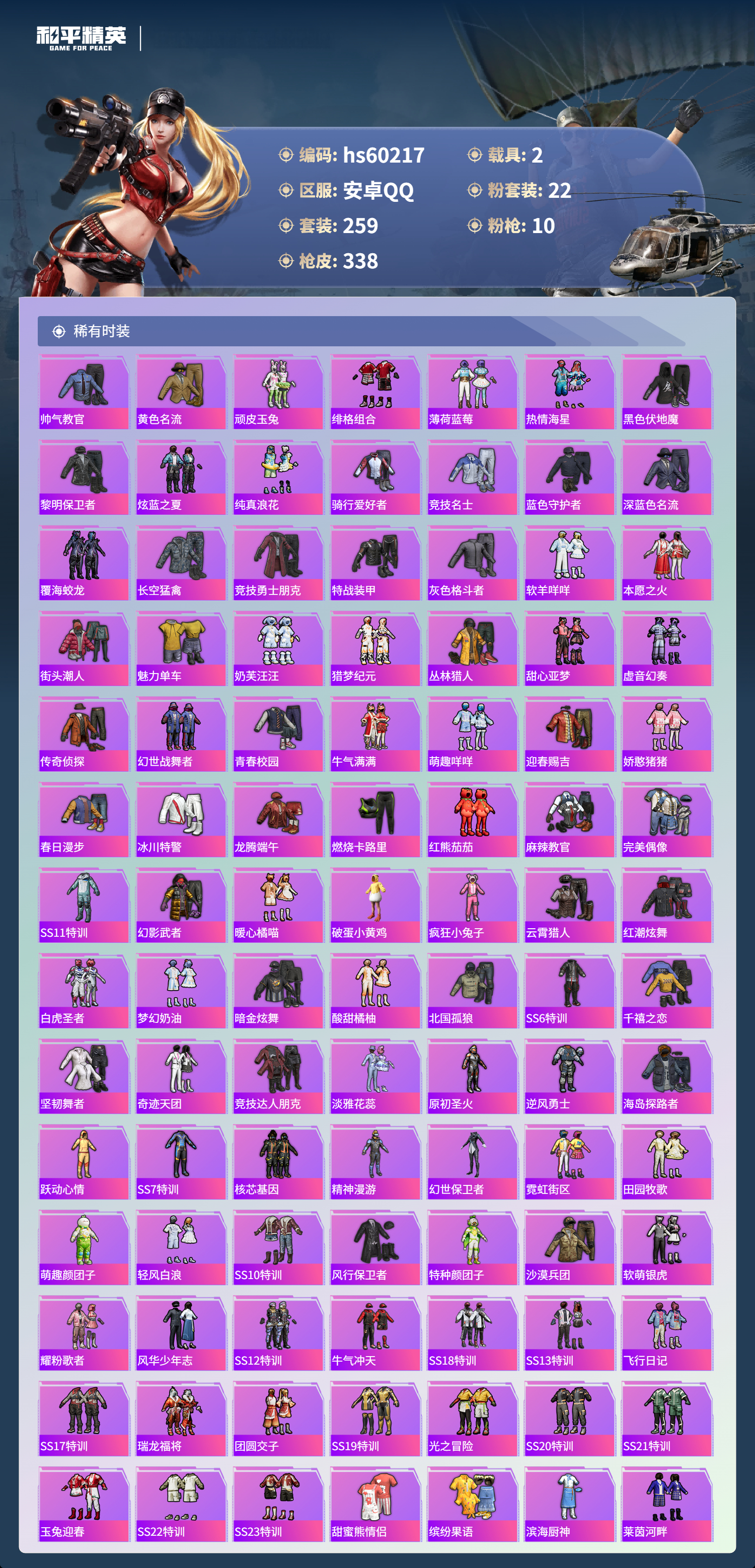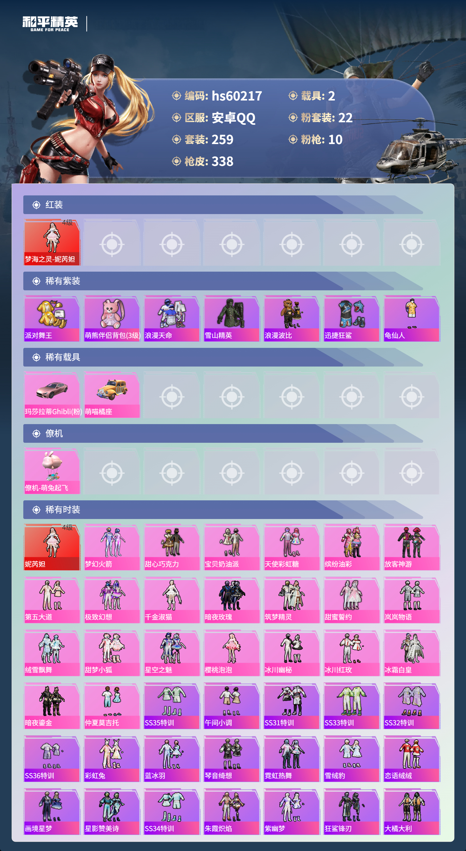 hs60217 安卓手q-19王牌印记-有战神框-1红装-22粉装-10特效呛-2载具-热力值-259套装-338呛皮-7卓越印记-3传奇印记【1红装】梦海之灵-妮芮妲/4级【22粉装】套装-极致幻想角色-樱桃泡泡套装-仲夏莫吉托套装-梦幻火箭套装-暗夜玫瑰套装-宝贝奶油派套装-岚岚物语套装-绒雪飘舞套装-第五大道套装-天使彩虹糖套装-甜梦小狐套装-星空之魅
