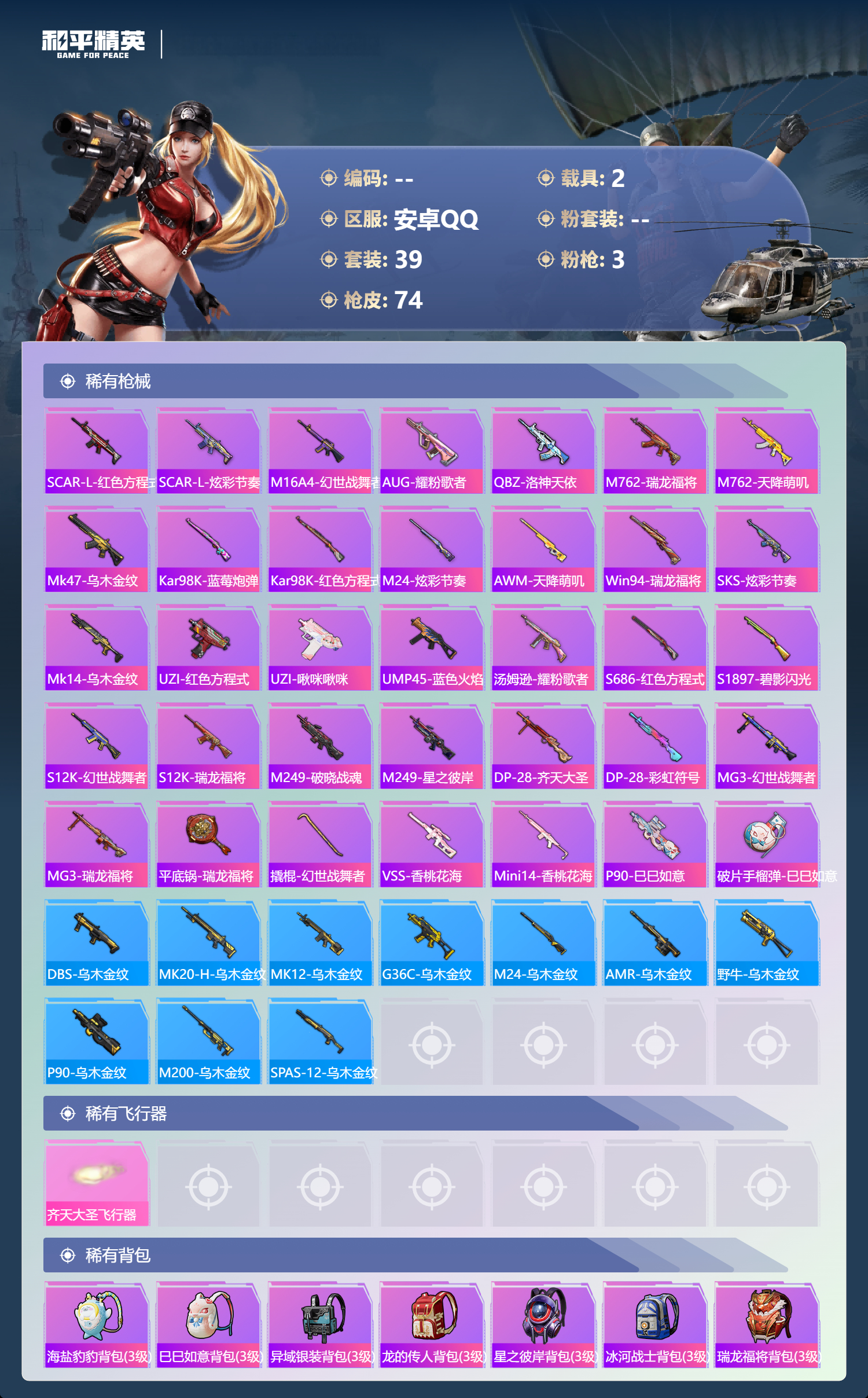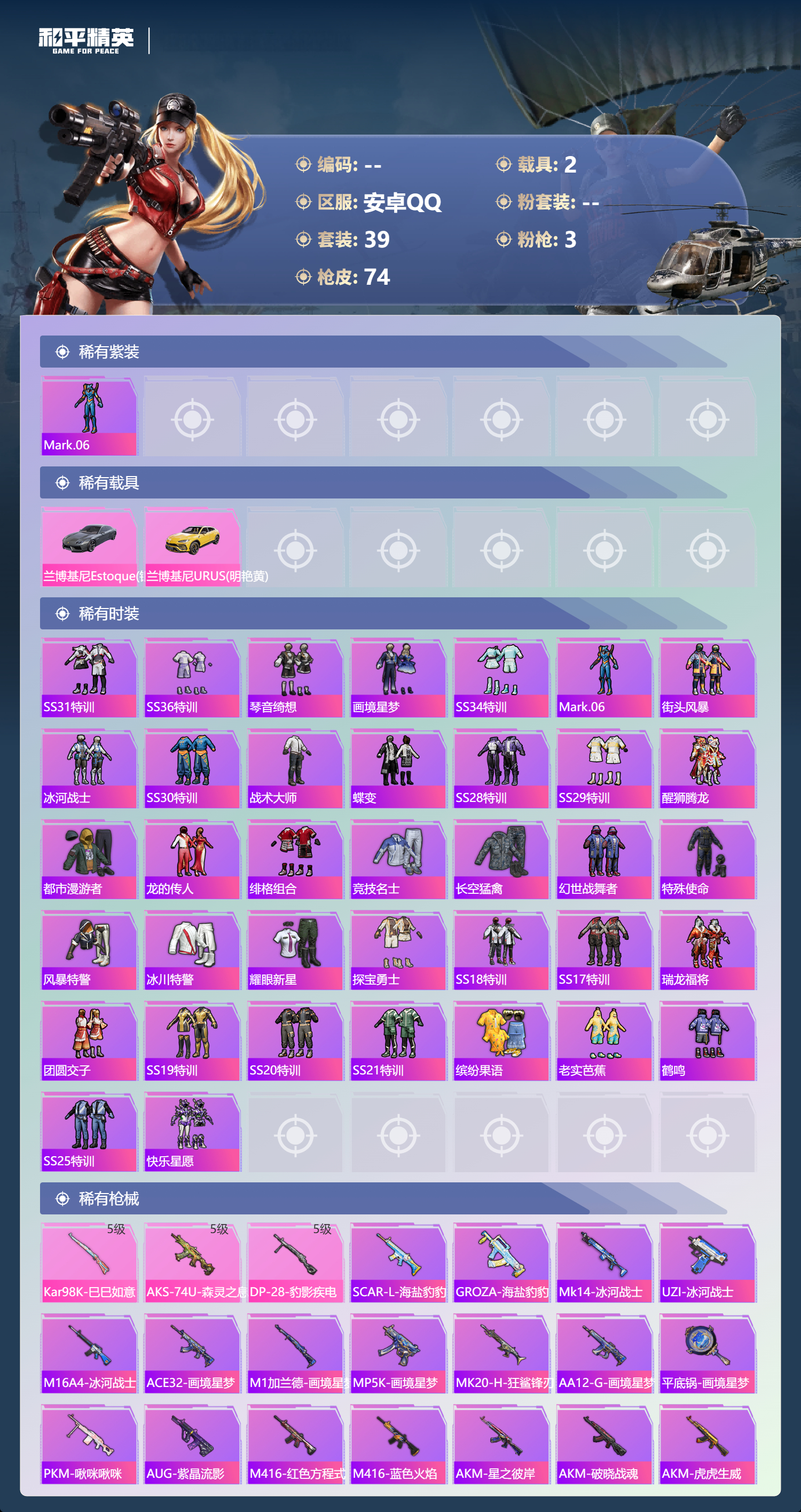 2载具-39套装-74呛皮-老款螳螂加两载具-安卓手q-4王牌印记-3特效呛-2载具-21692热力值-39套装-74呛皮【3特效呛】kar98k-巳巳如意/5级aks-74u-森灵之息/5级dp-28-豹影疾电/5级【1稀有紫装】mark.06【2稀有载具】兰博基尼estoque银翼灰兰博基尼urus明艳黄【37稀有时装】ss31特训ss36特训琴音绮想画境星梦ss34特训mark.06街