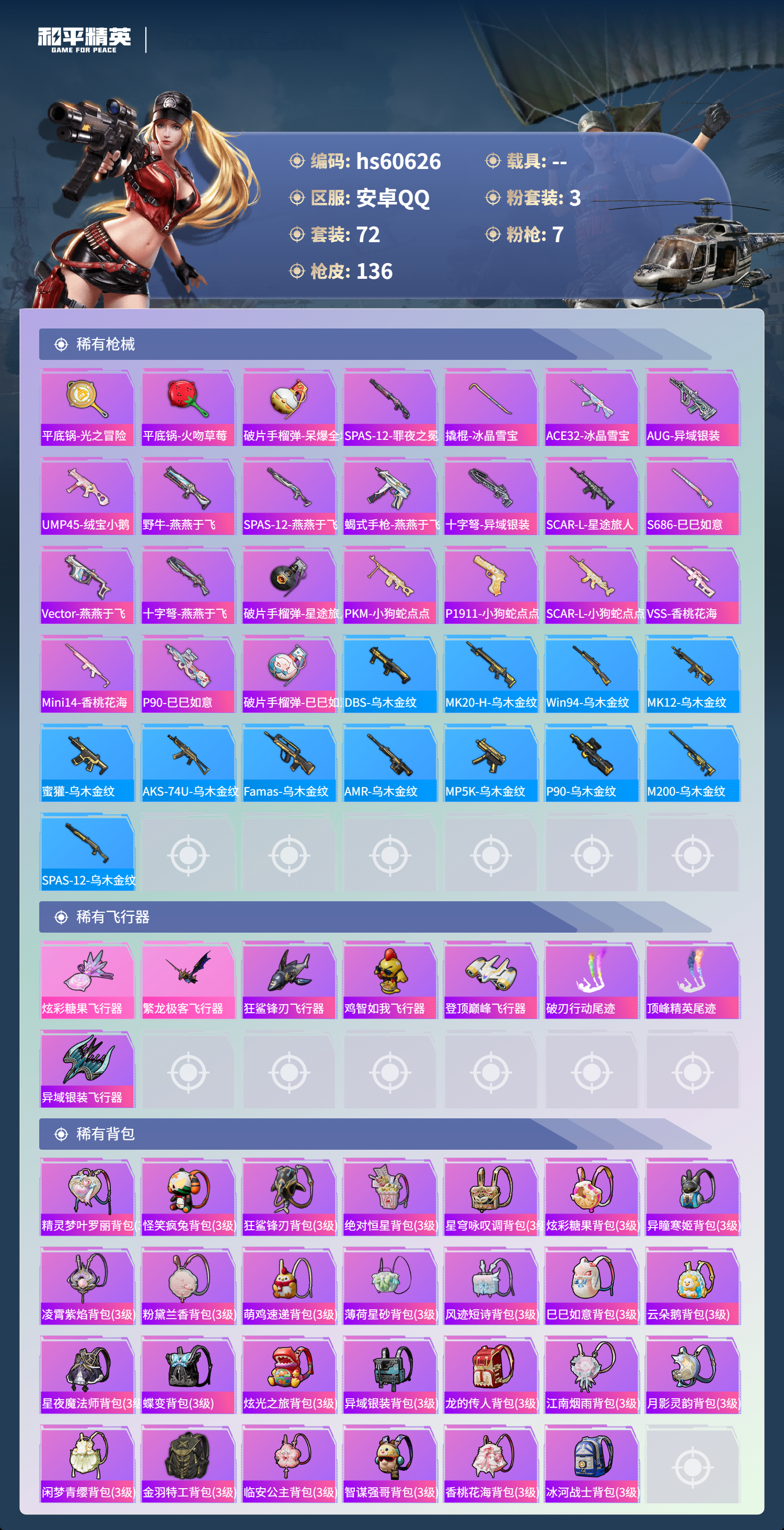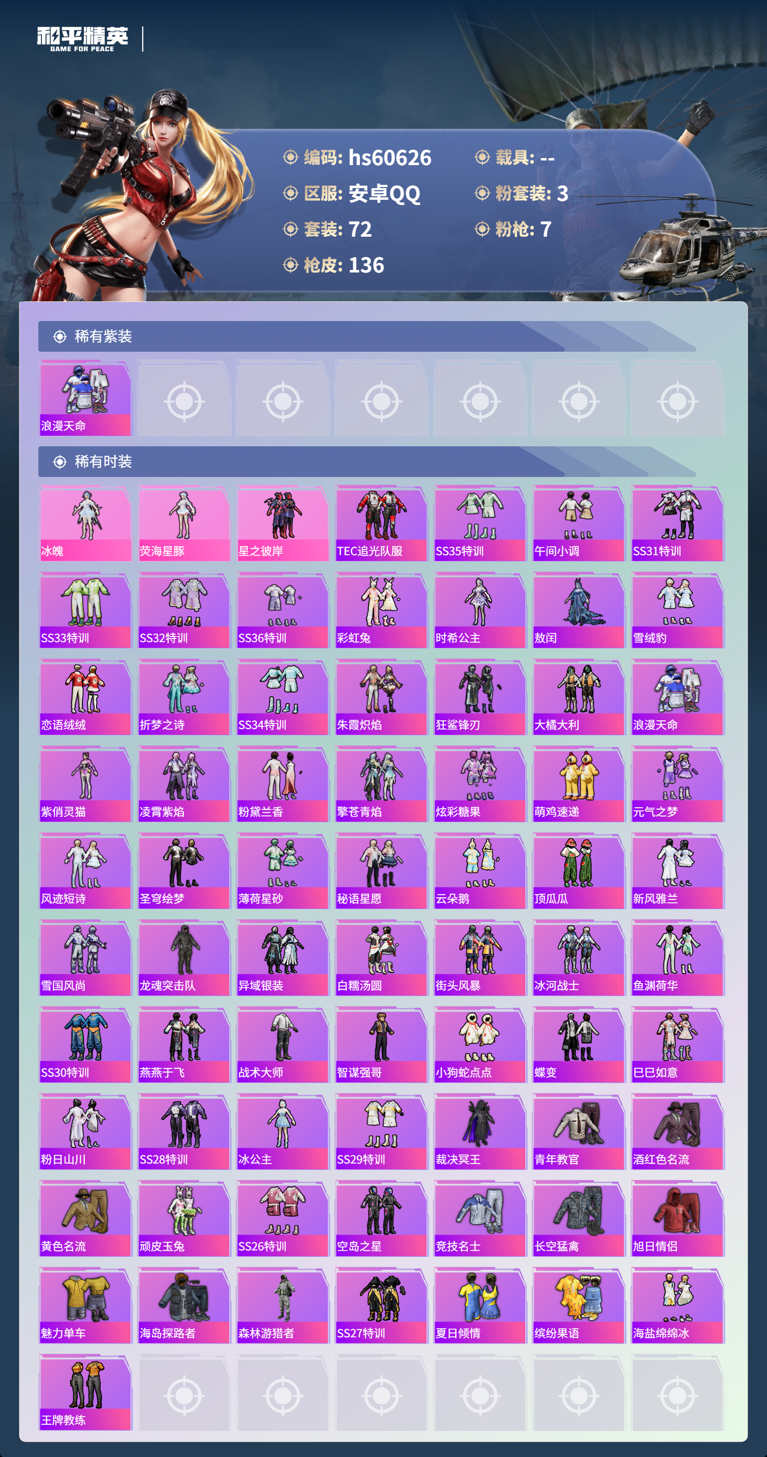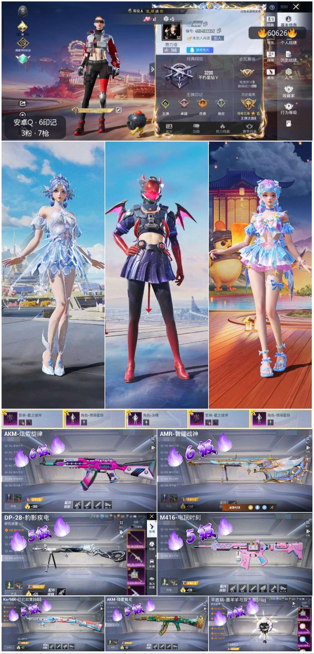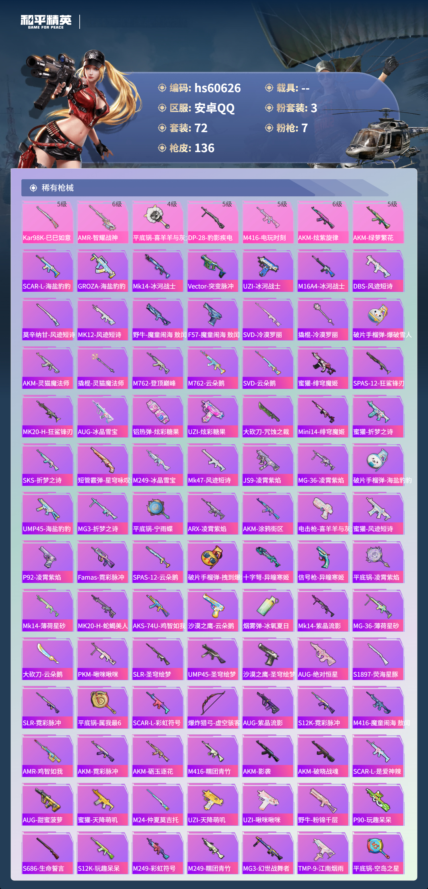 hs60626 安卓手q-6王牌印记-3粉装-7特效呛-37611热力值-72套装-136呛皮-3卓越印记-2传奇印记【3粉装】角色-荧海星豚套装-星之彼岸角色-冰魄【7特效呛】dp-28-豹影疾电/5级amr-智耀战神/6级kar98k-巳巳如意/5级m416-电玩时刻/5级akm-炫紫旋律/6级akm-绿萝繁花/5级平底锅-喜羊羊与灰太狼/4级【1稀有紫装】浪漫天命【7