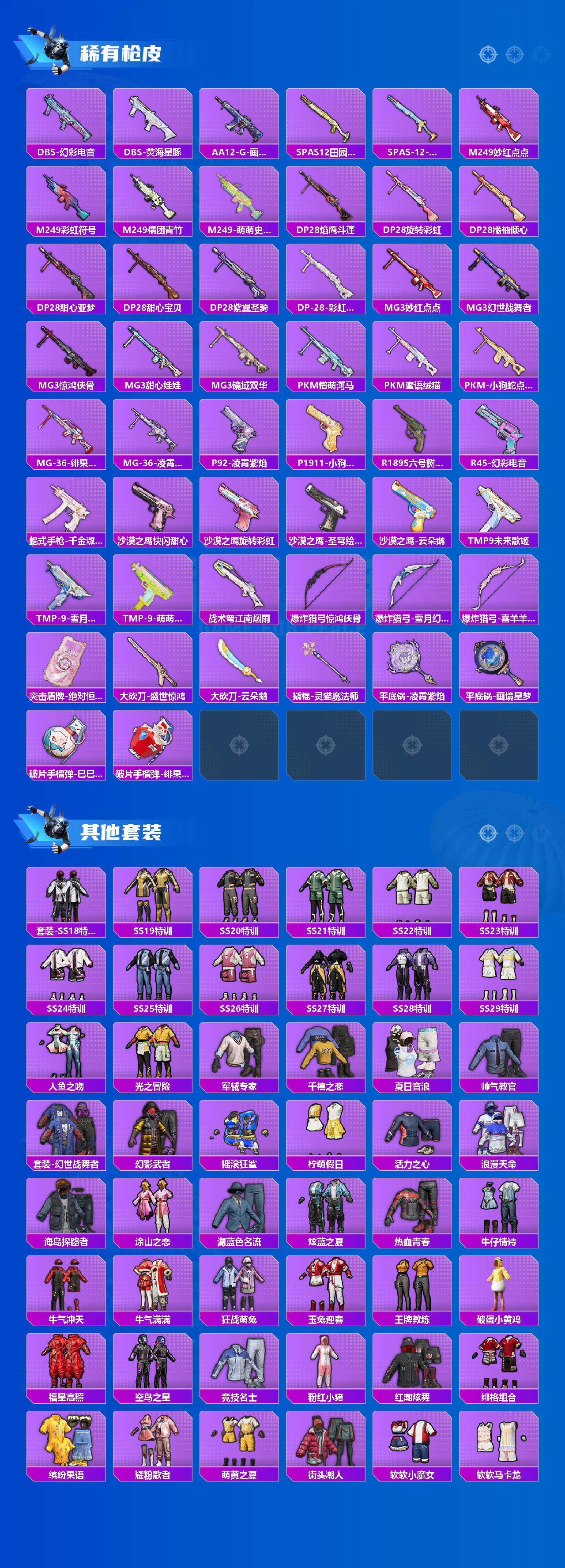 [15874656]苹果 【极品神装号 镜域双华-欧若拉五级/精灵之光-露米娜一级/怪诞乔克/都市猎人/甜心巧克力/放客神游/洛天依/m416-超新星九级/仰望u7(阿盖尔紫)】微信-2神装-47粉装-34特效呛-4载具-17粉色飞行器-156363热力值-19王牌印记-262套装-366呛皮 【红色神装等级】:精灵之光-露米娜一级,镜域双华-欧若拉五级 【红色角色神装】:精灵之光-露米娜,镜域双华-欧若拉 【热门品类】:粉装-怪诞乔克,粉装-童趣迷兔,粉装-缤纷油彩,套装-浪漫天命,套装-都市猎人,套装-深海小丑鱼,套装-小丑鱼,套装-奇异狩猎者,套装-胖达团团,套装-胖达圆圆,套装-动感兔斯基人偶服,套装-龟仙人,套装-潮萌小黄鸭,套装-粉红小猪,套装-软软马卡龙,套装-红熊茄茄 【粉色套装】:粉装-怪诞乔克,粉装-甜心巧克力,粉装-宝贝奶油派,粉装-天使彩虹糖,粉装-缤纷油彩,粉装-放客神游,粉装-星空之魅,粉装-童趣迷兔,粉装-炙焰红王,粉装-馨动时刻,粉装-彩虹鹿灵,粉装-山涧鹿灵,角色-洛天依,粉装-蓝莓炮弹,粉装-焦糖拿铁,粉装-岚岚物语,粉装-绚丽摇曳,粉装-甜梦小狐,粉装-妙趣可丽,粉装-暖熊萌萌,粉装-绒雪飘舞,粉装-傲雪凌霜,粉装-灵感创作师,粉装-甜蜜草莓,粉装-旋转彩虹,粉装-冰川幽秘,粉装-冰川红玫,粉装-霞光圣骑,粉装-寒光使者,粉装-第五大道,粉装-仲夏莫吉托,角色-呆萌星弥,角色-小可学妹,角色-圣堂之誓,角色-小叽联名款,粉装-蜜语绒猫,角色-小蓝,角色-美雪,角色-美琪,角色-鸢尾晶梦,角色-初号机 觉醒ver.,角色-千金淑猫,角色-樱桃泡泡,粉装-星月云朵,粉装-绯果甜心,粉装-星穹咏叹调,角色-羊梦糖心 【粉色呛皮等级】:akm-梦之光华一级,akm-白勺歌姬七级,akm-幽焰骑士三级,scar-l-甜梦小狐七级,m416-心之恋语一级,m416-超新星九级,m416-电玩时刻五级,groza-焦糖拿铁七级,groza-旋转彩虹一级,groza-精灵之光一级,aug-妙趣可丽五级,aug-暖羊咩咩五级,famas-翎光蝶翼七级,ump45-相思残雪一级,ump45-恐龙拽拽七级,vect-红伞翩翩七级,汤姆逊-冰川粉黛五级,汤姆逊-热量炸弹五级,