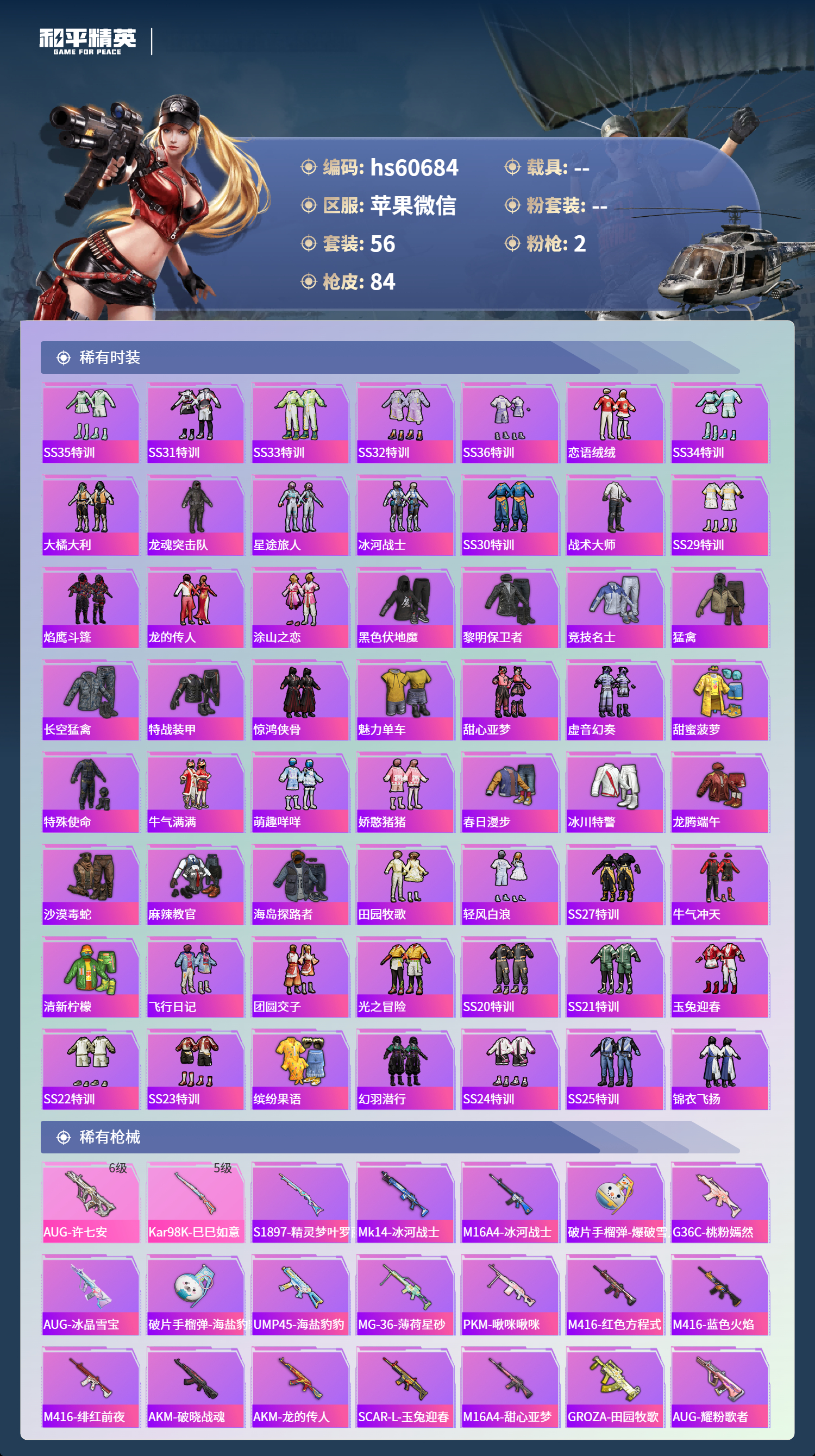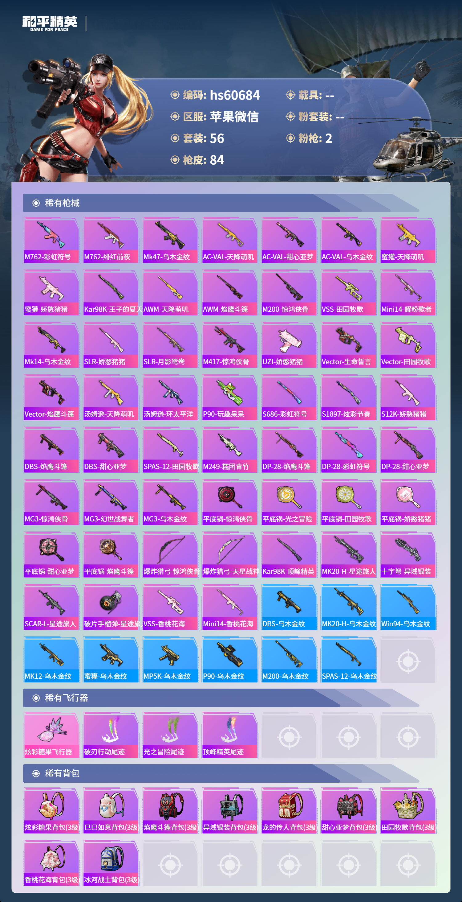 hs60684 苹果微信-4王牌印记-2特效呛-22776热力值-56套装-84呛皮【2特效呛】aug-许七安/6级kar98k-巳巳如意/5级【56稀有时装】ss35特训ss31特训ss33特训ss32特训ss36特训恋语绒绒ss34特训大橘大利龙魂突击队星途旅人冰河战士ss30特训战术大师ss29特训焰鹰斗篷龙的传人涂山之恋黑色伏地魔黎明保卫者竞技名