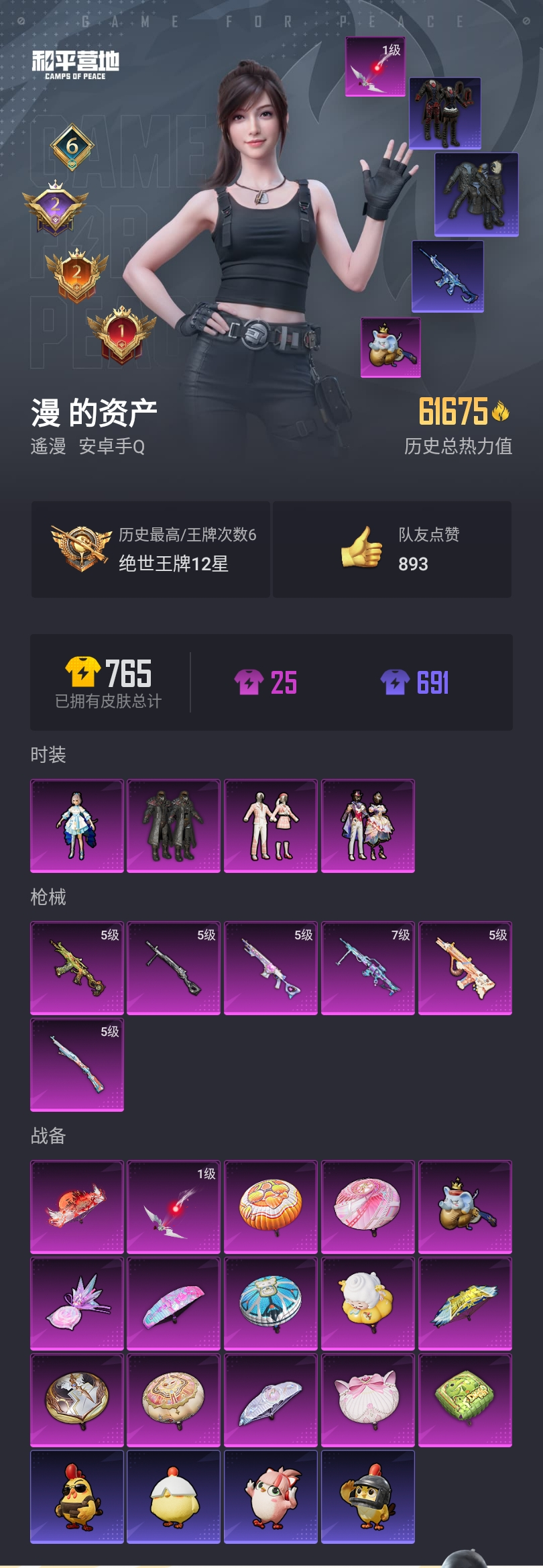 【和平精英】【lyhp22002】4粉装,6特效呛,0载具,历史最高段位:绝世王牌12星 王牌印记6次 热力值:61675,152套装,201呛械,252装备,129战备;套装:套装-未来战士,角色-洛天依,套装-第五大道,套装-星穹咏叹调,套装-特训学院,套装-青年教官,套装-红色运动,套装-黄色伏地魔,套装-白色伏地魔,套装-黑色伏地魔,套装-骑行爱好者,套装-竞技名士,套装-深蓝色名流,套装-酒红色名流,套装-湖蓝色名流,套装-黄色名流,套装-猛禽,套装-长空猛禽,套装-漫步者,套装-海岛探路者,套装-旭日情侣,套装-冷焰舞者,套装-都市猎人,套装-战地督导,套装-青春校园,套装-甜蜜告白,套装-沙漠毒蛇,套装-鹰眼刺客,套装-冰冻风暴,套装-完美偶像,套装-人气偶像,套装-街头潮人,套装-蓝彩潮人,套装-魅力单车,套装-绮丽涂鸦,套装-竞技达人朋克,套装-超能勇士,套装-狂沙舞者,套装-都市魅力,套装-酷潮明星,套装-幻世战舞者,套装-暗影哥特,套装-甜蜜熊情侣,套装-青涩时光,套装-缤纷果语,套装-滨海厨神,套装-冰川特警,套装-元素星魂,套装-极速红龙,套装-格斗先锋,套装-破蛋小黄鸡,套装-白熊同盟,套装-夏日音浪,套装-顽皮玉兔,套装-探宝勇士,套装-牛气满满,套装-白糯汤圆,套装-战术大师,套装-牛气冲天,套装-ss18特训,套装-耀粉歌者,套装-ss14特训,套装-吉莉礼服,套装-ss17特训,套装-福星高照,套装-空投萌叽,套装-ss19特训,套装-ss20特训,套装-ss21特训,套装-萌趣咩咩,套装-玉兔迎春,套装-轻风白浪,套装-光之冒险,套装-绯格组合,套装-香榭午后,套装-糯粉咩咩,套装-王牌教练,套装-柠萌假日,套装-锦衣飞扬,套装-香桃花海,套装-冰河战士,套装-漫游都市,套装-云魄琉璃,套装-恋语绒绒,套装-ss28特训,套装-街头风暴,套装-海盐绵绵冰,套装-蝶变,套装-小熊娃娃,套装-ss29特训,套装-雏菊兔兔,套装-萝兰蝴蝶,角色-紫俏灵猫,角色-无面战甲,套装-异域银装,角色-摩登魅猫,角色-都市丽猫,套装-星途旅人,角色-俏兔智灵,套装-ss30特训,套装-青团波波,套装-棉花软糖,套装-糖糖葫芦,套装-绒宝小鹅,套装-ss31特训,套装-鱼渊荷华,套装-燕燕于飞,套装-智谋强哥,套装-紫幽梦,套装-粉恋花,套装-ss33特训,套装-云朵鹅,套装-巳巳如意,套装-ss32特训,套装-彩虹兔,套装-青翼流星,套装-樱梦幻音,套装-蓝冰羽,套装-顶瓜瓜,套装-雪绒豹,套装-狂鲨锋刃,套装-大橘大利,套装-圣穹绘梦,套装-蜜露汐语,套装-炫彩糖果,套装-星影赞美诗,玩偶服-懒羊羊,玩偶服-喜羊羊,套装-元气之梦,套装-ss34特训,套装-擎苍青焰,套装-朱霞炽焰,套装-游乐,套装-凌霄紫焰,套装-薄荷星砂,套装-ss35特训,套装-午间小调,套装-秘语星愿,套装-风迹短诗,套装-琴音绮想,套装-粉黛兰香,角色-超感刻度,套装-画境星梦,套装-书海巡游,角色-霜纹水星,套装-ss37特训,套装-ss36特训,套装-红釉青花,套装-雪国风尚,套装-雨过天青,套装-超能元气,套装-萌鸡速递;呛皮:5级aug-暖羊咩咩,aug-耀粉歌者,aug-异域银装,aug-绝对恒星,aug-冰晶雪宝,aug-紫晶流影,m762-彩虹甜喵,m762-雏菊兔兔,m762-云朵鹅,m762-登顶巅峰,蜜獾-糖糖葫芦,蜜獾-鸡智如我,蜜獾-风迹短诗,蜜獾-乌木金纹,groza-影袭,groza-彩虹符号,groza-懵萌河马,groza-无面战甲,groza-暮色玫影,groza-紫矿核心,scar-l-红色方程式,scar-l-夜灯,scar-l-彩虹符号,scar-l-玉兔迎春,scar-l-星途旅人,scar-l-海盐豹豹,m416-蓝色火焰,m416-绯红前夜,m416-红色方程式,m416-魔童闹海 敖闰,famas-霓彩脉冲,famas-乌木金纹,g36c-乌木金纹,m16a4-蓝色火焰,m16a4-雨过天青,akm-影袭,akm-缤纷海域,akm-破晓战魂,akm-涂鸦街区,akm-彩虹符号,akm-虎虎生威,akm-荧星灵猫,akm-霓彩脉冲,akm-绿洲时空,arx-凌霄紫焰,mk47-乌木金纹,mk47-风迹短诗,ace32-画境星梦,ace32-冰晶雪宝,5级kar98k-巳巳如意,kar98k-顶峰精英,kar98k-乌木金纹,m200-乌木金纹,m24-影袭,m24-未来战士,m24-炫彩节奏,m24-天降萌叽,m24-蓝晶绮麟,m24-幻彩电音,m24-时光之吻,m24-乌木金纹,svd-云朵鹅,svd-霓彩脉冲,amr-妙红点点,amr-鸡智如我,amr-喜羊羊与灰太狼,amr-雨过天青,awm-天降萌叽,awm-暮色玫影,awm-绿洲时空,莫辛纳甘-风迹短诗,win94-乌木金纹,mk20-h-星途旅人,mk20-h-糖糖葫芦,mk20-h-狂鲨锋刃,mk20-h-乌木金纹,mk12-风迹短诗,mk12-乌木金纹,m417-玩趣呆呆,mini14-耀粉歌者,mini14-香桃花海,mini14-雏菊兔兔,mini14-绯穹魔姬,5级mk14-甜梦熊击,mk14-乌木金纹,mk14-冰河战士,mk14-紫幽梦,mk14-薄荷星砂,slr-霓彩脉冲,slr-乌木金纹,m1加兰德-画境星梦,sks-夜灯,vss-香桃花海,ump45-蓝色火焰,ump45-海盐豹豹,ump45-糖糖葫芦,ump45-圣穹绘梦,uzi-红色方程式,uzi-影袭,uzi-炫彩节奏,uzi-冰河战士,uzi-啾咪啾咪,uzi-月影灵韵,uzi-炫彩糖果,vect-生命誓言,vect-彩虹符号,vect-燕燕于飞,5级aks-74u-森灵之息,aks-74u-粉粉喵呜,aks-74u-鸡智如我,aks-74u-乌木金纹,mp5k-未来领航者,mp5k-画境星梦,汤姆逊-耀粉歌者,汤姆逊-炫彩节奏,p90-飞驰魅影,p90-巳巳如意,p90-紫矿核心,野牛-雏菊兔兔,野牛-燕燕于飞,野牛-乌木金纹,js9-凌霄紫焰,aa12-g-画境星梦,aa12-g-雨过天青,s12k-破晓战魂,s12k-夜灯,s12k-幻世战舞者,s12k-玩趣呆呆,s12k-极意拳锋,s12k-霓彩脉冲,dbs-月影灵韵,dbs-风迹短诗,dbs-乌木金纹,spas-12-燕燕于飞,spas-12-狂鲨锋刃,spas-12-云朵鹅,spas-12-乌木金纹,s1897-春暖花开,s1897-炫彩节奏,s1897-碧影闪光,s1897-紫幽梦,s1897-糯团青竹,s1897-乌木金纹,s686-红色方程式,s686-彩虹符号,s686-巳巳如意,m249-破晓战魂,m249-彩虹符号,m249-无面战甲,m249-冰晶雪宝,m249-乌木金纹,7级mg-36-幻彩电