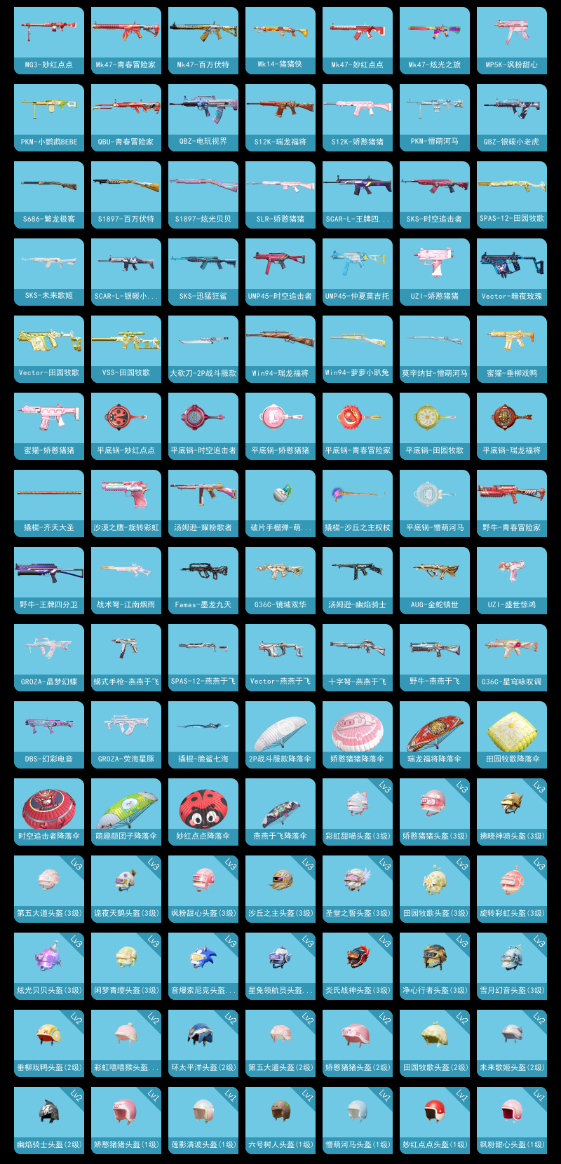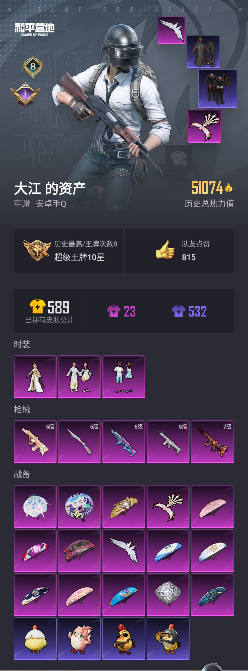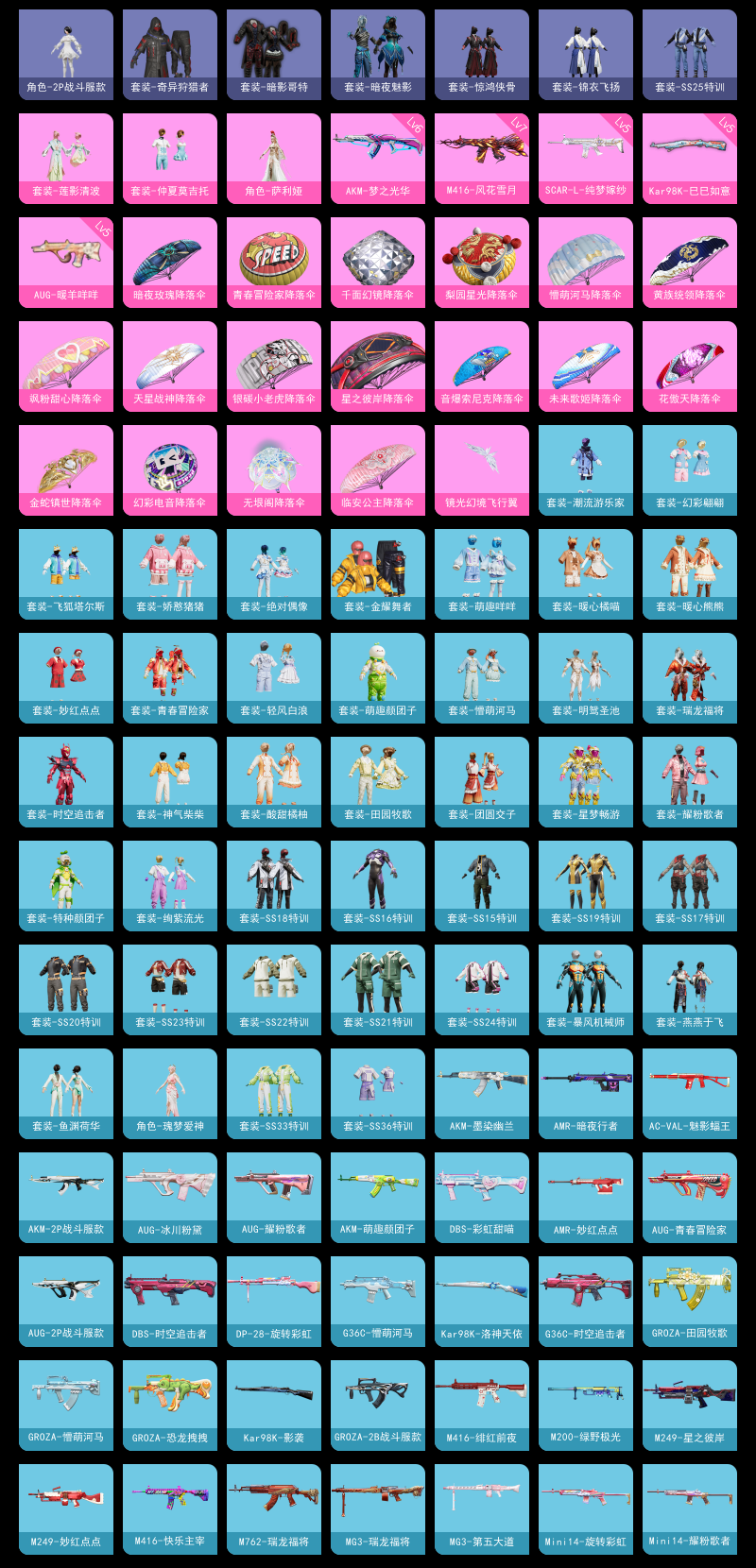 【和平精英】【lyhp22021】3粉装,5特效呛,0载具,历史最高段位:超级王牌10星 王牌印记8次 热力值:51074,103套装,182呛械,191装备,94战备;套装:套装-仲夏莫吉托,套装-莲影清波,角色-萨利娅,套装-特训学院,套装-青年教官,套装-黄色运动,套装-蓝色运动,套装-黑色伏地魔,套装-竞技名士,套装-酒红色名流,套装-黄色名流,套装-长空猛禽,套装-雨林探路者,套装-旭日情侣,套装-特殊使命,套装-龙腾端午,套装-燃烧卡路里,套装-沙漠毒蛇,套装-魅力单车,套装-绮丽涂鸦,套装-耀眼新星,套装-都市漫游者,套装-野性战魂,套装-都市魅力,套装-沙漠兵团,套装-幻世战舞者,套装-奇异狩猎者,套装-金耀舞者,套装-暗影哥特,套装-缤纷果语,套装-冰川特警,套装-海上生明月,套装-麻辣教官,套装-破蛋小黄鸡,套装-疯狂小兔子,套装-鹤鸣,套装-青春冒险家,套装-潮流游乐家,套装-萌趣颜团子,套装-特种颜团子,套装-战术大师,套装-ss18特训,套装-耀粉歌者,套装-吉莉礼服,套装-星梦畅游,套装-ss15特训,套装-ss16特训,套装-暴风机械师,套装-时空追击者,套装-暗夜魅影,套装-ss17特训,套装-瑞龙福将,套装-团圆交子,套装-福星高照,套装-空投萌叽,套装-ss19特训,套装-ss20特训,套装-ss21特训,套装-暖心熊熊,套装-萌趣咩咩,套装-娇憨猪猪,套装-暖心橘喵,套装-酸甜橘柚,套装-玉兔迎春,套装-ss22特训,套装-田园牧歌,套装-轻风白浪,套装-光之冒险,套装-绯格组合,套装-ss23特训,套装-飞狐塔尔斯,套装-神气柴柴,套装-懵萌河马,套装-妙红点点,套装-幻彩翩翩,套装-王牌教练,套装-ss24特训,套装-绚紫流光,套装-龟仙人,套装-ss25特训,套装-惊鸿侠骨,套装-锦衣飞扬,套装-绝对偶像,角色-2p战斗服款,套装-龙的传人,套装-空岛之星,套装-明鸳圣池,套装-街头风暴,套装-异域银装,角色-许七安,套装-ss30特训,套装-ss31特训,套装-鱼渊荷华,套装-燕燕于飞,角色-瑰梦爱神,套装-ss33特训,套装-ss32特训,套装-青翼流星,套装-大橘大利,套装-ss34特训,套装-ss37特训,套装-ss36特训,套装-雪国风尚;呛皮:5级scar-l-纯梦嫁纱,scar-l-夜灯,scar-l-王牌四分卫,scar-l-炫彩节奏,scar-l-银碳小老虎,scar-l-玉兔迎春,scar-l-星途旅人,scar-l-绿洲时空,蜜獾-娇憨猪猪,蜜獾-垂柳戏鸭,蜜獾-天降萌叽,蜜獾-鸡智如我,蜜獾-乌木金纹,q-彩虹符号,q-电玩视界,q-银碳小老虎,mk47-百万伏特,mk47-青春冒险家,mk47-乌木金纹,mk47-妙红点点,mk47-炫光之旅,famas-墨龙九天,famas-乌木金纹,g36c-时空追击者,g36c-懵萌河马,g36c-镜域双华,g36c-星穹咏叹调,g36c-乌木金纹,7级m416-风花雪月,m416-绯红前夜,m416-红色方程式,m416-快乐主宰,groza-彩虹符号,groza-恐龙拽拽,groza-田园牧歌,groza-懵萌河马,groza-2b战斗服款,groza-晶梦幻蝶,groza-荧海星豚,m16a4-幻世战舞者,5级aug-暖羊咩咩,aug-耀粉歌者,aug-青春冒险家,aug-冰川粉黛,aug-天降萌叽,aug-2p战斗服款,aug-异域银装,aug-金蛇镇世,ac-val-乌木金纹,ac-val-魅影蝠王,ac-val-天降萌叽,ac-val-玩趣呆呆,6级akm-梦之光华,akm-生命誓言,akm-彩虹符号,akm-萌趣颜团子,akm-墨染幽兰,akm-2p战斗服款,akm-龙的传人,ace32-冰晶雪宝,m762-瑞龙福将,m200-绿野极光,m200-惊鸿侠骨,m200-乌木金纹,amr-暗夜行者,amr-妙红点点,amr-乌木金纹,5级kar98k-巳巳如意,kar98k-影袭,kar98k-洛神天依,kar98k-乌木金纹,awm-天降萌叽,win94-瑞龙福将,win94-萝萝小趴兔,莫辛纳甘-乌木金纹,莫辛纳甘-懵萌河马,m24-乌木金纹,mini14-耀粉歌者,mini14-旋转彩虹,mini14-涂山之恋,mini14-香桃花海,sks-迅猛狂鲨,sks-时空追击者,sks-未来歌姬,mk14-乌木金纹,mk14-猪猪侠,vss-田园牧歌,vss-香桃花海,slr-娇憨猪猪,slr-乌木金纹,mk20-h-狂鲨锋刃,qbu-青春冒险家,mk12-乌木金纹,m417-惊鸿侠骨,汤姆逊-耀粉歌者,汤姆逊-天降萌叽,汤姆逊-幽焰骑士,野牛-王牌四分卫,野牛-青春冒险家,野牛-燕燕于飞,野牛-乌木金纹,uzi-炫彩节奏,uzi-娇憨猪猪,uzi-天降萌叽,uzi-啾咪啾咪,uzi-盛世惊鸿,ump45-夜灯,ump45-时空追击者,ump45-仲夏莫吉托,ump45-涂山之恋,ump45-海盐豹豹,vect-彩虹符号,vect-暗夜玫瑰,vect-田园牧歌,vect-燕燕于飞,p90-巳巳如意,p90-紫矿核心,p90-乌木金纹,aks-74u-乌木金纹,mp5k-飒粉甜心,dbs-时空追击者,dbs-彩虹甜喵,dbs-幻彩电音,s12k-瑞龙福将,s12k-娇憨猪猪,s12k-幻世战舞者,s12k-玩趣呆呆,s686-红色方程式,s686-繁龙极客,s1897-百万伏特,s1897-炫光贝贝,s1897-炫彩节奏,s1897-乌木金纹,spas-12-田园牧歌,spas-12-燕燕于飞,spas-12-狂鲨锋刃,spas-12-乌木金纹,mg-36-薄荷星砂,mg3-瑞龙福将,mg3-幻世战舞者,mg3-乌木金纹,mg3-妙红点点,mg3-第五大道,mg3-惊鸿侠骨,dp-28-彩虹符号,dp-28-旋转彩虹,pkm-小鹦鹉bebe,pkm-懵萌河马,pkm-啾咪啾咪,m249-破晓战魂,m249-星之彼岸,m249-妙红点点,m249-冰晶雪宝,蝎式手呛-燕燕于飞,短管霰弹2b战斗服款,短管霰弹-竹节火铳,沙墨之鹦-旋转彩虹,平底锅-青春冒险家,平底锅-时空追击者,平底锅-瑞龙福将,平底锅-娇憨猪猪,平底锅-田园牧歌,平底锅-光之冒险,平底锅-妙红点点,平底锅-懵萌河马,平底锅-惊鸿侠骨,平底锅-空岛之星,撬棍-齐天大圣,撬棍-幻世战舞者,撬棍-沙丘之主权杖,撬棍-脆鲨七海,大砍刀-2p战斗服款,大砍刀-黑金刀,盐雾蛋-冰氧夏日,突击盾牌-黄族统领,爆炸猎弓-惊鸿侠骨,燃烧瓶-福马献瑞,破片手留单-萌趣颜团子,破片手留单-呆爆全场,十子怒-燕燕于飞,十子怒-异域银装,战术弩-江南烟雨;降落伞:镜光幻境飞行翼,凤舞九天飞行器,红色滑翔尾迹,异域银装飞行器,顶峰精英尾迹; 详情看图3粉装5特效呛 满级m
