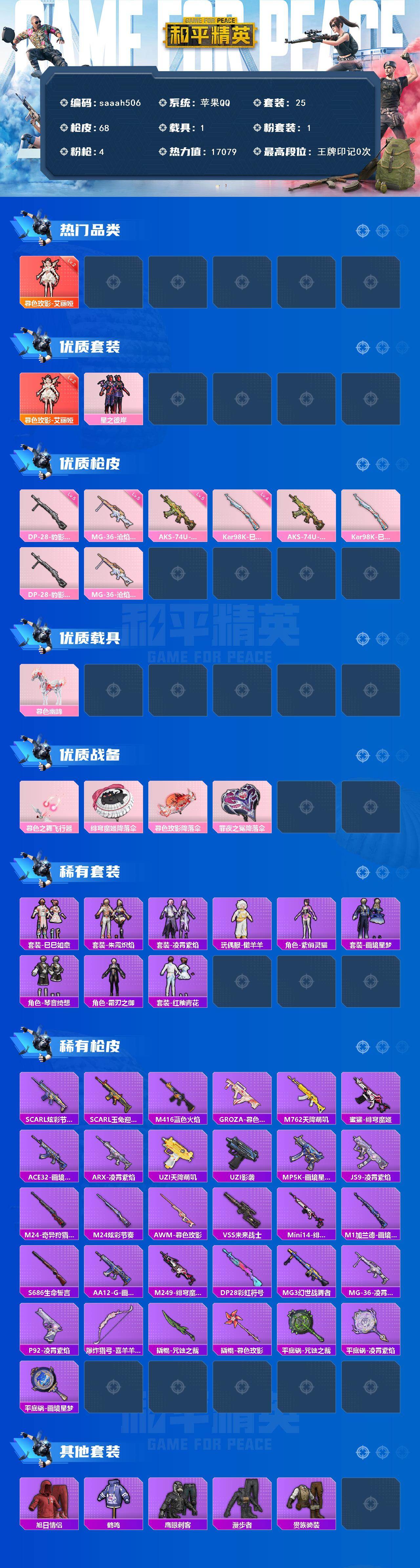 1载具-25套装-68呛皮-苹果 手q-1神装-1粉装-4特效呛-1载具-1粉色飞行器-17079热力值-1王牌印记-25套装-68呛皮 【红色神装等级】:暮色玫影-艾丽娅二级 【红色角色神装】:暮色玫影-艾丽娅 【粉色套装】:粉装-星之彼岸 【粉色呛皮等级】:aks-74u-森灵之息五级,kar98k-巳巳如意四级,dp-28-豹影疾电五级,mg-36-沧焰双生五级 【粉色载具】:暮色幽蹄 【粉色呛