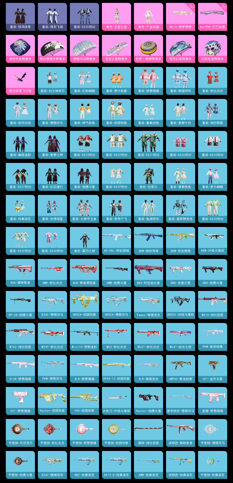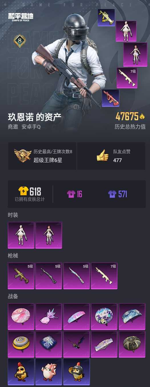 【和平精英】【lyhp22012】2粉装,4特效呛,0载具,历史最高段位:超级王牌6星 王牌印记8次 热力值:47675,109套装,185呛械,195装备,112战备;套装:角色-圣堂之誓,角色-千金淑猫,套装-特训学院,套装-猎鹰,套装-青年教官,套装-橘黑制服,套装-红色运动,套装-黄色运动,套装-蓝色运动,套装-黄色伏地魔,套装-白色伏地魔,套装-黑色伏地魔,套装-竞技名士,套装-深蓝色名流,套装-酒红色名流,套装-湖蓝色名流,套装-黄色名流,套装-猛禽,套装-长空猛禽,套装-海岛探路者,套装-旭日情侣,套装-冷焰舞者,套装-战地督导,套装-特殊使命,套装-完美偶像,套装-人气偶像,套装-魅力单车,套装-绮丽涂鸦,套装-竞技达人朋克,套装-都市魅力,套装-青涩时光,套装-龙魂突击队,套装-风暴特警,套装-冰川特警,套装-麻辣教官,套装-鹤鸣,套装-智慧之神,套装-战术大师,套装-飞行日记,套装-热情海星,套装-纯真浪花,套装-ss21特训,套装-萌趣咩咩,套装-娇憨猪猪,套装-玉兔迎春,套装-ss22特训,套装-田园牧歌,套装-轻风白浪,套装-绚烂繁星,套装-光之冒险,套装-绯格组合,套装-ss23特训,套装-香榭午后,套装-白兰地假日,套装-神气柴柴,套装-懵萌河马,套装-妙红点点,套装-幻彩翩翩,套装-王牌教练,套装-青玉碎影,套装-ss24特训,套装-龟仙人,套装-涂山之恋,套装-ss25特训,套装-惊鸿侠骨,套装-锦衣飞扬,套装-香桃花海,套装-果汁能量,套装-龙的传人,套装-冰河战士,套装-ss26特训,套装-空岛之星,套装-童真绒兔,套装-焰鹰斗篷,套装-幽夜迷踪,套装-幻羽潜行,套装-ss27特训,套装-恋语绒绒,套装-老实芭蕉,角色-拉斐尔,套装-街头风暴,套装-海盐绵绵冰,套装-蝶变,套装-ss29特训,套装-雏菊兔兔,套装-萝兰蝴蝶,套装-火种守卫者,套装-星途旅人,角色-俏兔智灵,套装-ss31特训,套装-鱼渊荷华,套装-燕燕于飞,套装-智谋强哥,套装-ss33特训,套装-巳巳如意,套装-ss32特训,套装-青翼流星,套装-狂鲨锋刃,套装-炫彩糖果,套装-星影赞美诗,套装-元气之梦,套装-ss34特训,套装-薄荷星砂,套装-ss35特训,套装-ss37特训,套装-ss36特训,角色-霜刃之御,套装-雪国风尚,套装-萌鸡速递;呛皮:m16a4-冰河战士,m762-绯红前夜,m762-彩虹符号,m762-天降萌叽,m762-雏菊兔兔,scar-l-红色方程式,scar-l-夜灯,scar-l-炫彩节奏,scar-l-彩虹符号,scar-l-玉兔迎春,scar-l-星途旅人,scar-l-海盐豹豹,scar-l-绿洲时空,groza-田园牧歌,groza-懵萌河马,groza-2b战斗服款,groza-紫矿核心,蜜獾-娇憨猪猪,蜜獾-天降萌叽,蜜獾-乌木金纹,q-纯真浪花,aug-耀粉歌者,aug-青春冒险家,aug-天降萌叽,aug-异域银装,aug-月影灵韵,aug-紫晶流影,m416-蓝色火焰,m416-绯红前夜,m416-红色方程式,m416-糯团青竹,m416-极冰使者,akm-缤纷海域,akm-破晓战魂,akm-涂鸦街区,akm-恐龙拽拽,akm-2p战斗服款,akm-龙的传人,akm-玄冥寒域,akm-霓彩脉冲,ac-val-乌木金纹,ac-val-彩虹甜喵,ac-val-天降萌叽,g36c-懵萌河马,g36c-镜域双华,mk47-乌木金纹,mk47-妙红点点,mk47-炫光之旅,famas-璀璨流光,famas-乌木金纹,ace32-冰晶雪宝,win94-乌木金纹,5级kar98k-巳巳如意,kar98k-王子的夏天,kar98k-顶峰精英,awm-天降萌叽,awm-焰鹰斗篷,awm-纯真浪花,m200-惊鸿侠骨,m200-乌木金纹,amr-妙红点点,amr-鸡智如我,amr-乌木金纹,莫辛纳甘-乌木金纹,莫辛纳甘-懵萌河马,slr-娇憨猪猪,slr-彩虹符号,slr-璀璨流光,slr-乌木金纹,7级mk14-闲梦青缨,mk14-冰河战士,sks-炫彩节奏,sks-糯团青竹,mk12-乌木金纹,mini14-穿刺龙虾,mini14-香桃花海,mini14-雏菊兔兔,mk20-h-星途旅人,mk20-h-狂鲨锋刃,mk20-h-乌木金纹,vss-田园牧歌,vss-香桃花海,m417-惊鸿侠骨,ump45-夜灯,ump45-蓝色火焰,ump45-生命誓言,ump45-涂山之恋,ump45-繁龙极客,ump45-极意拳锋,5级aks-74u-森灵之息,aks-74u-尼罗河传说,aks-74u-鬼刀,aks-74u-乌木金纹,uzi-金风玉露,uzi-娇憨猪猪,uzi-天降萌叽,uzi-冰河战士,uzi-啾咪啾咪,uzi-炫彩糖果,vect-生命誓言,vect-彩虹符号,vect-田园牧歌,vect-焰鹰斗篷,vect-创世·救赎,vect-燕燕于飞,mp5k-乌木金纹,汤姆逊-耀粉歌者,汤姆逊-炫彩节奏,汤姆逊-天降萌叽,汤姆逊-纯真浪花,p90-玩趣呆呆,p90-巳巳如意,p90-紫矿核心,p90-乌木金纹,野牛-雏菊兔兔,野牛-燕燕于飞,dbs-时空追击者,dbs-彩虹符号,dbs-圣堂之誓,dbs-焰鹰斗篷,dbs-净心行者,dbs-乌木金纹,s12k-夜灯,s12k-娇憨猪猪,s12k-玩趣呆呆,s12k-守护天翼,s12k-霓彩脉冲,s686-生命誓言,s686-巳巳如意,spas-12-田园牧歌,spas-12-燕燕于飞,spas-12-狂鲨锋刃,spas-12-福马献瑞,spas-12-乌木金纹,aa12-g-纯真浪花,m249-彩虹符号,m249-糯团青竹,m249-妙红点点,m249-金丰海韵,pkm-懵萌河马,pkm-蜜语绒猫,pkm-啾咪啾咪,mg3-幻世战舞者,mg3-乌木金纹,mg3-妙红点点,mg3-惊鸿侠骨,5级dp-28-豹影疾电,dp-28-彩虹符号,dp-28-焰鹰斗篷,mg-36-薄荷星砂,p1911-小狗蛇点点,蝎式手呛-燕燕于飞,r1895-雏菊兔兔,r45-拳皇·狂花道,沙墨之鹦-未来领航者,平底锅-风花雪月,平底锅-娇憨猪猪,平底锅-田园牧歌,平底锅-光之冒险,平底锅-妙红点点,平底锅-懵萌河马,平底锅-惊鸿侠骨,平底锅-空岛之星,平底锅-花傲天,平底锅-焰鹰斗篷,平底锅-纯真浪花,平底锅-雏菊兔兔,平底锅-许七安,平底锅-霁蓝缠春,撬棍-绯红前夜,撬棍-冰晶雪宝,大砍刀-2p战斗服款,大砍刀-黑金刀,破片手留单-呆爆全场,破片手留单-星途旅人,破片手留单-海盐豹豹,破片手留单-拽到爆炸,破片手留单-巳巳如意,破片手留单-爆破雪人,爆炸猎弓-惊鸿侠骨,十子怒-燕燕于飞,十子怒-异域银装,盐雾蛋-冰氧夏日,燃烧瓶-福马献瑞,铝热弹-炫彩糖果;降落伞:繁龙极客
