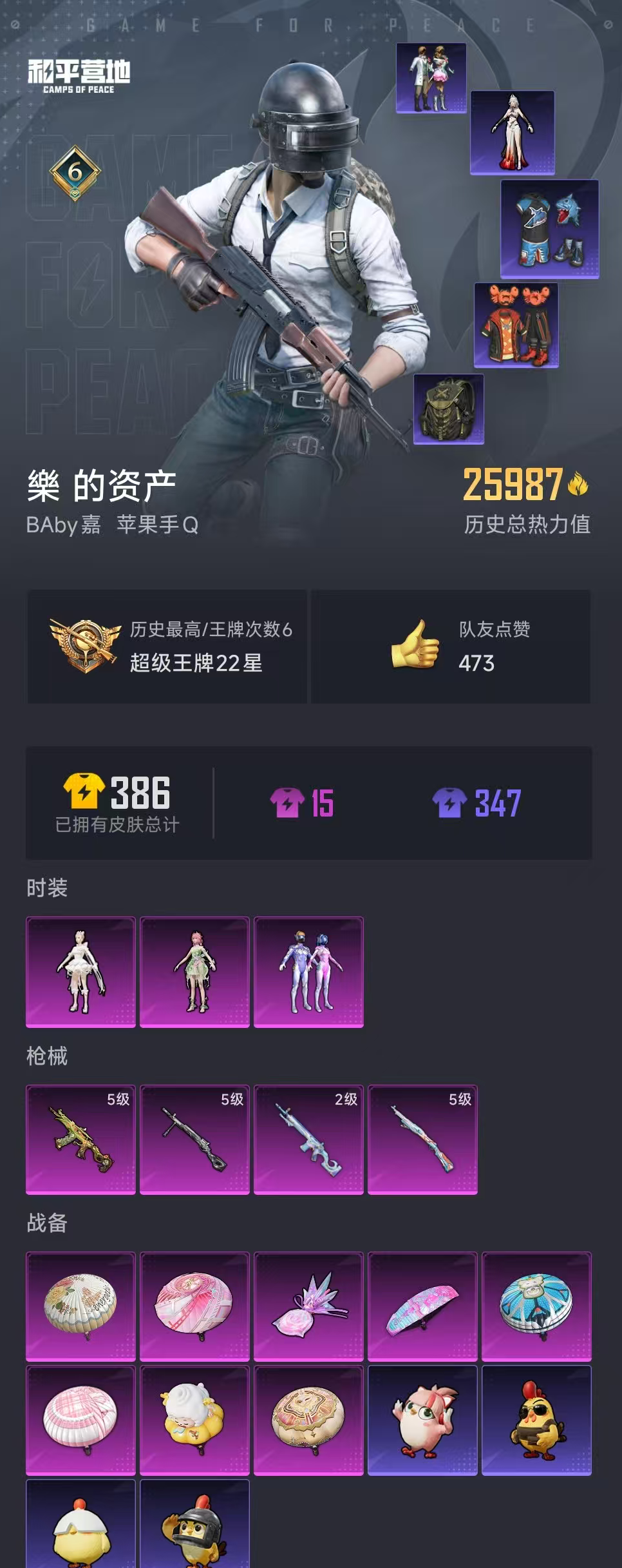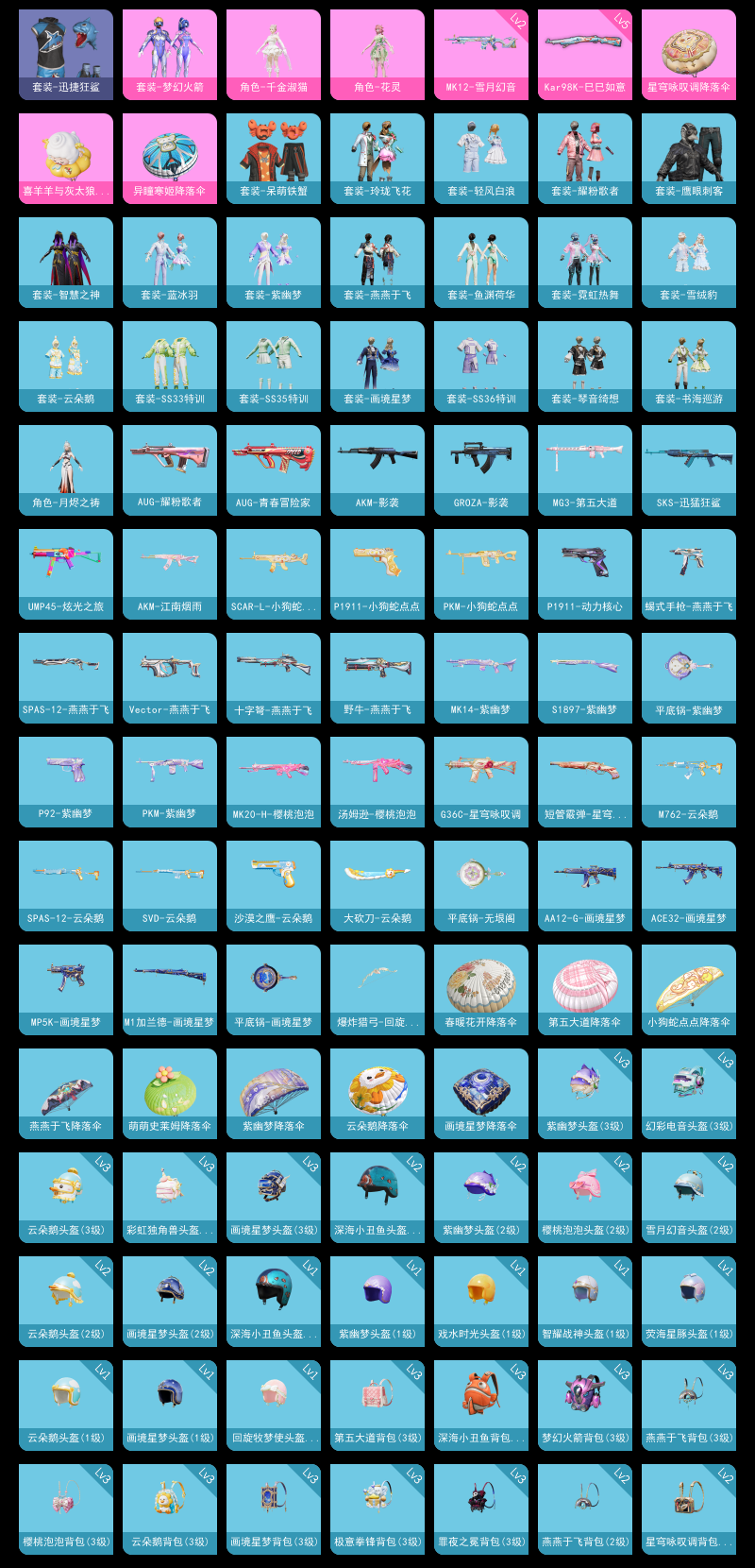 【和平精英】【lyhp21997】3粉装,4特效呛,0载具,历史最高段位:超级王牌22星 王牌印记6次 热力值:25987,83套装,104呛械,119装备,62战备;套装:套装-梦幻火箭,角色-千金淑猫,角色-花灵,套装-特训学院,套装-猎鹰,套装-青年教官,套装-橘黑制服,套装-红色运动,套装-黄色运动,套装-蓝色运动,套装-黄色伏地魔,套装-白色伏地魔,套装-黑色伏地魔,套装-竞技名士,套装-深蓝色名流,套装-酒红色名流,套装-湖蓝色名流,套装-黄色名流,套装-猛禽,套装-长空猛禽,套装-旭日情侣,套装-冷焰舞者,套装-灼焰舞者,套装-战地督导,套装-鹰眼刺客,套装-完美偶像,套装-幻影武者,套装-街头潮人,套装-蓝彩潮人,套装-魅力单车,套装-绮丽涂鸦,套装-竞技达人朋克,套装-都市魅力,套装-热血青春,套装-幻世战舞者,套装-迅捷狂鲨,套装-呆萌铁蟹,套装-缤纷果语,套装-滨海厨神,套装-元素星魂,套装-极速红龙,套装-破蛋小黄鸡,套装-玲珑飞花,套装-智慧之神,套装-战术大师,套装-耀粉歌者,套装-轻风白浪,套装-绯格组合,套装-柠萌假日,套装-云魄琉璃,套装-恋语绒绒,套装-异域银装,套装-绒宝小鹅,套装-ss31特训,套装-鱼渊荷华,套装-燕燕于飞,套装-紫幽梦,套装-ss33特训,套装-云朵鹅,套装-ss32特训,套装-青翼流星,套装-蓝冰羽,套装-顶瓜瓜,套装-雪绒豹,套装-狂鲨锋刃,套装-大橘大利,套装-霓虹热舞,套装-炫彩糖果,套装-元气之梦,套装-ss34特训,套装-游乐,套装-薄荷星砂,套装-ss35特训,套装-琴音绮想,套装-粉黛兰香,套装-画境星梦,套装-书海巡游,角色-月烬之祷,套装-ss37特训,套装-ss36特训,套装-红釉青花,套装-雪国风尚,套装-萌鸡速递;呛皮:akm-影袭,akm-破晓战魂,akm-涂鸦街区,akm-江南烟雨,akm-霓彩脉冲,famas-霓彩脉冲,famas-乌木金纹,aug-耀粉歌者,aug-青春冒险家,aug-异域银装,aug-冰晶雪宝,aug-紫晶流影,m762-云朵鹅,ac-val-天降萌叽,groza-影袭,groza-紫矿核心,groza-福马献瑞,ace32-画境星梦,ace32-冰晶雪宝,m416-红色方程式,scar-l-炫彩节奏,scar-l-彩虹符号,scar-l-小狗蛇点点,g36c-星穹咏叹调,m16a4-幻世战舞者,蜜獾-乌木金纹,m24-炫彩节奏,win94-乌木金纹,amr-鸡智如我,amr-雨过天青,5级kar98k-巳巳如意,svd-云朵鹅,svd-霓彩脉冲,m200-乌木金纹,2级mk12-雪月幻音,mk12-乌木金纹,mk20-h-樱桃泡泡,mk20-h-狂鲨锋刃,sks-迅猛狂鲨,m417-玩趣呆呆,slr-霓彩脉冲,mk14-紫幽梦,mk14-薄荷星砂,mk14-紫晶流影,m1加兰德-画境星梦,uzi-红色方程式,uzi-啾咪啾咪,uzi-炫彩糖果,vect-燕燕于飞,野牛-燕燕于飞,5级aks-74u-森灵之息,aks-74u-粉粉喵呜,aks-74u-鸡智如我,aks-74u-乌木金纹,p90-紫矿核心,ump45-炫光之旅,ump45-海盐豹豹,ump45-绒宝小鹅,mp5k-画境星梦,汤姆逊-樱桃泡泡,s12k-破晓战魂,s12k-夜灯,s12k-玩趣呆呆,s12k-霓彩脉冲,spas-12-燕燕于飞,spas-12-狂鲨锋刃,spas-12-云朵鹅,dbs-彩虹符号,s686-红色方程式,s1897-紫幽梦,s1897-糯团青竹,aa12-g-画境星梦,mg3-幻世战舞者,mg3-第五大道,mg3-蓝晶绮麟,mg3-霓彩脉冲,m249-无面战甲,m249-冰晶雪宝,pkm-啾咪啾咪,pkm-雨过天青,pkm-紫幽梦,pkm-小狗蛇点点,5级dp-28-豹影疾电,mg-36-薄荷星砂,p1911-无面战甲,p1911-动力核心,p1911-小狗蛇点点,短管霰弹-星穹咏叹调,蝎式手呛-燕燕于飞,p92-紫幽梦,沙墨之鹦-云朵鹅,撬棍-冰晶雪宝,平底锅-紫幽梦,平底锅-无垠阁,平底锅-画境星梦,大砍刀-云朵鹅,爆炸猎弓-回旋牧梦使,盐雾蛋-冰氧夏日,燃烧瓶-福马献瑞,破片手留单-海盐豹豹,破片手留单-拽到爆炸,十子怒-燕燕于飞,十子怒-异域银装,铝热弹-炫彩糖果;降落伞:炫彩糖果飞行器,粉色滑翔尾迹,光之冒险尾迹,异域银装飞行器,狂鲨锋刃飞行器,鸡智如我飞行器,马上有福飞行器; 详情看图3粉装4特效呛 梦幻火箭 千金淑猫 满级aks-74u
